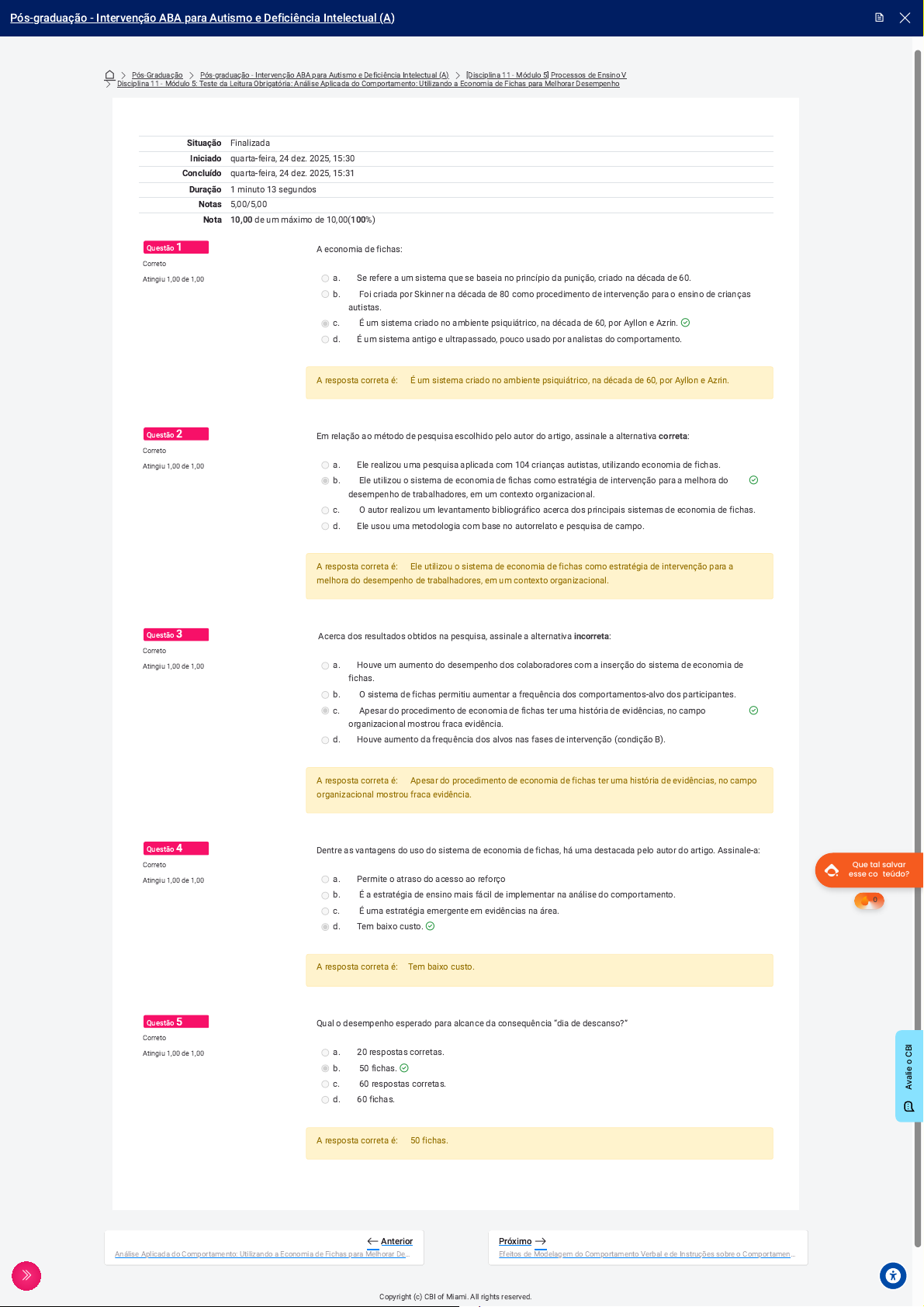 Copyright (c) CBI of Miami. All rights reserved. Pós-Graduação Pós-graduação - Intervenção ABA para Autismo e Deficiência Intelectual (A) [Disciplina 11 - Módulo 5] Processos de Ensino V Disciplina 11 - Módulo 5: Teste da Leitura Obrigatória: Análise Aplicada do Comportamento: Utilizando a Economia de Fichas para Melhorar Desempenho Questão 1 Correto Atingiu 1,00 de 1,00 Questão 2 Correto Atingiu 1,00 de 1,00 Questão 3 Correto Atingiu 1,00 de 1,00 Questão 4 Correto Atingiu 1,00 de 1,00 Questão 5 Correto Atingiu 1,00 de 1,00 Anterior Análise Aplicada do Comportamento: Utilizando a Economia de Fichas para Melhorar De… Próximo Efeitos de Modelagem do Comportamento Verbal e de Instruções sobre o Comportamen… A economia de fichas: a. Se refere a um sistema que se baseia no princípio da punição, criado na década de 60. b. Foi criada por Skinner na década de 80 como procedimento de intervenção para o ensino de crianças autistas. c. É um sistema criado no ambiente psiquiátrico, na década de 60, por Ayllon e Azrin. d. É um sistema antigo e ultrapassado, pouco usado por analistas do comportamento. A resposta correta é: É um sistema criado no ambiente psiquiátrico, na década de 60, por Ayllon e Azrin. Em relação ao método de pesquisa escolhido pelo autor do artigo, assinale a alternativa correta: a. Ele realizou uma pesquisa aplicada com 104 crianças autistas, utilizando economia de fichas. b. Ele utilizou o sistema de economia de fichas como estratégia de intervenção para a melhora do desempenho de trabalhadores, em um contexto organizacional. c. O autor realizou um levantamento bibliográfico acerca dos principais sistemas de economia de fichas. d. Ele usou uma metodologia com base no autorrelato e pesquisa de campo. A resposta correta é: Ele utilizou o sistema de economia de fichas como estratégia de intervenção para a melhora do desempenho de trabalhadores, em um contexto organizacional. Acerca dos resultados obtidos na pesquisa, assinale a alternativa incorreta: a. Houve um aumento do desempenho dos colaboradores com a inserção do sistema de economia de fichas. b. O sistema de fichas permitiu aumentar a frequência dos comportamentos-alvo dos participantes. c. Apesar do procedimento de economia de fichas ter uma história de evidências, no campo organizacional mostrou fraca evidência. d. Houve aumento da frequência dos alvos nas fases de intervenção (condição B). A resposta correta é: Apesar do procedimento de economia de fichas ter uma história de evidências, no campo organizacional mostrou fraca evidência. Dentre as vantagens do uso do sistema de economia de fichas, há uma destacada pelo autor do artigo. Assinale-a: a. Permite o atraso do acesso ao reforço b. É a estratégia de ensino mais fácil de implementar na análise do comportamento. c. É uma estratégia emergente em evidências na área. d. Tem baixo custo. A resposta correta é: Tem baixo custo. Qual o desempenho esperado para alcance da consequência “dia de descanso?” a. 20 respostas corretas. b. 50 fichas. c. 60 respostas corretas. d. 60 fichas. A resposta correta é: 50 fichas. Situação Finalizada Iniciado quarta-feira, 24 dez. 2025, 15:30 Concluído quarta-feira, 24 dez. 2025, 15:31 Duração 1 minuto 13 segundos Notas 5,00/5,00 Nota 10,00 de um máximo de 10,00(100%) Av al ie o C BI Pós-graduação - Intervenção ABA para Autismo e Deficiência Intelectual (A) Que tal salvar esse conteúdo? 0 https://cbialunos.com/course/index.php?categoryid=7 https://cbialunos.com/course/view.php?id=349 https://cbialunos.com/course/section.php?id=13244 https://cbialunos.com/mod/quiz/view.php?id=316206 https://cbialunos.com/my/courses.php https://cbialunos.com/mod/url/view.php?id=316161&forceview=1 https://cbialunos.com/mod/url/view.php?id=316162&forceview=1 https://cbialunos.com/course/view.php?id=349 https://cbialunos.com/course/view.php?id=349&mb2sct=43
