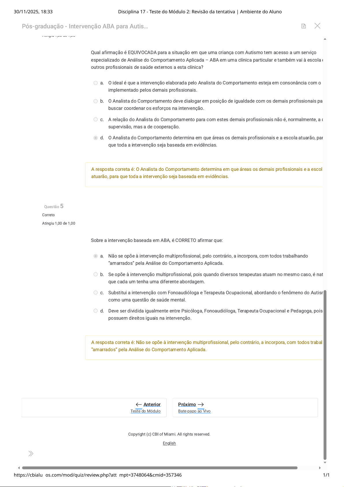 Copyright (c) CBI of Miami. All rights reserved. English Atingiu 1,00 de 1,00 Questão 5 Correto Atingiu 1,00 de 1,00 Anterior Teste do Módulo Próximo Bate-papo ao Vivo Qual afirmação é EQUIVOCADA para a situação em que uma criança com Autismo tem acesso a um serviço especializado de Análise do Comportamento Aplicada – ABA em uma clínica particular e também vai à escola e outros profissionais de saúde externos a esta clínica? a. O ideal é que a intervenção elaborada pelo Analista do Comportamento esteja em consonância com o implementado pelos demais profissionais. b. O Analista do Comportamento deve dialogar em posição de igualdade com os demais profissionais pa buscar coordenar os esforços na intervenção. c. A relação do Analista do Comportamento para com estes demais profissionais não é, normalmente, a d supervisão, mas a de cooperação. d. O Analista do Comportamento determina em que áreas os demais profissionais e a escola atuarão, par que toda a intervenção seja baseada em evidências. A resposta correta é: O Analista do Comportamento determina em que áreas os demais profissionais e a escol atuarão, para que toda a intervenção seja baseada em evidências. Sobre a intervenção baseada em ABA, é CORRETO afirmar que: a. Não se opõe à intervenção multiprofissional, pelo contrário, a incorpora, com todos trabalhando “amarrados” pela Análise do Comportamento Aplicada. b. Se opõe à intervenção multiprofissional, pois quando diversos terapeutas atuam no mesmo caso, é nat que cada um tenha uma diferente abordagem. c. Substitui a intervenção com Fonoaudióloga e Terapeuta Ocupacional, abordando o fenômeno do Autism como uma questão de saúde mental. d. Deve ser dividida igualmente entre Psicóloga, Fonoaudióloga, Terapeuta Ocupacional e Pedagoga, pois possuem direitos iguais na intervenção. A resposta correta é: Não se opõe à intervenção multiprofissional, pelo contrário, a incorpora, com todos trabal “amarrados” pela Análise do Comportamento Aplicada. Pós-graduação - Intervenção ABA para Autis… 30/11/2025, 18:33 Disciplina 17 - Teste do Módulo 2: Revisão da tentativa | Ambiente do Aluno https://cbialunos.com/mod/quiz/review.php?attempt=3748064&cmid=357346 1/1 https://cbialunos.com/mod/quiz/review.php?attempt=3748064&cmid=357346&lang=en https://cbialunos.com/course/view.php?id=349&mb2sct=64#module-357336 https://cbialunos.com/course/view.php?id=349&mb2sct=64#module-357337 https://cbialunos.com/course/view.php?id=349 https://cbialunos.com/course/view.php?id=349&mb2sct=64