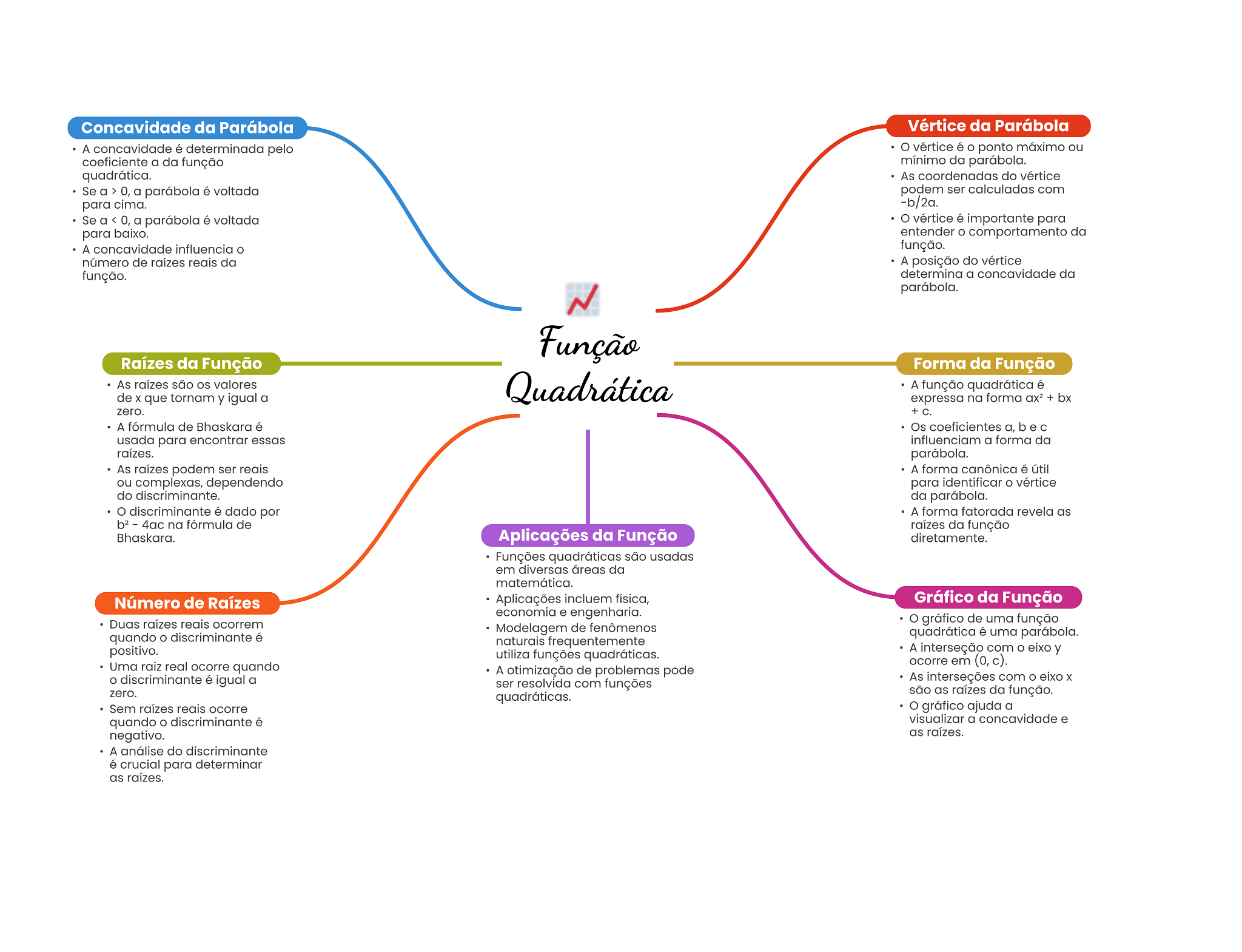 Concavidade da Parábola Vértice da Parábola A concavidade é determinada pelo vértice é ponto máximo ou coeficiente a da função mínimo da parábola. quadrática. As coordenadas do vértice Se a > 0, a parábola é voltada podem ser calculadas com para cima. -b/2a. Se a