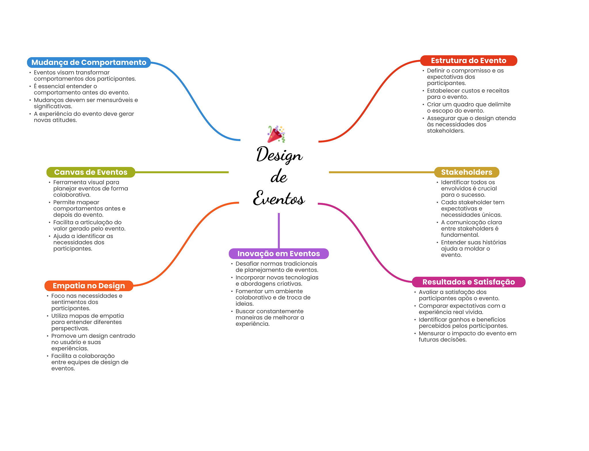 Mudança de Comportamento Estrutura do Evento Eventos visam transformar Definir compromisso e as comportamentos dos participantes. expectativas dos É essencial entender participantes. comportamento antes do evento. Estabelecer custos e receitas Mudanças devem ser mensuráveis e para evento. significativas. Criar um quadro que delimite A experiência do evento deve gerar escopo do evento. novas atitudes. Assegurar que design atenda às necessidades dos stakeholders. Design Canvas de Eventos de Stakeholders Ferramenta visual para Identificar todos os planejar eventos de forma envolvidos é crucial colaborativa. Eventos para sucesso. Permite mapear Cada stakeholder tem comportamentos antes e expectativas e depois do evento. necessidades únicas. Facilita a articulação do A comunicação clara valor gerado pelo evento. entre stakeholders é Ajuda a identificar as fundamental. necessidades dos Entender suas histórias participantes. ajuda a moldar Inovação em Eventos evento. Desafiar normas tradicionais de planejamento de eventos. Incorporar novas tecnologias Empatia no Design e abordagens criativas. Resultados e Satisfação Fomentar um ambiente Avaliar a satisfação dos Foco nas necessidades e colaborativo e de troca de participantes após O evento. sentimentos dos ideias. participantes. Comparar expectativas com a Buscar constantemente experiência real vivida. Utiliza mapas de empatia maneiras de melhorar a para entender diferentes Identificar ganhos e benefícios experiência. perspectivas. percebidos pelos participantes. Promove um design centrado Mensurar impacto do evento em no usuário e suas futuras decisões. experiências. Facilita a colaboração entre equipes de design de eventos.