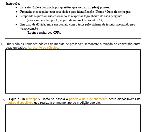 Instruções Esta atividade é composta por que somam 10 (dez) pontos. Preencha cabeçalho com seus dados para identificação (Nome / Data de entrega); Responda questionario colocando as respostas logo abaixo de cada pergunta (não serão aceitos prints, copias da internet ou uso de IA); Em caso de dúvida, entre em contato com tutor pelo sistema de tutoria, acessando pro- vasct.com.br (Login e senha: seu CPF). 1) Quais são as unidades de medida de pressão? Demonstre a relação de conversão entre duas unidades. Apresente cálculos. 2) O que é um termopar? Como se baseia 0 de funcionamento deste dispositivo? Cite outros dispositivos que realizam 0 mesmo tipo de medição que ele.