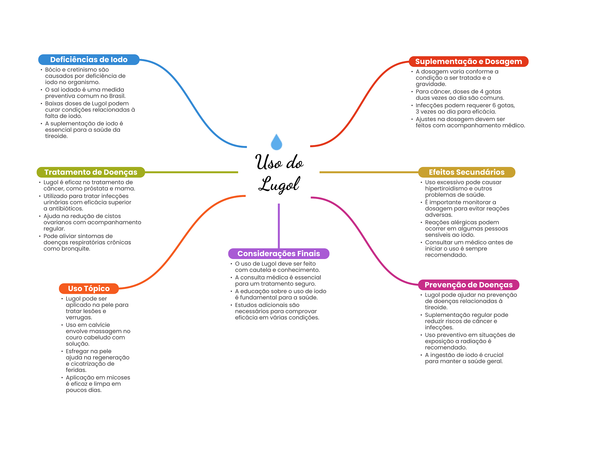 Deficiências de lodo Suplementação e Dosagem Bócio e cretinismo são A dosagem varia conforme a causados por deficiência de condição a ser tratada e a iodo no organismo. gravidade. sal iodado é uma medida Para câncer, doses de 4 gotas preventiva comum no Brasil. duas vezes ao dia são comuns. Baixas doses de Lugol podem Infecções podem requerer 6 gotas, curar condições relacionadas à 3 vezes ao dia para eficácia. falta de iodo. Ajustes na dosagem devem ser A suplementação de iodo é feitos com acompanhamento médico. essencial para a saúde da tireoide. Uso do Tratamento de Doenças Efeitos Secundários Lugol é eficaz no tratamento de câncer, como próstata e mama. Lugol Uso excessivo pode causar hipertiroidismo e outros Utilizado para tratar infecções problemas de saúde. urinárias com eficácia superior É importante monitorar a a antibióticos. dosagem para evitar reações Ajuda na redução de cistos adversas. ovarianos com acompanhamento Reações alérgicas podem regular. ocorrer em algumas pessoas Pode aliviar sintomas de sensíveis ao iodo. doenças respiratórias crônicas Consultar um médico antes de como bronquite. iniciar O uso é sempre Considerações Finais recomendado. uso de Lugol deve ser feito com cautela e conhecimento. A consulta médica é essencial para um tratamento seguro. Uso Tópico Prevenção de Doenças A educação sobre uso de iodo Lugol pode ser é fundamental para a saúde. Lugol pode ajudar na prevenção de doenças relacionadas à aplicado na pele para Estudos adicionais são tireoide. tratar lesões e necessários para comprovar verrugas. eficácia em várias condições. Suplementação regular pode reduzir riscos de câncer e Uso em calvície infecções. envolve massagem no couro cabeludo com Uso preventivo em situações de solução. exposição a radiação é recomendado. Esfregar na pele ajuda na regeneração A ingestão de iodo é crucial e cicatrização de para manter a saúde geral. feridas. Aplicação em micoses é eficaz e limpa em poucos dias.
