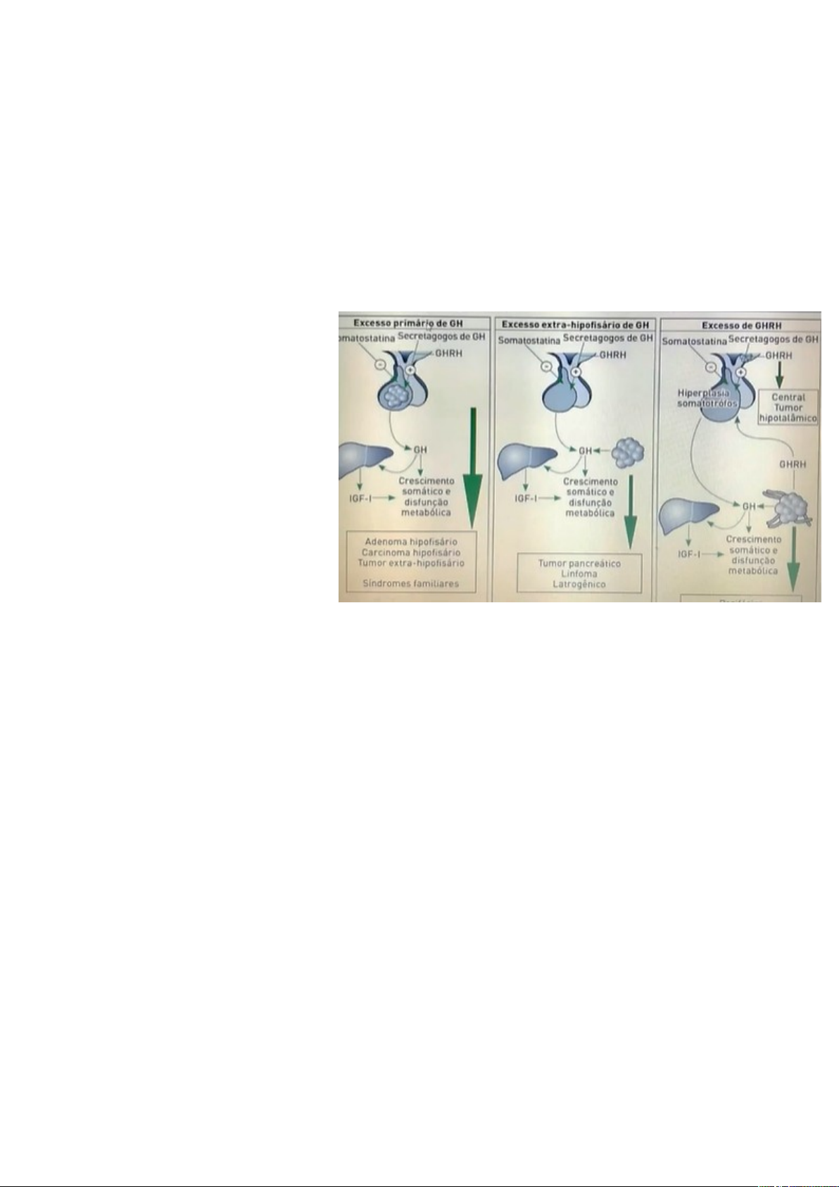 ACROMEGALIA Significado: aumento de extremidades Conceito: Síndrome clínica decorrente da secreção excessiva e persistente de GH Desordem debilitante crônica Resultando em: deformidades, incapacidade, redução da expectativa de vida Diagnóstico tardio (8-10 anos) devido a natureza insidiosa de crescimento desse tumor Etiologias por Local de Produção: 1. Excesso primário de GH Excesso de secreção de GH pelo hipotálamo -Adenoma hipofisário -Carcinoma hipofisário -Tumor extra-hipofisário -Síndromes familiares 2. Excesso Extra-Hipofisário Secreção de GH por outros locais, que não a hipófise -Tumor pancreático -Linfoma -Iatrogênico 3. Excesso de GHRH Por disfunção hipotalâmica -Tumor central do hipotálamo Etiologia por Secreção: 1. Produção Excessiva de GH (>95%) -Adenoma puro de células somatotróficas (maioria) -Adenoma de células mistas (GH e PRL) -Adenoma de células mamossomatotróficos (GH e PRL) -Adenoma plurihormonal (GH, PRL, ACTH e TSH) -Carcinoma de células somatotróficas (raro) -tumores extra hipofisários produtores de GH (raro) 2. Produção Excessiva de GHRH (5%) Eutrópica (hamartoma, coristoma, glioma e gangliocitoma hipotalâmico) Ectópica: -Carcinoides: brônquios, gastrointestinal/pâncreas, indeterminado -Tumor de ilhotas pancreáticas -Carcinoma pulmonar de células pequenas -Adenoma adrenal/feocromocitoma Mais frequente: Adenoma hipofisário secretor de GH (>95%) Puro (células puras de GH – 60%) ou Misto (GH e PRL) Esporádico: mais frequente Familiar: -NEM1 (adenoma de paratireoide, tumores de ilhotas pancreáticas e adenomas hipofisários) -Complexo de Carney (mixomas, manchas cutâneas pigmentadas e tumores de suprarrenal/ testiculares/ hipofisários) Epidemiologia: Rara (30-70/1000.000) 7/6773 adultos nos quais realizaram IGF1 alterado, com chance de acromegalia Manifestação 40-50 anos Pacientes morrem por causas relacionadas a acromegalia sem nunca ter feito o diagnostico Frequência igual para homens e mulheres Aumento de mortalidade em 2-3x em relação a população geral (pode ser revertido se diagnosticado e tratado em tempo) Controle da Secreção de GH: Secretado pelas células somatotróficas Sob controle de: -GHRH -Inibidor da secreção: Somatostatina GH estimula a geração de IGF-1 (hepática e tissular) Ações do GH: -Promove o crescimento linear e tecidual (maior parte mediada pelo IGF-1) -Metabolismo carboidratos (aumenta gliconeogênese > menor oxidação e captação de glicose pelos tecidos periféricos > resistência insulínica com hiperinsulinismo secundário): leva a DM Manifestações Clínicas: Efeito de Massa: 80-90% são macroadenomas ao diagnostico (60% cefaeia, 10% sintomas visuais e alterações de pares cranianos, sintomas associados ao hipopituarismo pela compressão de haste hipofisária) Somáticas: Estimulação de crescimento em muitos tecidos como: pele, tecido conjuntivo, cartilagem, vísceras, tecidos epiteliais Lembrar da cardiomegalia Metabólicos: Retenção de nitrogênio Antagonismo insulínico Lipólise Gigantismo: Secundário a um adenoma esporádico ou familiar, surgindo na infância ou adolescência Antes do fechamento das epífises Diferença entre acromegalia e gigantismo: gigantismo ocorre mais precocemente, antes do fechamento das epífises Modificações fisionômicas e musculoesqueléticas: Proeminência frontal Alargamento nariz Aumento dos arcos zigomáticos Crescimento mandíbula com prognatismo Macroglossia Crescimento orelhas Aumento mãos Afastamento dentário pelo crescimento da mandíbula (diastema) Abaulamento orbital Clínicas: Galactorreia Sudorese Osteoartrite Síndrome do túnel do carpo Cardio/hepato/nefro/esplenomegalia Hipertensão Complicações da Acromegalia: Complicações Cardiovasculares: Responsável por 60% das mortes -HAS (18-60%) -Hipertrofia de VE (50%): tanto pela HAS quanto pela hipertrofia cardíaca -Aterosclerose acelerada: por alterações metabólicas -Arritmias cardíacas: alteração de válvula cardíaca, grande responsável por óbitos também -Cardiomegalia Complicações Respiratórias: Apneia do Sono (80%) Por aumento de estruturas de toda a região do pescoço Mais comum no sexo masculino 5-10 episódios de apneia ou hipopneia (10minutos/hora de sono noturno) Favorece aparecimento de HAS, arritmias (bradicardia sinusal, taquicardia ventricular e assistolia), doença coronariana e AVC Principais fatores: aumento de laringe e faringe, macroglossia, obesidade e hipertrofia pulmonar Complicações Endócrinas: Hiperprolactinemia: Com ou sem galactorreia Hipopituarismo: Compressão do tumor sobre o tecido hipofisário normal ou adjacente ou sobre a haste Amenorreia ou disfunção erétil Tanto pelo PRL quando pela compressão tumoral das células secretoras Insuficiência adrenal Complicações Metabólicas: Efeitos antiinsulínicos: Resistência insulínica, DM Dislipidemia com padrão aterogênico: Diminuição HDL, hipertrigliceridemia, hipercalcemia, hipercalciúria, hiperfosfatemia Complicações Neoplásicas: Maior incidência de neoplasia de colon, esôfago, estomago e melanoma em homens Em mulheres maior risco de neoplasia de tireoide e leiomioma Risco aumentado de pólipos colonicos adenomatosos em homens, >50 anos, presença de 3 ou mais acrocordons – fazer colonoscopia Frequência das Manifestações na Acromegalia: Prognóstico: Hipersecreção de GH mal controlada de longa duração: -Mortalidade 2-3x maior do que na população geral -Diminuição 5-10x na expectativa de vida -Pode ser revertido pela obtenção de níveis séricos de GH pós tratamento 2ng/ml no teste Determinar fonte do GH: RM de hipófise com contraste >95% possui adenoma secretor de GH Avalia: tamanho, magnitude da extensão extra-selar e relação com quiasma optico RX Crânio: Aumento de sela Duplo assoalho selar Erosão das clinóides Alargamento dos seios da face Protusão de mandíbula Tratamento: Metas: -Controle dos efeitos de massa tumoral (m
