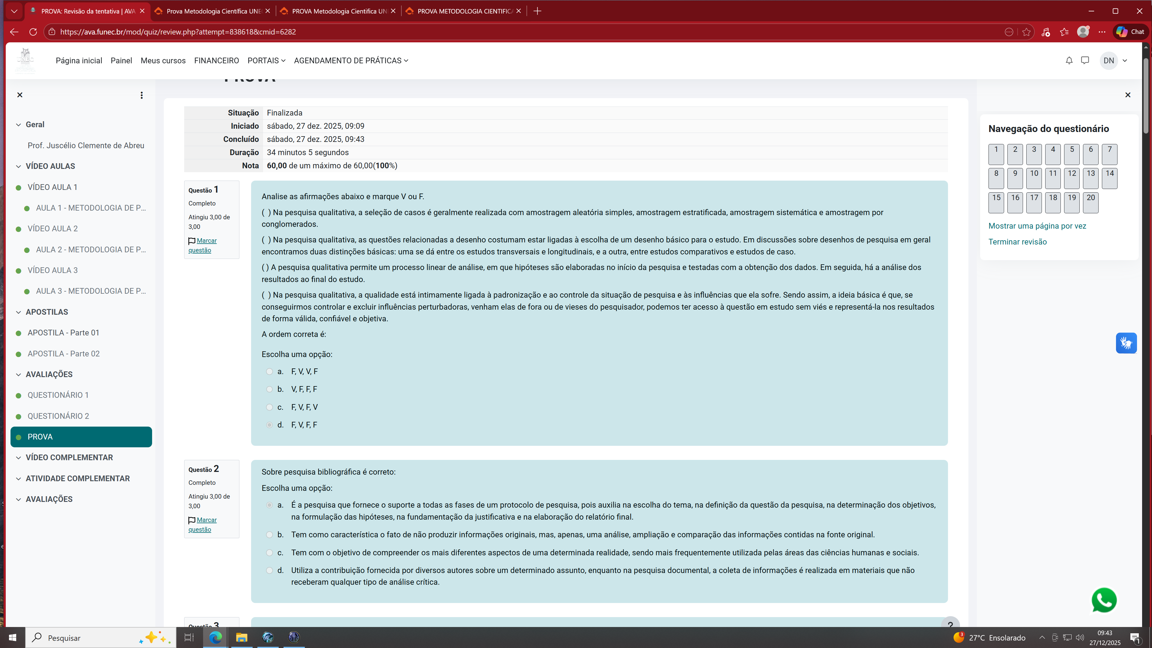 PROVA: Revisão da tentativa AVA Prova Metodologia Científica UNE PROVA Metodologia Cientifica UN PROVA METODOLOGIA CIENTIFIC + Chat Página inicial Painel Meus cursos FINANCEIRO PORTAIS AGENDAMENTO DE PRÁTICAS DN : Situação Finalizada Geral Iniciado sábado, 27 dez. 2025, 09:09 Navegação do questionário Concluído sábado, 27 dez. 2025, 09:43 Prof. Juscélio Clemente de Abreu 1 Duração 2 3 4 34 minutos 5 segundos 5 6 7 VÍDEO AULAS Nota 60,00 de um máximo de 60,00(100%) 8 9 10 11 12 13 14 VÍDEO AULA 1 Questão 1 Analise as afirmações abaixo e marque V ou F. 15 16 17 18 19 20 Completo AULA 1 METODOLOGIA DE Na pesquisa qualitativa, a seleção de casos é geralmente realizada com amostragem aleatória simples, amostragem estratificada, amostragem sistemática e amostragem por Atingiu 3,00 de VÍDEO AULA 2 3,00 conglomerados. Mostrar uma página por vez Marcar Na pesquisa qualitativa, as questões relacionadas a desenho costumam estar ligadas à escolha de um desenho básico para estudo. Em discussões sobre desenhos de pesquisa em geral Terminar revisão AULA 2 METODOLOGIA DE questão encontramos duas distinções básicas: uma se dá entre estudos transversais e longitudinais, e a outra, entre estudos comparativos e estudos de caso. VÍDEO AULA 3 () A pesquisa qualitativa permite um processo linear de análise, em que hipóteses são elaboradas no início da pesquisa e testadas com a obtenção dos dados. Em seguida, há a análise dos resultados ao final do estudo. AULA 3 METODOLOGIA DE Na pesquisa qualitativa, a qualidade está intimamente ligada à padronização e ao controle da situação de pesquisa e às influências que ela sofre. Sendo assim, a ideia básica é que, se conseguirmos controlar e excluir influências perturbadoras, venham elas de fora ou de vieses do pesquisador, podemos ter acesso à questão em estudo sem viés e representá-la nos resultados APOSTILAS de forma válida, confiável e objetiva. APOSTILA Parte 01 A ordem correta é: APOSTILA Parte 02 Escolha uma opção: AVALIAÇÕES a. F,V,V,F b. QUESTIONÁRIO 1 F,V,F,V QUESTIONÁRIO 2 d. PROVA VÍDEO COMPLEMENTAR Questão 2 Sobre pesquisa bibliográfica é correto: ATIVIDADE COMPLEMENTAR Completo Escolha uma opção: AVALIAÇÕES Atingiu 3,00 de 3,00 a. É a pesquisa que fornece suporte a todas as fases de um protocolo de pesquisa, pois auxilia na escolha do tema, na definição da questão da pesquisa, na determinação dos objetivos, Marcar na formulação das hipóteses, na fundamentação da justificativa e na elaboração do relatório final. questão b. Tem como característica fato de não produzir informações originais, mas, apenas, uma análise, ampliação e comparação das informações contidas na fonte original. Tem com objetivo de compreender os mais diferentes aspectos de uma determinada realidade, sendo mais frequentemente utilizada pelas áreas das ciências humanas e sociais. d. Utiliza a contribuição fornecida por diversos autores sobre um determinado assunto, enquanto na pesquisa documental, a coleta de informações é realizada em materiais que não receberam qualquer tipo de análise crítica. 09:43 Pesquisar 27°C Ensolarado 27/12/2025