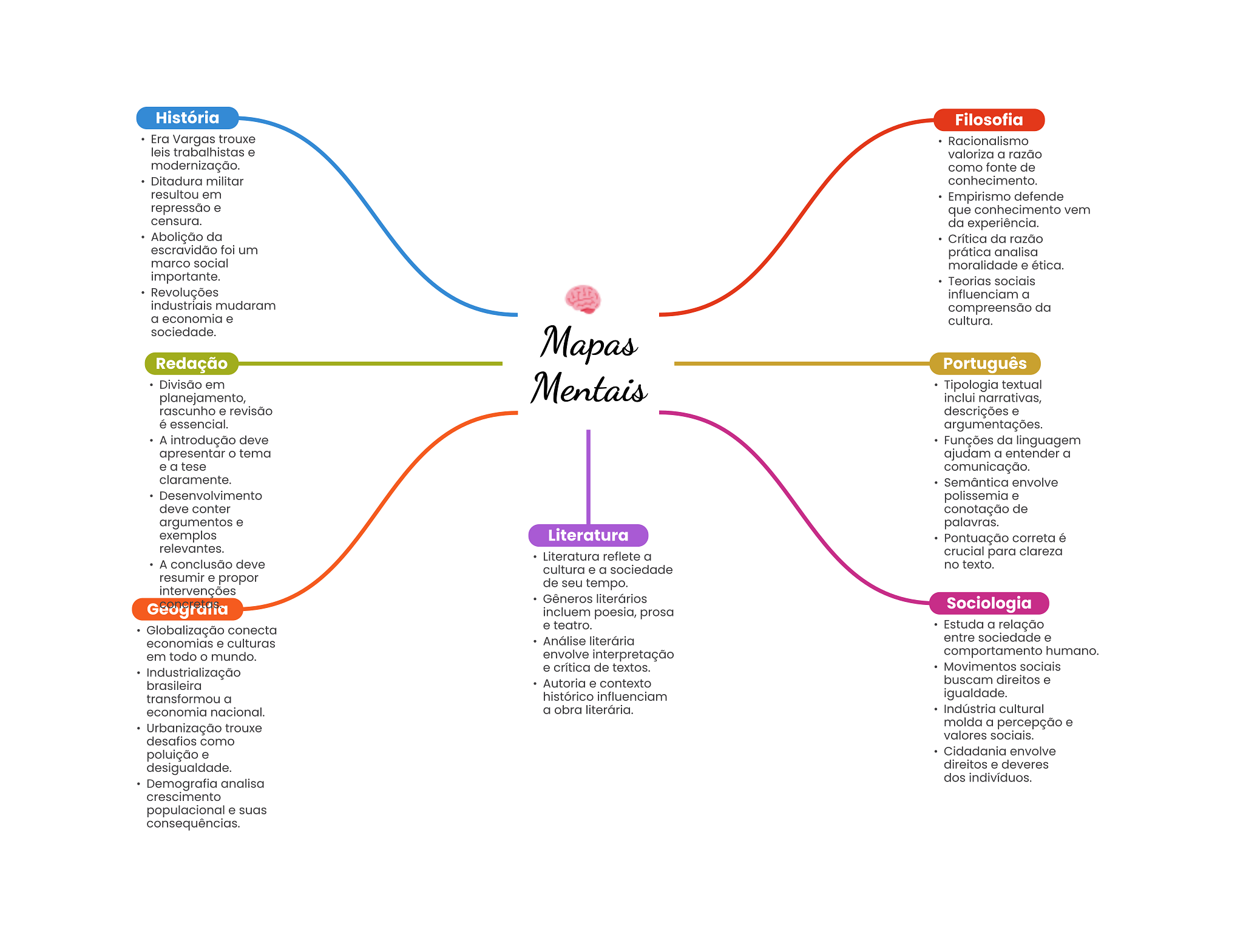 História Filosofia Era Vargas trouxe Racionalismo leis trabalhistas e valoriza a razão modernização. como fonte de Ditadura militar conhecimento. resultou em Empirismo defende repressão e que conhecimento vem censura. da experiência. Abolição da Crítica da razão escravidão foi um prática analisa marco social moralidade e ética. importante. Teorias sociais Revoluções influenciam a industriais mudaram compreensão da a economia e cultura. sociedade. Mapas Redação Português Divisão em Mentais Tipologia textual planejamento, inclui narrativas, rascunho e revisão descrições e é essencial. argumentações. A introdução deve Funções da linguagem apresentar tema ajudam a entender a e a tese comunicação. claramente. Semântica envolve Desenvolvimento polissemia e deve conter conotação de argumentos e palavras. exemplos Literatura Pontuação correta é relevantes. Literatura reflete a crucial para clareza A conclusão deve cultura e a sociedade no texto. resumir e propor de seu tempo. intervenções Gêneros literários Sociologia incluem poesia, prosa Globalização conecta e teatro. Estuda a relação Análise literária entre sociedade e economias e culturas em todo mundo. envolve interpretação comportamento humano. e crítica de textos. Movimentos sociais Industrialização brasileira Autoria e contexto buscam direitos e transformou a histórico influenciam igualdade. economia nacional. a obra literária. Indústria cultural Urbanização trouxe molda a percepção e valores sociais. desafios como poluição e Cidadania envolve desigualdade. direitos e deveres dos indivíduos. Demografia analisa crescimento populacional e suas consequências.