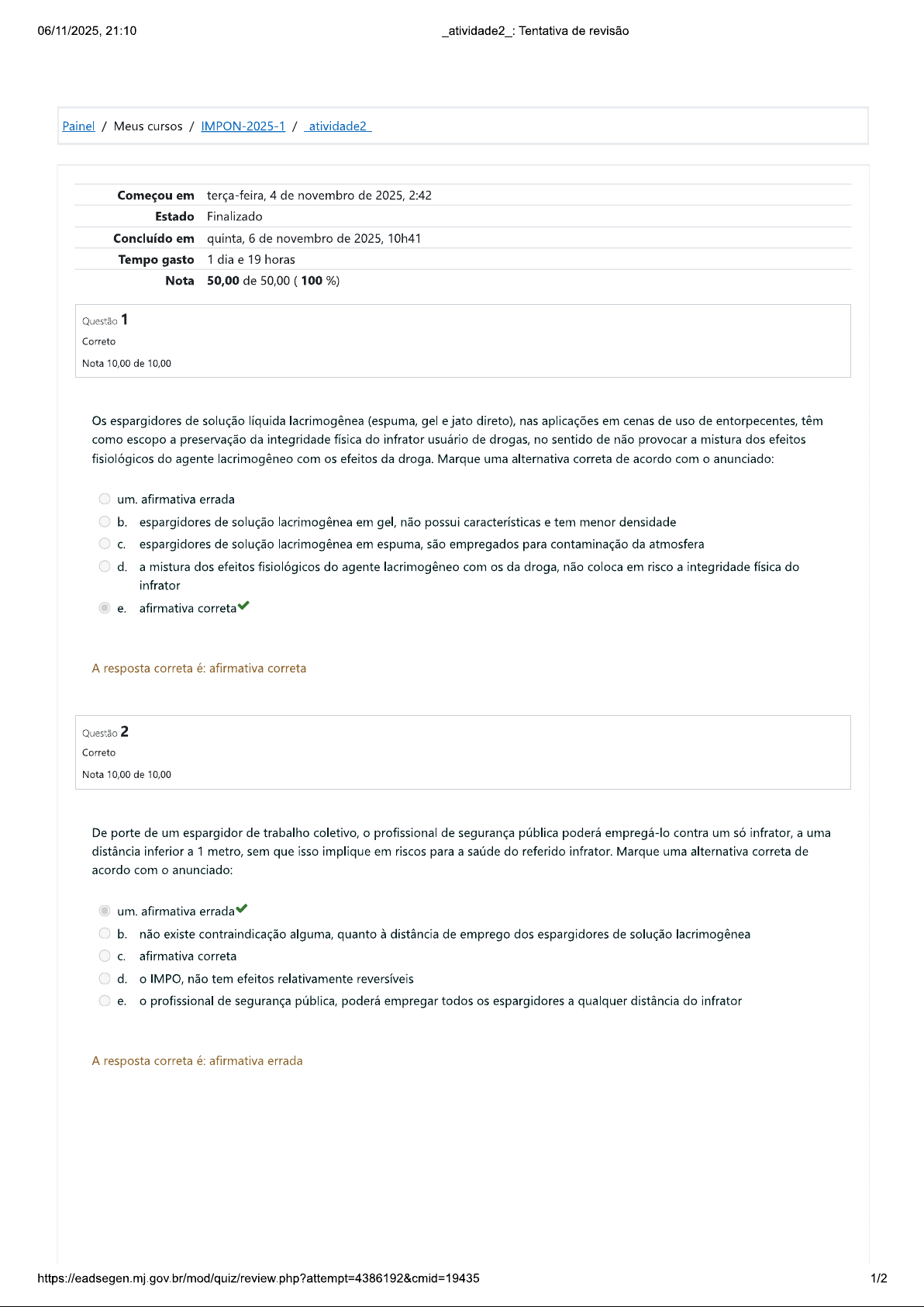 06/11/2025, 21:10 atividade2 Tentativa de revisão Painel / Meus cursos / IMPON-2025-1 / atividade2 Começou em terça-feira, 4 de novembro de 2025, 2:42 Estado Finalizado Concluído em quinta, 6 de novembro de 2025, 10h41 Tempo gasto 1 dia e 19 horas Nota 50,00 de 50,00 Questão 1 Correto Nota 10,00 de 10,00 Os espargidores de solução líquida lacrimogênea (espuma, gel e jato direto), nas aplicações em cenas de uso de entorpecentes, têm como escopo a preservação da integridade física do infrator usuário de drogas, no sentido de não provocar a mistura dos efeitos fisiológicos do agente lacrimogêneo com os efeitos da droga. Marque uma alternativa correta de acordo com o anunciado: um. afirmativa errada b. espargidores de solução lacrimogênea em gel, não possui características e tem menor densidade C. espargidores de solução lacrimogênea em espuma, são empregados para contaminação da atmosfera d. a mistura dos efeitos fisiológicos do agente lacrimogêneo com os da droga, não coloca em risco a integridade física do infrator e. afirmativa correta A resposta correta é: afirmativa correta Questão 2 Correto Nota 10,00 de 10,00 De porte de um espargidor de trabalho coletivo, o profissional de segurança pública poderá empregá-lo contra um só infrator, a uma distância inferior a 1 metro, sem que isso implique em riscos para a saúde do referido infrator. Marque uma alternativa correta de acordo com o anunciado: um. afirmativa errada b. não existe contraindicação alguma, quanto à distância de emprego dos espargidores de solução lacrimogênea C. afirmativa correta d. IMPO, não tem efeitos relativamente reversíveis e. profissional de segurança pública, poderá empregar todos os espargidores a qualquer distância do infrator A resposta correta é: afirmativa errada 1/206/11/2025, 21:10 _atividade2_ Tentativa de revisão Questão 3 Correto Nota 10,00 de 10,00 Ao utilizar o espargidor de emprego individual, o acionamento do instrumento poderá ser com o dedo indicador, no entanto, recomenda-se que o pressionamento do botão atuador, seja realizado com o dedo de confiança. Desta forma, a utilização do espargidor será mais segura e versátil. Marque uma alternativa correta de acordo com o anunciado: um. não há necessidade de reuniões, pois o alvo, nunca irá se movimentar b. algum dos dedos C. afirmativa errada d. não há necessidade de acionar o botão atuador, pois ele é automático e. afirmativa correta A resposta correta é: afirmativa errada Questão 4 Correto Nota 10,00 de 10,00 agente lacrimogêneo Pimenta, detém componente ativo das plantas do gênero Capsicum. É amplamente utilizado em espargidores de solução lacrimogênea fabricados no País. Marque uma alternativa correta de acordo com anunciado: um. CS é o componente ativo das plantas do gênero Capsicum b. significa: Ortoclorobenzilmalonitrila C. afirmativa errada d. afirmativa correta e. as alternativas "a" e "b" são corretas A resposta correta é: afirmativa correta Questão 5 Correto Nota 10,00 de 10,00 Os espargidores de emprego individual são aqueles que produzem jatos com alcance médio de 1,0 m (um metro), envasados em recipientes de 900g (novecentos gramas) de peso líquido de produto ativo. Marque uma alternativa correta de acordo com anunciado: um. produção de jatos com alcance médio de 8m (oito metros) b. afirmativa correta C. afirmativa errada d. produção de jatos com alcance médio de 5m (cinco metros) e. produção de jatos com alcance médio de 3m (três metros), envasados em recipientes de 500g A resposta correta é: afirmativa errada 2/2