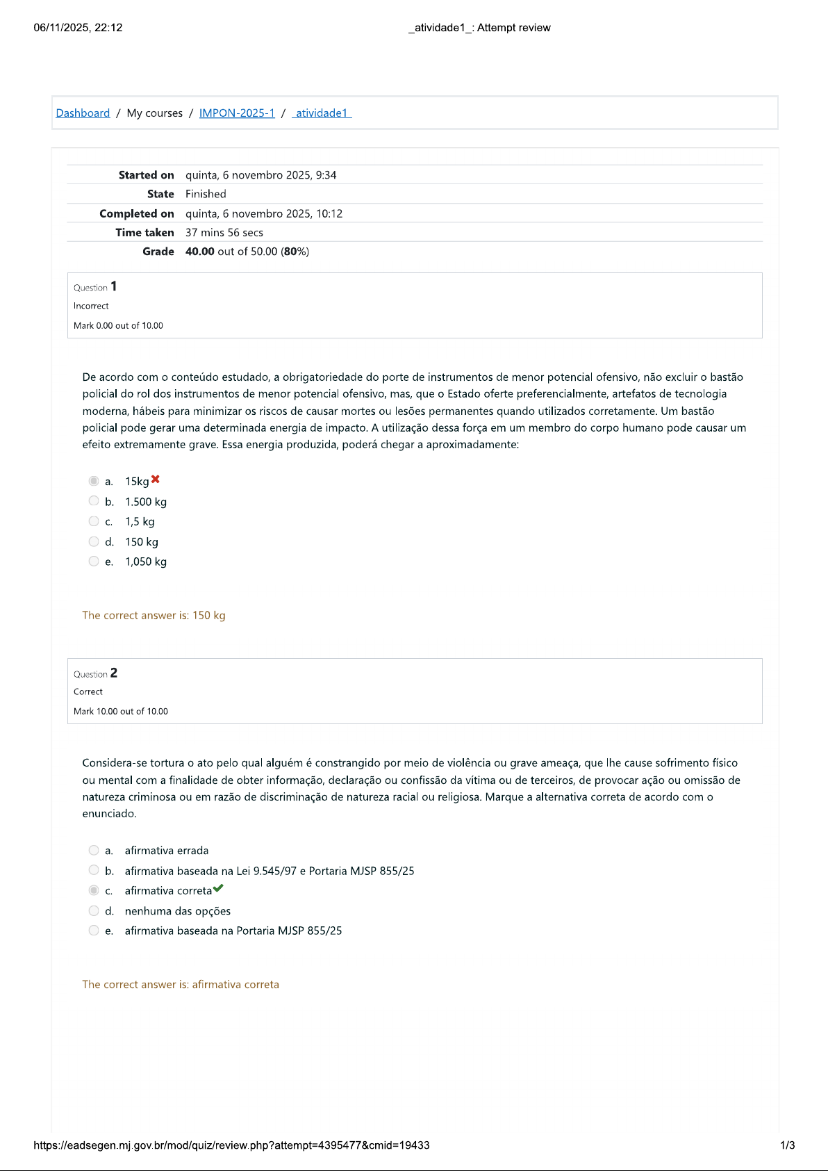 06/11/2025, 22:12 atividade1 Attempt review Dashboard / My courses / IMPON-2025-1 / atividade1 Started on quinta, 6 novembro 2025, 9:34 State Finished Completed on quinta, 6 novembro 2025, 10:12 Time taken 37 mins 56 secs Grade 40.00 out of 50.00 (80%) Question 1 Incorrect Mark 0.00 out of 10.00 De acordo com conteúdo estudado, a obrigatoriedade do porte de instrumentos de menor potencial ofensivo, não excluir bastão policial do rol dos instrumentos de menor potencial ofensivo, mas, que Estado oferte preferencialmente, artefatos de tecnologia moderna, hábeis para minimizar os riscos de causar mortes ou lesões permanentes quando utilizados corretamente. Um bastão policial pode gerar uma determinada energia de impacto. A utilização dessa força em um membro do corpo humano pode causar um efeito extremamente grave. Essa energia produzida, poderá chegar a aproximadamente: a. 15kg b. 1.500 kg C. 1,5 kg d. 150 kg e. 1,050 kg The correct answer is: 150 kg Question 2 Correct Mark 10.00 out of 10.00 Considera-se tortura o ato pelo qual alguém é constrangido por meio de violência ou grave ameaça, que lhe cause sofrimento físico ou mental com a finalidade de obter informação, declaração ou confissão da vítima ou de terceiros, de provocar ação ou omissão de natureza criminosa ou em razão de discriminação de natureza racial ou religiosa. Marque a alternativa correta de acordo com enunciado. a. afirmativa errada b. afirmativa baseada na Lei 9.545/97 e Portaria MJSP 855/25 C. afirmativa correta d. nenhuma das opções e. afirmativa baseada na Portaria MJSP 855/25 The correct answer is: afirmativa correta 1/306/11/2025, 22:12 atividade1 Attempt review Question 3 Correct Mark 10.00 out of 10.00 De acordo com os estudos voltados aos Aspectos Legais sobre o Uso dos Instrumentos de Menor Potencial Ofensivo, associe a primeira coluna de acordo com a segunda. ( ) Regulariza o uso dos instrumentos de menor potencial ofensivo pelos agentes de segurança pública, em todo o território nacional. 1 Portaria MJSP 855/25 Regulamenta o Decreto n° 12.341, de 23 de dezembro de 2024, e estabelece diretrizes sobre uso da força pelos profissionais de segurança pública. 2 - Lei 13.060/14 A referida Lei prevê como pena para tais crimes: reclusão, perda do cargo, função ou 3 Lei 9.455/97 emprego público e a interdição para exercício dos mesmos pelo dobro do prazo da pena aplicada. 4 Lei 13.869/19 É aplicada a qualquer ocupante de cargo, emprego ou função pública de natureza civil ou militar, mesmo que esteja exercendo a atividade transitoriamente e sem remuneração. a. 2,1,4,3 b. C. 4,2,1,3 d. 1,3,4,2 e. 3,1,4,2 The correct answer is: 2, 1, 3, 4 Question 4 Correct Mark 10.00 out of 10.00 A Portaria MJSP n° 855/25, disciplina o uso dos instrumentos de menor potencial ofensivo pelos profissionais de segurança pública, em todo território nacional. Marque a alternativa correta de acordo com enunciado. a. afirmativa errada b. afirmativa correta não estabelece Diretrizes d. A Lei 13.060/14, estabelece diretrizes sobre uso dos instrumentos de menor potencial ofensivo pelos profissionais de segurança pública, em todo o território nacional. e. nenhuma das opções The correct answer is: afirmativa errada 2/306/11/2025, 22:12 atividade1 Attempt review Question 5 Correct Mark 10.00 out of 10.00 De acordo com os conceitos apresentados e, dentro do contexto do emprego de IMPO, associe a segunda coluna de acordo coma primeira: A - Tirar ou perder a energia física ou a saúde; enfraquecer. Quando do emprego de certos instrumentos de menor potencial ofensivo seus efeitos baseiam-se principalmente na dor, no desconforto ou na inquietação, reduzindo a capacidade agressiva do indivíduo. Conter ( ) Pode ser interpretado como a limitação da expansão individual ou coletiva; a não Debilitar continuidade de determinada ação; impedir de prosseguir; controlar a ameaça. Incapacitar É a ação direta no sistema nervoso, causando reações involuntárias do organismo, fazendo que a pessoa perca a possibilidade de controle sobre seus atos cessando de imediato a ação antissocial. a. b. C. A,B,C d. e. The correct answer is: 3/3