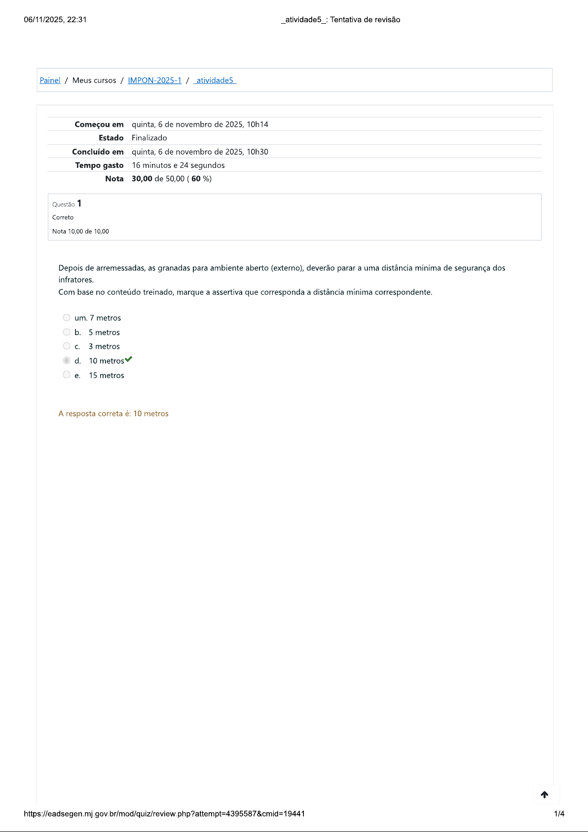 06/11/2025, 22:31 atividade5 Tentativa de revisão Painel / Meus cursos / IMPON-2025-1 / atividade5 Começou em quinta, 6 de novembro de 2025, 10h14 Estado Finalizado Concluído em quinta, 6 de novembro de 2025, 10h30 Tempo gasto 16 minutos e 24 segundos Nota 30,00 de 50,00 Questão 1 Correto Nota 10,00 de 10,00 Depois de arremessadas, as granadas para ambiente aberto (externo), deverão parar a uma distância mínima de segurança dos infratores. Com base no conteúdo treinado, marque a assertiva que corresponda a distância mínima correspondente. um. 7 metros b. 5 metros 3 metros d. 10 metros e. 15 metros A resposta correta é: 10 metros 1/406/11/2025, 22:31 _atividade5_ Tentativa de revisão Questão 2 Incorreto Nota 0,00 de 10,00 Marque com (V) para as alternativas verdadeiras e com (F) para as alternativas falsas. Certo profissional de segurança pública ao assumir o seu turno toma conhecimento de uma Ordem de Serviço para realizar policiamento próximo a uma área ocupada por posseiros. Dentre outros materiais e equipamentos, esse profissional acondiciona algumas granadas explosivas em bolsos de seu colete tático. fato de o profissional acondicionar granadas explosivas em bolsos de colete não envolve risco algum, pois essas granadas só poderão ser acionadas caso haja o isolamento da argola junto com grampo de segurança. () Para evitar a invasão de um prédio público, a equipe alfa de uma força de segurança pública utiliza granada explosiva para ambiente aberto logo em frente à entrada do prédio. A granada em questão parou exatamente a 2 metros dos invasores, evitando a entrada destes. Desta forma, a intervenção foi bem sucedida, principalmente em relação à aparência técnica do emprego da granada. As granadas explosivas para ambiente fechado, apesar de sua indicação específica de emprego em ambientes confinados, podem ser utilizadas em ambiente aberto como uma alternativa tática ao uso das granadas para ambientes abertos quando a distância para o emprego destas não é suficientemente segura. As granadas explosivas para ambiente fechado possuem um tempo de atraso de 1,5 segundo. As granadas explosivas para ambiente aberto, comercializadas no mercado nacional, possuem um tempo de retardo de 3,0 segundos um.V,V,F,F,V b. F,F,V,V,V V,F,V,F,V d. e. A resposta correta 2/406/11/2025, 22:31 _atividade5_ Tentativa de revisão Questão 3 Correto Nota 10,00 de 10,00 Classifique a primeira coluna de acordo com a segunda coluna: () consiste na passagem direta de uma substância do estado sólido, para estado gasoso e 1 Granadas não explosivas vice-versa sem passar pelo estado líquido. lacrimogêneas () emitem agente químico sem efeito fisiológico lacrimogêneo, produzindo somente uma 2 Granadas não explosivas fumaça colorida. fumígenas () período em que a granada leva, para emitir todo seu agente químico na atmosfera. 3 Tempo de emissão () utilizam a queima do agente químico lacrimogêneo, emitindo-o na atmosfera através do 4 Sublimação vapor. um. 4, 2, 1, 3 b. 1,4,2,3 2,4,1,3 d. 3,4,2,1 e. 4, 2, 3, A resposta correta é: 4,2,3,1 Questão 4 Correto Nota 10,00 de 10,00 As granadas explosivas para ambiente fechado (indoor) comercializadas no mercado nacional, possuem um tempo de retardo diferente das projetadas para ambiente aberto. Esse tempo permite uma ação mais rápida por parte dos operadores no caso de tomada de ambiente, como conhecidas "invasões táticas". Com base no conteúdo treinado, esse tempo de retardo é de: um. 1,5 segundos b. 1,0 segundo C. 3,0 segundos d. 2,0 segundos e. 2,5 segundos A resposta correta é: 1,5 segundos 3/406/11/2025, 22:31 atividade5 Tentativa de revisão Questão 5 Incorreto Nota 0,00 de 10,00 Como as granadas não são explosivas, geram grandes temperaturas, por isso não se recomenda o seu uso em ambientes potencialmente inflamáveis ou explosivos. Identifique nas assertivas que segue, uma opção que não apresenta exclusivamente essas atmosferas. um. Refinaria, distribuidoras de combustível, aterro sanitário. b. Depósito de botijões GLP (gás de cozinha), terreno com vegetação seca, posto de combustível. C. certamente das alternativas d. Posto de combustível, Aterro sanitário, refinarias. e. Refinaria, terreno com vegetação seca, posto de combustível. A resposta correta é: nenhuma das alternativas 4/4