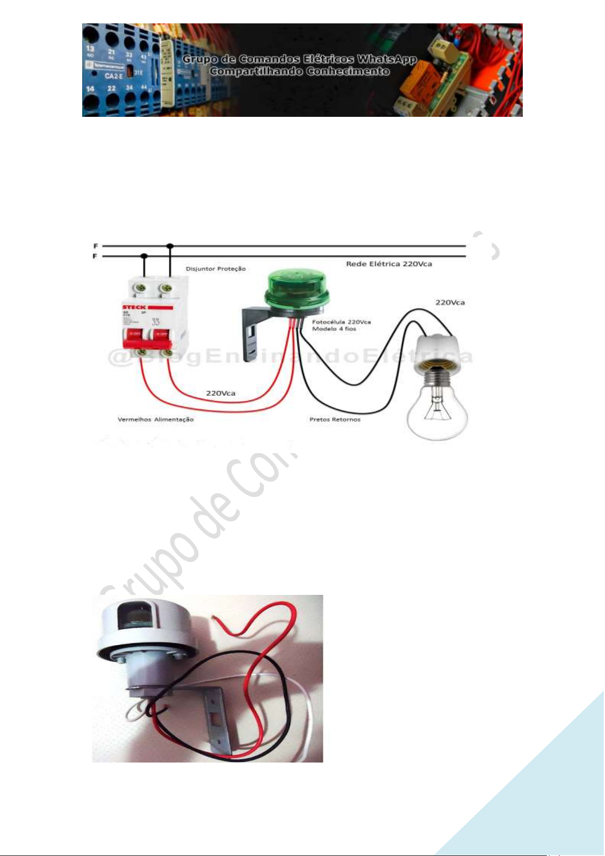 1 Como ligar fotocélulas 220 volts e 127 volts Vamos ensinar como você pode ligar sua fotocélula ou relé fotoelétrico como alguns chamam no mercado a alguns modelos de fotocélula de 3 fios e 4 fios vamos mostrar abaixo a ligação de uma fotocélula de 4 fios em rede 220V para lâmpadas de 220V. Vamos observar o primeiro esquema elétrico em 220 volts fotocélula de 4 fios. Esse modelo de fotocélula de 4 fios, você precisa alimentar ela conforme exemplo acima, 2 fios vermelho recebe 220 volts ou 2 fios preto é o retorno para a lâmpada ou as lâmpadas, lembre- se essas fotocélula suporta até 1000 watts de potência então os conjuntos de lâmpadas ligadas no circuito não pode ultrapassar o limite que a fotocélula suporta. Vamos agora pessoal mostrar como você pode ligar aquelas fotocélulas de 3 fios elas podem ser em 220 volts ou 127 volts, vamos ver um exemplo da ligação em 220 volts para as lâmpadas em 220 volts. 2 Observe abaixo o diagrama de ligação em rede de 220volts para acionar lâmpadas em 220 volts. Repare que esse modelo de fotocélula é com base onde a troca se caso precisar você só retira a "cabeça" e substitui a mesma, pois a base de fixação sempre será a mesma, a ordem de ligação é a do esquema conforme instruções do fabricante Preto fase, vermelho retorno, branco fase/retorno. Lembre-se pessoal desligue a rede elétrica antes de fazer a manutenção ou instalação e nunca ligue a fotocélula e os circuitos das lâmpadas sem proteção de disjuntores. Caso a soma de cargas das lâmpadas forem ultrapassar os 1000 watts você rede acionar a carga das lâmpadas através de um contator.