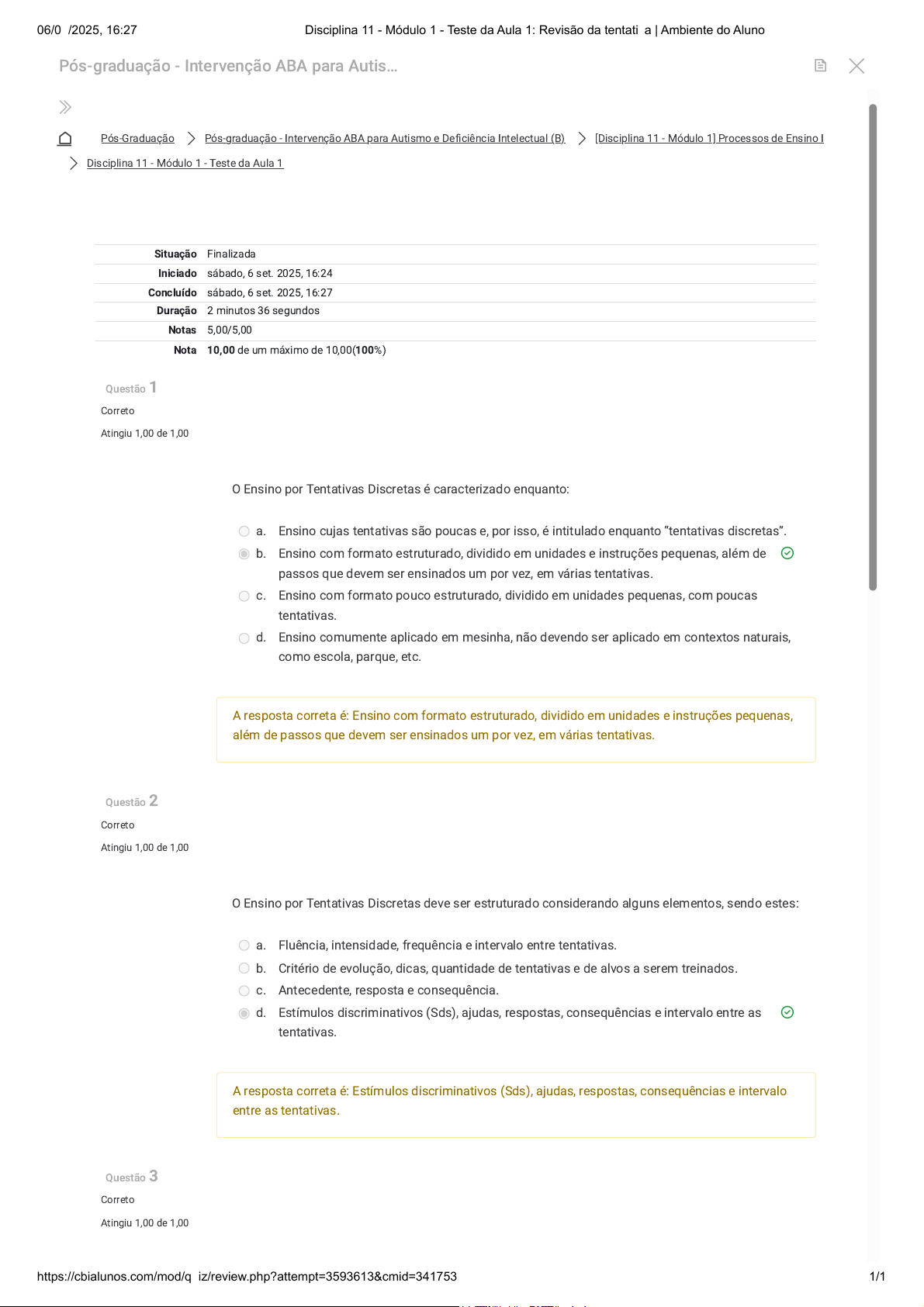 Pós-Graduação Pós-graduação - Intervenção ABA para Autismo e Deficiência Intelectual (B) [Disciplina 11 - Módulo 1] Processos de Ensino I Disciplina 11 - Módulo 1 - Teste da Aula 1 Questão 1 Correto Atingiu 1,00 de 1,00 Questão 2 Correto Atingiu 1,00 de 1,00 Questão 3 Correto Atingiu 1,00 de 1,00 O Ensino por Tentativas Discretas é caracterizado enquanto: a. Ensino cujas tentativas são poucas e, por isso, é intitulado enquanto “tentativas discretas”. b. Ensino com formato estruturado, dividido em unidades e instruções pequenas, além de passos que devem ser ensinados um por vez, em várias tentativas. c. Ensino com formato pouco estruturado, dividido em unidades pequenas, com poucas tentativas. d. Ensino comumente aplicado em mesinha, não devendo ser aplicado em contextos naturais, como escola, parque, etc. A resposta correta é: Ensino com formato estruturado, dividido em unidades e instruções pequenas, além de passos que devem ser ensinados um por vez, em várias tentativas. O Ensino por Tentativas Discretas deve ser estruturado considerando alguns elementos, sendo estes: a. Fluência, intensidade, frequência e intervalo entre tentativas. b. Critério de evolução, dicas, quantidade de tentativas e de alvos a serem treinados. c. Antecedente, resposta e consequência. d. Estímulos discriminativos (Sds), ajudas, respostas, consequências e intervalo entre as tentativas. A resposta correta é: Estímulos discriminativos (Sds), ajudas, respostas, consequências e intervalo entre as tentativas. Situação Finalizada Iniciado sábado, 6 set. 2025, 16:24 Concluído sábado, 6 set. 2025, 16:27 Duração 2 minutos 36 segundos Notas 5,00/5,00 Nota 10,00 de um máximo de 10,00(100%) Pós-graduação - Intervenção ABA para Autis… 06/09/2025, 16:27 Disciplina 11 - Módulo 1 - Teste da Aula 1: Revisão da tentativa | Ambiente do Aluno https://cbialunos.com/mod/quiz/review.php?attempt=3593613&cmid=341753 1/1 https://cbialunos.com/course/index.php?categoryid=7 https://cbialunos.com/course/view.php?id=488 https://cbialunos.com/course/section.php?id=15265 https://cbialunos.com/mod/quiz/view.php?id=341753 https://cbialunos.com/my/courses.php https://cbialunos.com/course/view.php?id=488 https://cbialunos.com/course/view.php?id=488&mb2sct=39