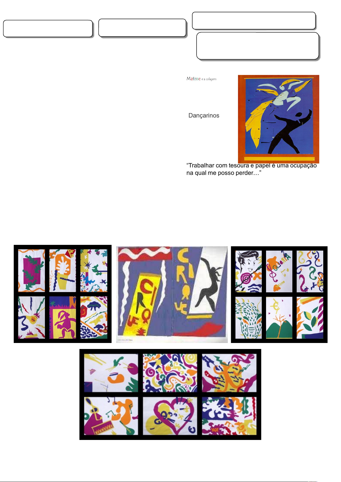 ATIVIDADE DE ARTE- INSTRUÇÕES Avaliação de Português TURMA: 8º ANO DATA: ___/____/______ TÍTULO: FOUVISMO- RELEITURA DA OBRA DE HENRI MATISSE- LINHAS E FORMAS NA ARTE- RECORTE E COLGEM MATISSE: O RECORTE E A COLAGEM Multicolorido ou só uma cor: o efeito é harmonioso… Agora é a tua vez de descobrir essa experiência! Mãos à obra? INSTRUÇÕES para o trabalho individual! 1. Precisas de 1 FOLHA, COLA, tesoura e papel colorido Para fazer os recortes. 2. Faz 3 ou 4 recortes DE FORMAS RETAS OU CURVAS DIFERENTES. 3. começa a criar a tua obra: COLOCAR OS RECORTES na folha, de forma criativa. 4. SÓ PODE COLAR quando ACHAR QUE A OBRA TE AGRADAR, EM SEGUIDA IRÁ COLAR QUANDO O PROFESSOR VERIFICAR. 5. Leia tudo até entender MUITO BEM ESTAS INSTRUÇÕES. Observe os exemplos a seguir para te inspirar. OBSERVE BEM, PENSE PRIMEIRO, ANTES DE INICIAR O TABALHO, OK? image5.jpg image1.jpg image2.jpg image3.jfif image4.jpg