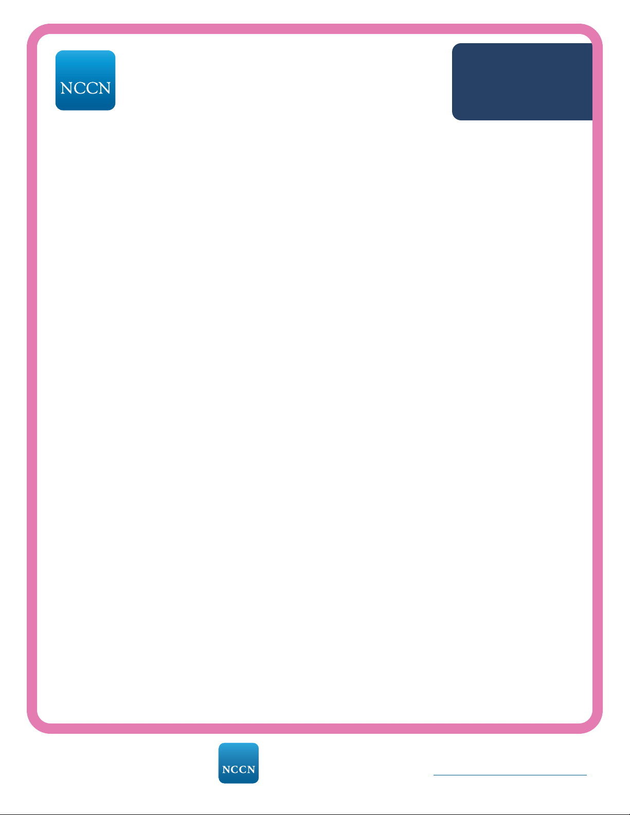 2025 Rastreamento e diagnóstico de câncer de mama NCCN GUIDELINES FOR PATIENTS® Apresentado com o apoio de FOUNDATION Guiding Treatment. Changing Lives. NATIONAL COMPREHENSIVE CANCER NETWORK® Disponível on-line em NCCN.org/patientguidelines https://www.NCCN.org/patientguidelines Ü 1 NCCN Guidelines for Patients® Rastreamento e diagnóstico de câncer de mama, 2025 Rastreamento e diagnóstico de câncer de mama Sobre as NCCN Guidelines for Patients® Você sabia que os principais centros de oncologia nos Estados Unidos trabalham em conjunto para melhorar o tratamento oncológico? Essa aliança dos principais centros de oncologia é chamada de National Comprehensive Cancer Network® (NCCN®). O tratamento oncológico está em contínua mudança. A NCCN desenvolve recomendações para o tratamento oncológico baseadas em evidências para profissionais de saúde em todo o mundo. Essas recomendações atualizadas com frequência estão disponíveis nas NCCN Clinical Practice Guidelines in Oncology (NCCN Guidelines®). As NCCN Guidelines for Patients explicam claramente as recomendações de especialistas para pessoas com câncer e para cuidadores. Essas NCCN Guidelines for Patients se baseiam nas NCCN Clinical Practice Guidelines in Oncology (NCCN Guidelines®) para Rastreamento e diagnóstico de câncer de mama Versão 2.2025 – 28 de março de 2025. Saiba como são desenvolvidas as NCCN Guidelines for Patients NCCN.org/patient-guidelines-process Encontre um centro de oncologia da NCCN perto de você NCCN.org/cancercenters Consulte as NCCN Guidelines for Patients gratuitamente on-line NCCN.org/patientguidelines Conecte-se conosco http://www.nccn.org/cancercenters https://www.NCCN.org/patient-guidelines-process https://www.NCCN.org/cancercenters https://www.NCCN.org/patientguidelines 2 NCCN Guidelines for Patients® Rastreamento e diagnóstico de câncer de mama, 2025 Rastreamento e diagnóstico de câncer de mama Apoiadores Para fazer uma doação ou saber mais, acesse on-line ou envie um e-mail NCCNFoundation.org/Donate PatientGuidelines@NCCN.org A NCCN adapta, atualiza e organiza as NCCN Guidelines for Patients de forma independente. Nossos apoiadores corporativos não participam do desenvolvimento das NCCN Guidelines for Patients e não são responsáveis pelo conteúdo e pelas recomendações nelas contidas. As NCCN Guidelines for Patients têm o apoio e o financiamento da NCCN Foundation® FOUNDATION Guiding Treatment. Changing Lives. NATIONAL COMPREHENSIVE CANCER NETWORK® https://nccnfoundation.givingfuel.com/nccn-foundation mailto:patientguidelines%40nccn.org?subject= 3 NCCN Guidelines for Patients® Rastreamento e diagnóstico de câncer de mama, 2025 Rastreamento e diagnóstico de câncer de mama Sumário © 2025 National Comprehensive Cancer Network, Inc. Todos os direitos reservados. As NCCN Guidelines for Patients e ilustrações aqui contidas não podem ser reproduzidas de nenhuma maneira para qualquer fim sem a autorização expressa por escrito da NCCN. Ninguém, incluindo médicos ou pacientes, pode usar as NCCN Guidelines for Patients para qualquer fim comercial e não pode alegar, representar ou pressupor que as NCCN Guidelines for Patients que tenham sido modificadas de qualquer maneira sejam derivadas, baseadas, relacionadas ou resultem das NCCN Guidelines for Patients. As NCCN Guidelines são um trabalho em andamento e podem ser redefinidas sempre que novos dados significativos forem disponibilizados. A NCCN não oferece garantias de qualquer tipo sobre o respectivo conteúdo, uso ou aplicação, e se exime de qualquer responsabilidade pela sua aplicação ou uso de qualquer modo. A NCCN Foundation busca apoiar os milhões de pacientes e suas famílias afetados por um diagnóstico de câncer pelo financiamento e distribuição das NCCN Guidelines for Patients. A NCCN Foundation também está comprometida com o avanço do tratamento do câncer por meio do financiamento de médicos promissores do país no centro de inovação em pesquisa sobre o câncer. Para obter mais informações e acessar a biblioteca completa de recursos para o paciente e cuidadores, acesse NCCN.org/patients. National Comprehensive Cancer Network (NCCN) e NCCN Foundation 3025 Chemical Road, Suite 100, Plymouth Meeting, PA 19462 USA 4 Sobre o rastreamento de câncer de mama 8 Rastreamento e exames complementares 18 Avaliação de risco para rastreamento 26 Exames durante a gestação e a amamentação 30 O que fazer quando você tiver sintomas 38 Outros recursos 42 Termos que você precisa conhecer 44 Colaboradores da NCCN 45 Centros de oncologia da NCCN 48 Índice https://www.NCCN.org/patients 4 NCCN Guidelines for Patients® Rastreamento e diagnóstico de câncer de mama, 2025 1 Sobre o rastreamento de câncer de mama 5 Quais são as partes da mama? 5 Por que o rastreamento de câncer de mama é importante? 6 Onde começa o câncer de mama? 6 O que o livro contém? 7 O que você pode fazer para receber o melhor tratamento? 5 NCCN Guidelines for Patients® Rastreamento e diagnóstico de câncer de mama, 2025 1 Sobre o rastreamento de câncer de mama » Quais são as partes da mama?1 Sobre o rastreamento de câncer de mama » Por que o rastreamento de câncer de mama é importante? O câncer de mama começa nas células da mama. O rastreamento de câncer de mama e exames de mama periódicos ajudam a detectar o câncer de mama em seus estágios iniciais mais tratáveis. Quais são as partes da mama? A mama é uma glândula no tórax. A mama é composta de dutos mamários, gordura, nervos, vasos linfáticos e sanguíneos, ligamentos e outros tecidos conjuntivos. Atrás da mama estão os músculos peitorais (tórax) e as costelas. Os músculos e os ligamentos ajudam a manter a mama no lugar. O tecido da mama contém glândulas que podem produzir leite. Essas glândulas mamárias são chamadas de lóbulos. Os lóbulos parecem pequenos cachos de uvas. Tubos pequenos chamados dutos conectam os lób