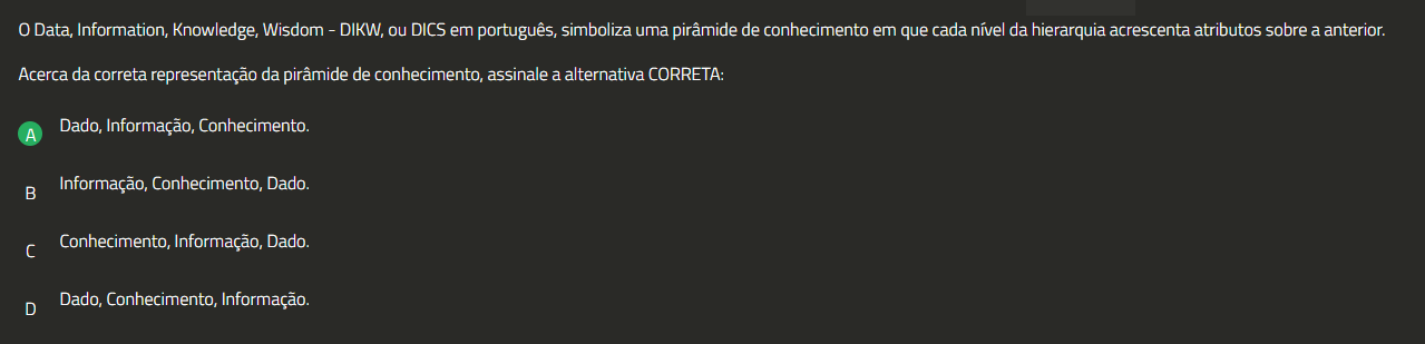0 Data, Information, Knowledge, Wisdom - DIKW, ou DICS em português, simboliza uma pirâmide de conhecimento em que cada nível da hierarquia acrescenta atributos sobre a anterior. Acerca da correta representação da pirâmide de conhecimento, assinale a alternativa CORRETA: A Dado, Informação, Conhecimento. B Informação, Conhecimento, Dado. Conhecimento, Informação, Dado. D Dado, Conhecimento, Informação.