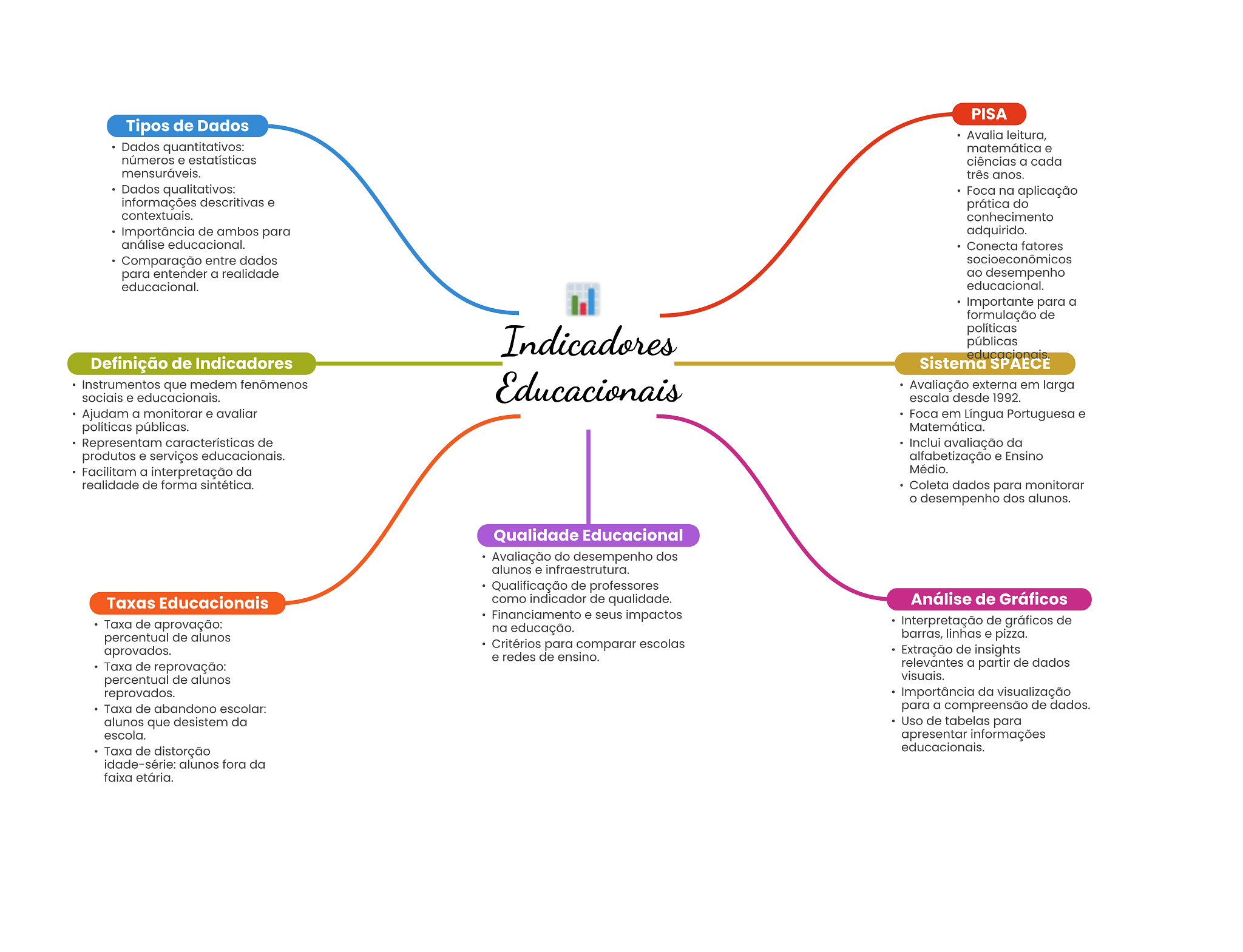 PISA Tipos de Dados Avalia leitura, Dados quantitativos: matemática e números e estatísticas ciências a cada mensuráveis. três anos. Dados qualitativos: Foca na aplicação informações descritivas e prática do contextuais. conhecimento Importância de ambos para adquirido. análise educacional. Conecta fatores Comparação entre dados socioeconômicos para entender a realidade ao desempenho educacional. educacional. Importante para a formulação de Indicadores políticas públicas educacionais Definição de Indicadores Sistema SPAECE Instrumentos que medem fenômenos sociais e educacionais. Educacionais Avaliação externa em larga escala desde 1992. Ajudam a monitorar e avaliar Foca em Língua Portuguesa e políticas públicas. Matemática. Representam características de Inclui avaliação da produtos e serviços educacionais. alfabetização e Ensino Facilitam a interpretação da Médio. realidade de forma sintética. Coleta dados para monitorar desempenho dos alunos. Qualidade Educacional Avaliação do desempenho dos alunos e infraestrutura. Qualificação de professores Taxas Educacionais como indicador de qualidade. Análise de Gráficos Financiamento e seus impactos Taxa de aprovação: Interpretação de gráficos de na educação. percentual de alunos barras, linhas e pizza. aprovados. Critérios para comparar escolas e redes de ensino. Extração de insights Taxa de reprovação: relevantes a partir de dados percentual de alunos visuais. reprovados. Importância da visualização Taxa de abandono escolar: para a compreensão de dados. alunos que desistem da Uso de tabelas para escola. apresentar informações Taxa de distorção educacionais. idade-série: alunos fora da faixa etária.