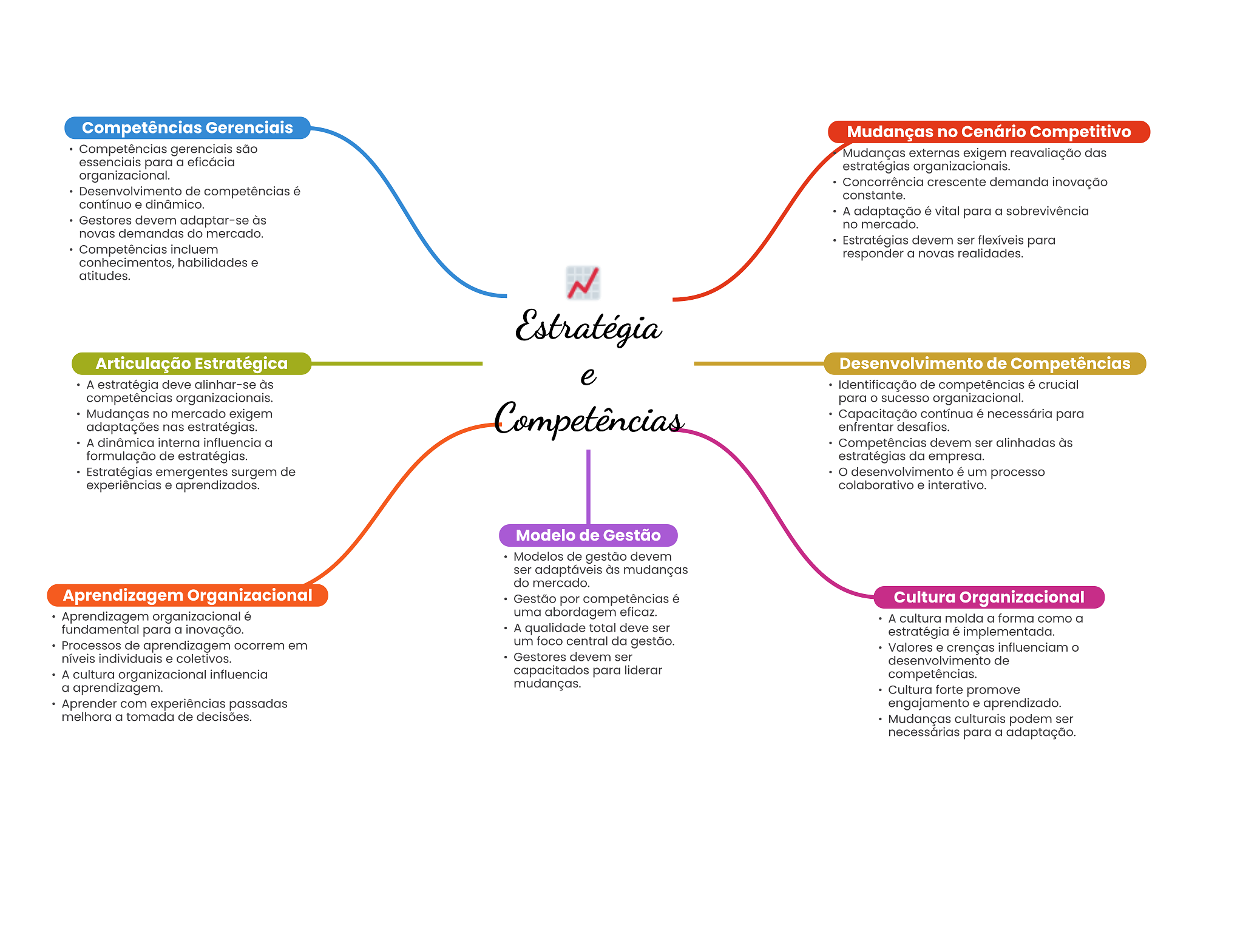 Competências Gerenciais Mudanças no Cenário Competitivo Competências gerenciais são Mudanças externas exigem reavaliação das essenciais para a eficácia estratégias organizacionais. organizacional. Concorrência crescente demanda inovação Desenvolvimento de competências é constante. contínuo e dinâmico. A adaptação é vital para a sobrevivência Gestores devem adaptar-se às no mercado. novas demandas do mercado. Estratégias devem ser flexíveis para Competências incluem responder a novas realidades. conhecimentos, habilidades e atitudes. N Estratégia Articulação Estratégica de Competências e A estratégia deve alinhar-se às Identificação de competências é crucial competências organizacionais. para sucesso organizacional. Mudanças no mercado exigem Competências Capacitação contínua é necessária para adaptações nas estratégias. enfrentar desafios. A dinâmica interna influencia a Competências devem ser alinhadas às formulação de estratégias. estratégias da empresa. Estratégias emergentes surgem de O desenvolvimento é um processo experiências e aprendizados. colaborativo e interativo. Modelo de Gestão Modelos de gestão devem ser adaptáveis às mudanças do mercado. Aprendizagem Organizacional Gestão por competências é Cultura Organizacional Aprendizagem organizacional é uma abordagem eficaz. A cultura molda a forma como a fundamental para a inovação. A qualidade total deve ser estratégia é implementada. Processos de aprendizagem ocorrem em um foco central da gestão. Valores e crenças influenciam níveis individuais e coletivos. Gestores devem ser de A cultura organizacional influencia capacitados para liderar competências. a aprendizagem. mudanças. Cultura forte promove Aprender com experiências passadas engajamento e aprendizado. melhora a tomada de decisões. Mudanças culturais podem ser necessárias para a adaptação.