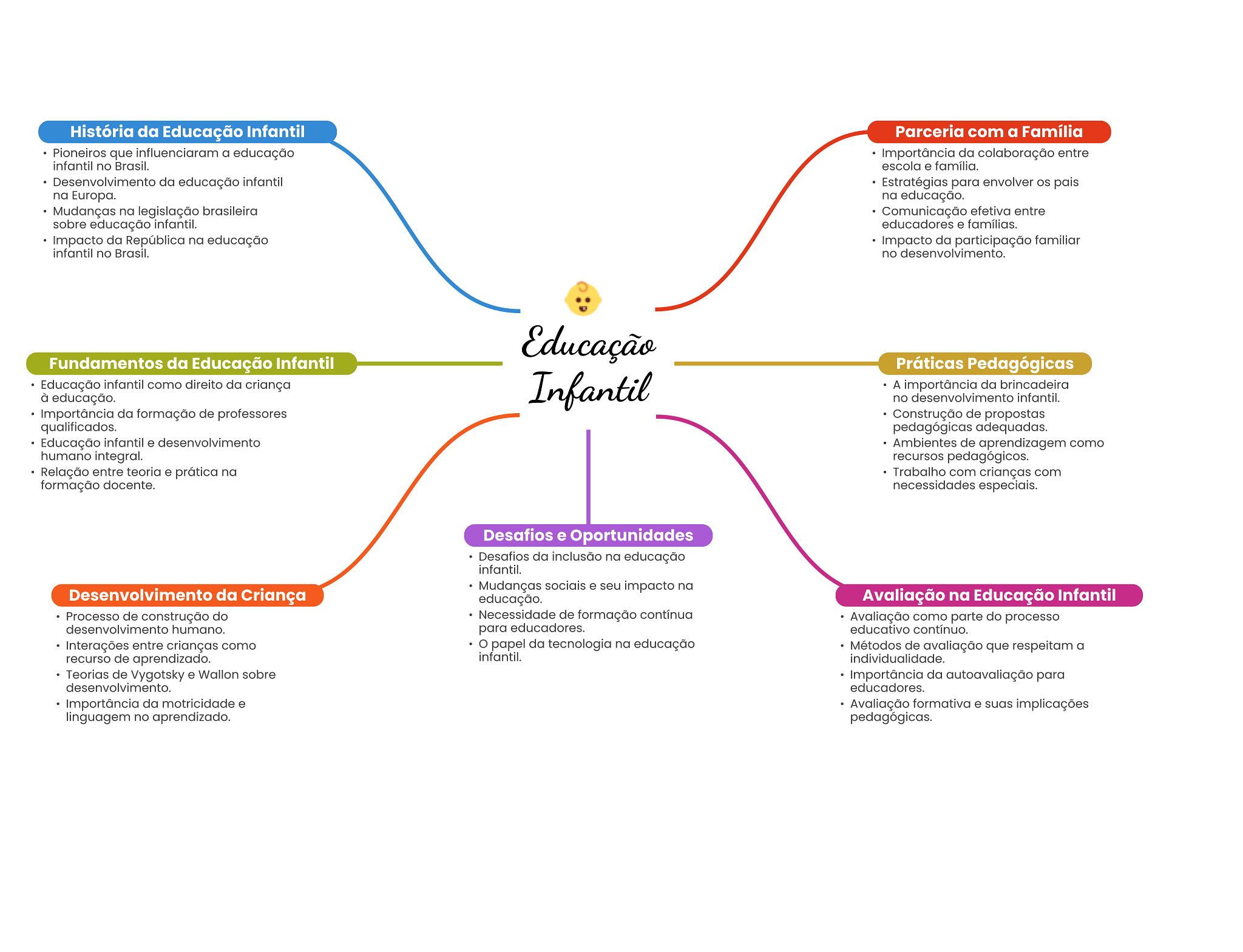 História da Educação Infantil Parceria com a Família Pioneiros que influenciaram a educação Importância da colaboração entre infantil no Brasil. escola e família. Desenvolvimento da educação infantil Estratégias para envolver pais na Europa. na educação. Mudanças na legislação brasileira Comunicação efetiva entre sobre educação infantil. educadores e famílias. Impacto da República na educação Impacto da participação familiar infantil no Brasil. no desenvolvimento. Educação Fundamentos da Educação Infantil Práticas Pedagógicas Educação infantil como direito da criança à educação. Infantil A importância da brincadeira no desenvolvimento infantil. Importância da formação de professores Construção de propostas qualificados. pedagógicas adequadas. Educação infantil e desenvolvimento Ambientes de aprendizagem como humano integral. recursos pedagógicos. Relação entre teoria e prática na Trabalho com crianças com formação docente. necessidades especiais. Desafios e Oportunidades Desafios da inclusão na educação infantil. Mudanças sociais e seu impacto na Desenvolvimento da Criança educação. Avaliação na Educação Infantil Processo de construção do Necessidade de formação contínua Avaliação como parte do processo desenvolvimento humano. para educadores. educativo contínuo. Interações entre crianças como papel da tecnologia na educação Métodos de avaliação que respeitam a recurso de aprendizado. infantil. individualidade. Teorias de Vygotsky e Wallon sobre Importância da autoavaliação para desenvolvimento. educadores. Importância da motricidade e Avaliação formativa e suas implicações linguagem no aprendizado. pedagógicas.
