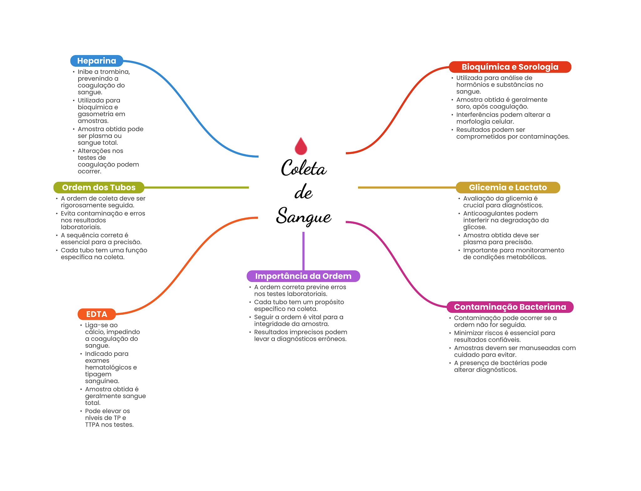 Heparina Bioquímica e Sorologia Inibe a trombina, prevenindo a Utilizada para análise de coagulação do hormônios e substâncias no sangue. sangue. Utilizada para Amostra obtida é geralmente bioquímica e soro, após coagulação. gasometria em Interferências podem alterar a amostras. morfologia celular. Amostra obtida pode Resultados podem ser ser plasma ou comprometidos por contaminações. sangue total. Alterações nos testes de coagulação podem ocorrer. Coleta Ordem dos Tubos de Glicemia e Lactato A ordem de coleta deve ser Avaliação da glicemia é rigorosamente seguida. crucial para diagnósticos. Evita contaminação e erros Sangue Anticoagulantes podem nos resultados interferir na degradação da laboratoriais. glicose. A sequência correta é Amostra obtida deve ser essencial para a precisão. plasma para precisão. Cada tubo tem uma função Importante para monitoramento específica na coleta. de condições metabólicas. Importância da Ordem A ordem correta previne erros nos testes laboratoriais. Cada tubo tem um propósito específico na coleta. Contaminação Bacteriana EDTA Seguir a ordem é vital para a Contaminação pode ocorrer se a Liga-se ao integridade da amostra. ordem não for seguida. cálcio, impedindo Resultados imprecisos podem Minimizar riscos é essencial para a coagulação do levar a diagnósticos errôneos. resultados confiáveis. sangue. Amostras devem ser manuseadas com Indicado para cuidado para evitar. exames A presença de bactérias pode hematológicos e alterar diagnósticos. tipagem sanguínea. Amostra obtida é geralmente sangue total. Pode elevar níveis de TP e TTPA nos testes.