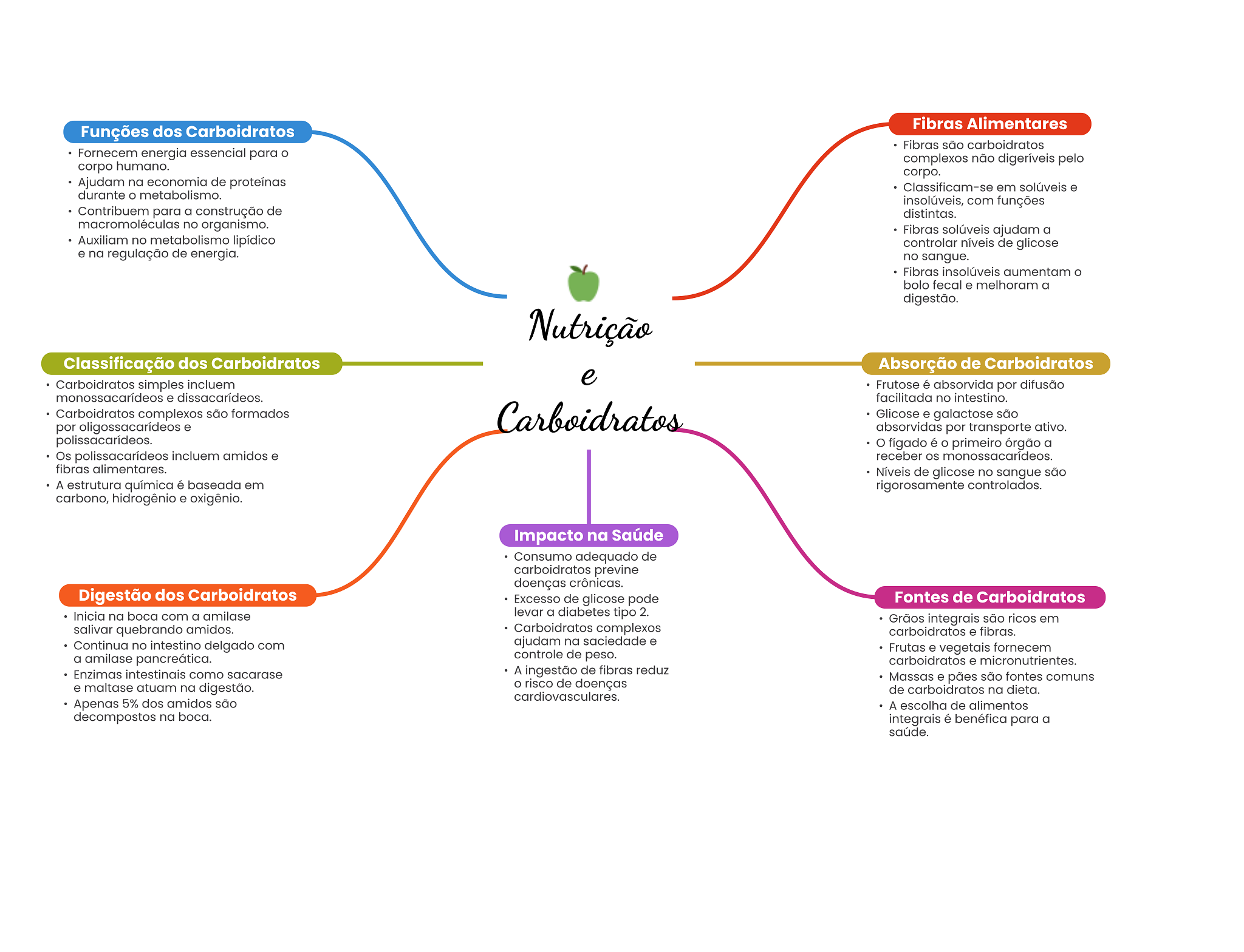 Fibras Alimentares Funções dos Carboidratos Fibras são carboidratos Fornecem energia essencial para complexos não digeríveis pelo corpo humano. corpo. Ajudam na economia de proteínas Classificam-se em solúveis e durante metabolismo. insolúveis, com funções Contribuem para a construção de distintas. macromoléculas no organismo. Fibras solúveis ajudam a Auxiliam no metabolismo lipídico controlar níveis de glicose e na regulação de energia. no sangue. Fibras insolúveis aumentam bolo fecal e melhoram a digestão. Nutrição Classificação dos Carboidratos Absorção de Carboidratos e Carboidratos simples incluem Frutose é absorvida por difusão monossacarídeos e dissacarídeos. facilitada no intestino. Carboidratos complexos são formados Carboidratos Glicose e galactose são por oligossacarídeos e absorvidas por transporte ativo. polissacarídeos. fígado é O primeiro órgão a Os polissacarídeos incluem amidos e receber fibras alimentares. Níveis de glicose no sangue são A estrutura química é baseada em rigorosamente controlados. carbono, hidrogênio e oxigênio. Impacto na Saúde Consumo adequado de carboidratos previne doenças crônicas. Digestão dos Carboidratos Excesso de glicose pode Fontes de Carboidratos Inicia na boca com a amilase levar a diabetes tipo 2. Grãos integrais são ricos em salivar quebrando amidos. Carboidratos complexos carboidratos e fibras. Continua no intestino delgado com ajudam na saciedade e controle de peso. Frutas e vegetais fornecem a amilase carboidratos e micronutrientes. Enzimas intestinais como sacarase A ingestão de fibras reduz O risco de doenças Massas e pães são fontes comuns e maltase atuam na digestão. de carboidratos na dieta. cardiovasculares. Apenas 5% dos amidos são A escolha de alimentos decompostos na boca. integrais é benéfica para a saúde.