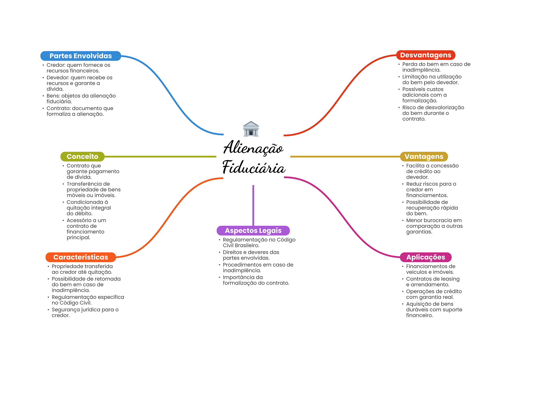 Partes Envolvidas Desvantagens Credor: quem fornece Perda do bem em caso de recursos financeiros. inadimplência. Devedor: quem recebe OS Limitação na utilização recursos e garante a do bem pelo devedor. dívida. Possíveis custos Bens: objetos da alienação adicionais com a fiduciária. formalização. Contrato: documento que Risco de desvalorização formaliza a alienação. do bem durante contrato. Alienação Conceito Vantagens Contrato que garante pagamento Fiduciária Facilita a concessão de crédito ao de dívida. devedor. Transferência de Reduz riscos para O propriedade de bens credor em móveis ou imóveis. financiamentos. Condicionada à Possibilidade de quitação integral recuperação rápida do débito. do bem. Acessório a um Menor burocracia em contrato de comparação a outras financiamento Aspectos Legais garantias. principal. Regulamentação no Código Civil Brasileiro. Direitos e deveres das Características partes envolvidas. Aplicações Propriedade transferida Procedimentos em caso de Financiamentos de credor até quitação. inadimplência. veículos e imóveis. Possibilidade de retomada Importância da Contratos de leasing do bem em caso de formalização do contrato. e arrendamento. inadimplência. Operações de crédito Regulamentação específica com garantia real. no Código Civil. Aquisição de bens Segurança jurídica para duráveis com suporte credor. financeiro.