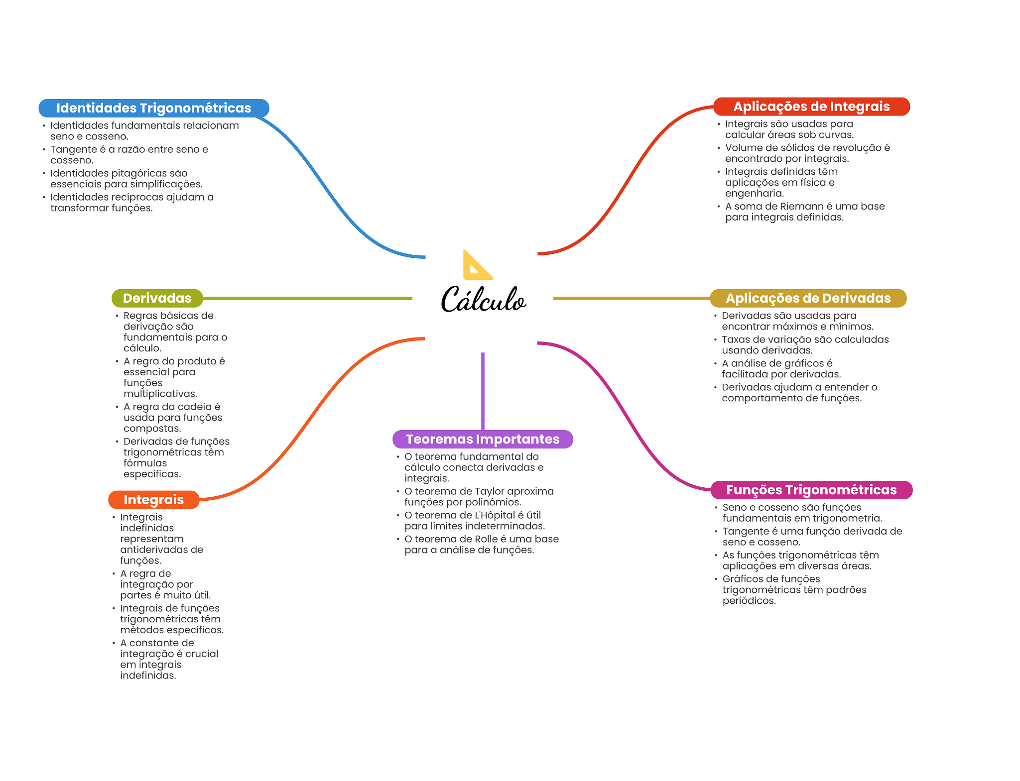 Identidades Trigonométricas Aplicações de Integrais Identidades fundamentais relacionam Integrais são usadas para seno e cosseno. calcular áreas sob curvas. Tangente é a razão entre seno e Volume de sólidos de revolução é cosseno. encontrado por integrais. Identidades pitagóricas são Integrais definidas têm essenciais para simplificações. aplicações em física e Identidades recíprocas ajudam a engenharia. transformar funções. A soma de Riemann é uma base para integrais definidas. Derivadas Cálculo Aplicações de Derivadas Regras básicas de Derivadas são usadas para derivação são encontrar máximos e mínimos. fundamentais para Taxas de variação são calculadas cálculo. usando derivadas. A regra do produto é A análise de gráficos é essencial para facilitada por derivadas. funções Derivadas ajudam a entender O multiplicativas. comportamento de funções. A regra da cadeia é usada para funções compostas. Derivadas de funções Teoremas Importantes trigonométricas têm teorema fundamental do fórmulas cálculo conecta derivadas e específicas. integrais. O teorema de Taylor aproxima Funções Trigonométricas Integrais funções por polinômios. Seno e cosseno são funções Integrais O teorema de L'Hôpital é útil fundamentais em trigonometria. indefinidas para limites indeterminados. Tangente é uma função derivada de representam teorema de Rolle é uma base seno e cosseno. antiderivadas de para a análise de funções. funções. As funções trigonométricas têm aplicações em diversas áreas. A regra de integração por Gráficos de funções partes é muito útil. trigonométricas têm padrões periódicos. Integrais de funções trigonométricas têm métodos específicos. A constante de integração é crucial em integrais indefinidas.