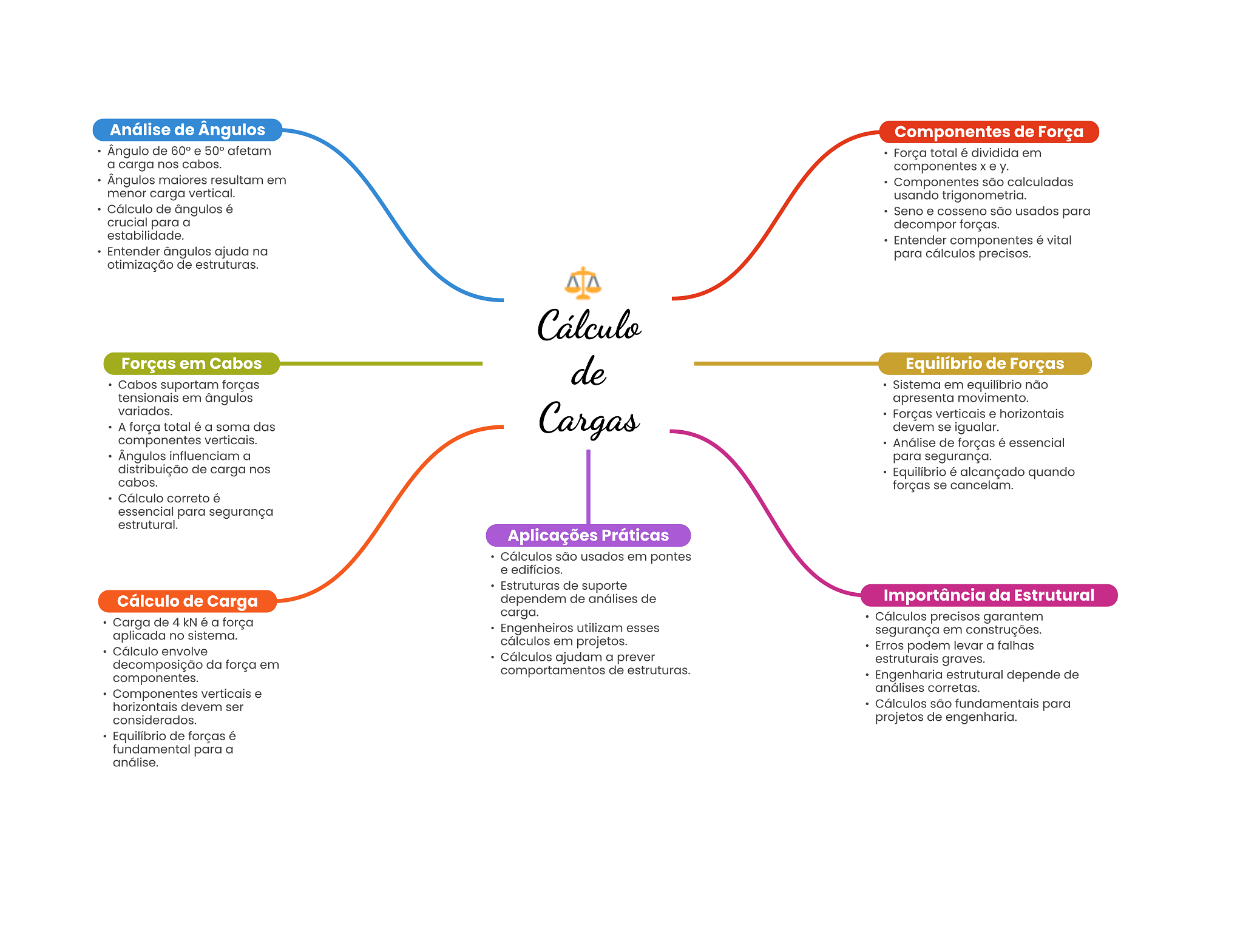 Análise de Ângulos Componentes de Força Ângulo de 60° e 50° afetam Força total é dividida em a carga nos cabos. componentes X e y. Ângulos maiores resultam em Componentes são calculadas menor carga vertical. usando trigonometria. Cálculo de ângulos é Seno e cosseno são usados para crucial para a decompor forças. estabilidade. Entender componentes é vital Entender ângulos ajuda na para cálculos precisos. otimização de estruturas. Cálculo Forças em Cabos de Equilíbrio de Forças Cabos suportam forças Sistema em equilíbrio não tensionais em ângulos apresenta movimento. variados. Cargas Forças verticais e horizontais A força total é a soma das devem se igualar. componentes verticais. Análise de forças é essencial Ângulos influenciam a para segurança. distribuição de carga nos Equilíbrio é alcançado quando cabos. forças se cancelam. Cálculo correto é essencial para segurança estrutural. Aplicações Práticas Cálculos são usados em pontes e edifícios. Estruturas de suporte Cálculo de Carga dependem de análises de Importância da Estrutural carga. Carga de 4 é a força Cálculos precisos garantem Engenheiros utilizam esses aplicada no sistema. segurança em construções. cálculos em projetos. Cálculo envolve Erros podem levar a falhas Cálculos ajudam a prever decomposição da força em estruturais graves. comportamentos de estruturas. componentes. Engenharia estrutural depende de análises corretas. Componentes verticais e horizontais devem ser Cálculos são fundamentais para considerados. projetos de engenharia. Equilíbrio de forças é fundamental para a análise.