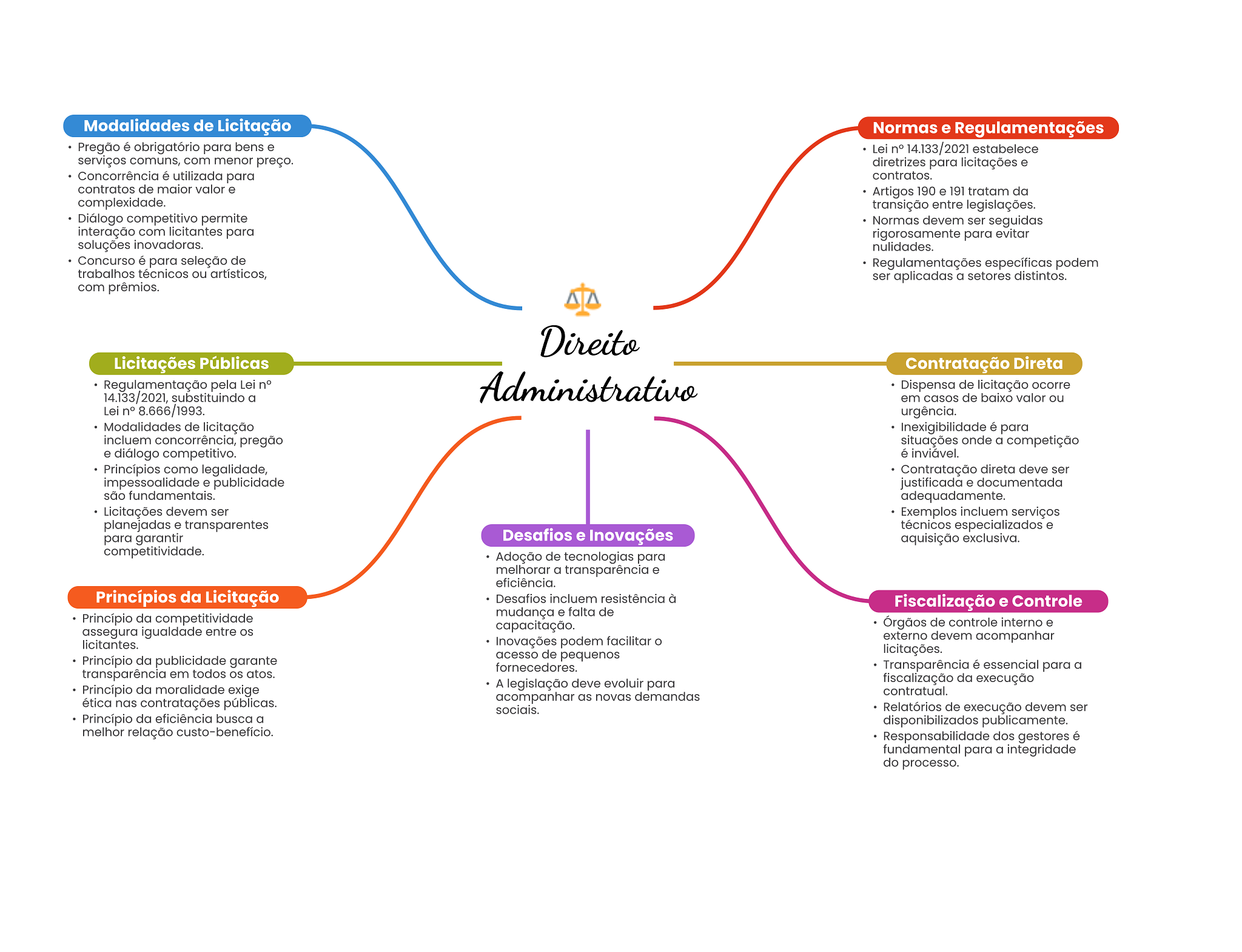 Modalidades de Licitação Normas e Regulamentações Pregão é obrigatório para bens e Lei n° 14.133/2021 estabelece serviços comuns, com menor preço. diretrizes para licitações e Concorrência é utilizada para contratos. contratos de maior valor e Artigos 190 e 191 tratam da complexidade. transição entre legislações. Diálogo competitivo permite Normas devem ser seguidas interação com licitantes para rigorosamente para evitar soluções inovadoras. nulidades. Concurso é para seleção de Regulamentações específicas podem trabalhos técnicos ou artísticos, ser aplicadas a setores distintos. com prêmios. Direito Licitações Públicas Contratação Direta Regulamentação pela Lei n° Administrativo Dispensa de licitação ocorre 14.133/2021, substituindo a em casos de baixo valor ou Lei n° 8.666/1993. urgência. Modalidades de licitação Inexigibilidade é para incluem concorrência, pregão situações onde a competição e diálogo competitivo. é inviável. Princípios como legalidade, Contratação direta deve ser impessoalidade e publicidade justificada e documentada são fundamentais. adequadamente. Licitações devem ser Exemplos incluem serviços planejadas e transparentes técnicos especializados e para garantir Desafios e Inovações aquisição exclusiva. competitividade. Adoção de tecnologias para melhorar a transparência e eficiência. Princípios da Licitação Desafios incluem resistência à Fiscalização e Controle Princípio da competitividade mudança e falta de assegura igualdade entre capacitação. Órgãos de controle interno e licitantes. Inovações podem facilitar O externo devem acompanhar acesso de pequenos licitações. Princípio da publicidade garante fornecedores. Transparência é essencial para a transparência em todos atos. Princípio da moralidade exige A legislação deve evoluir para fiscalização da execução contratual. ética nas contratações públicas. acompanhar as novas demandas sociais. Relatórios de execução devem ser Princípio da eficiência busca a disponibilizados publicamente. melhor relação custo-benefício. Responsabilidade dos gestores é fundamental para a integridade do processo.