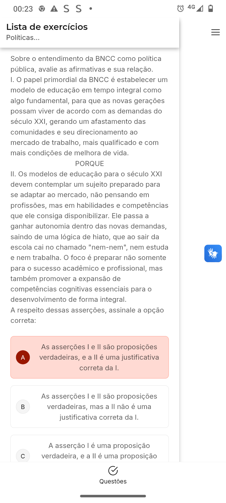 00:23 4G Lista de exercícios Políticas... Sobre entendimento da BNCC como política pública, avalie as afirmativas e sua relação. I. papel primordial da BNCC é estabelecer um modelo de educação em tempo integral como algo fundamental, para que as novas gerações possam viver de acordo com as demandas do século XXI, gerando um afastamento das comunidades e seu direcionamento ao mercado de trabalho, mais qualificado e com mais condições de melhora de vida. PORQUE II. Os modelos de educação para século XXI devem contemplar um sujeito preparado para se adaptar ao mercado, não pensando em profissões, mas em habilidades e competências que ele consiga disponibilizar. Ele passa a ganhar autonomia dentro das novas demandas, saindo de uma lógica de hiato, que ao sair da escola cai no chamado "nem-nem", nem estuda e nem trabalha. foco é preparar não somente para sucesso acadêmico e profissional, mas também promover a expansão de competências cognitivas essenciais para desenvolvimento de forma integral. A respeito dessas asserções, assinale a opção correta: As asserções e II são proposições A verdadeiras, e a II é uma justificativa correta da As asserções e são proposições verdadeiras, mas a não é uma justificativa correta da I. A asserção é uma proposição c verdadeira, e a é uma proposição Questões