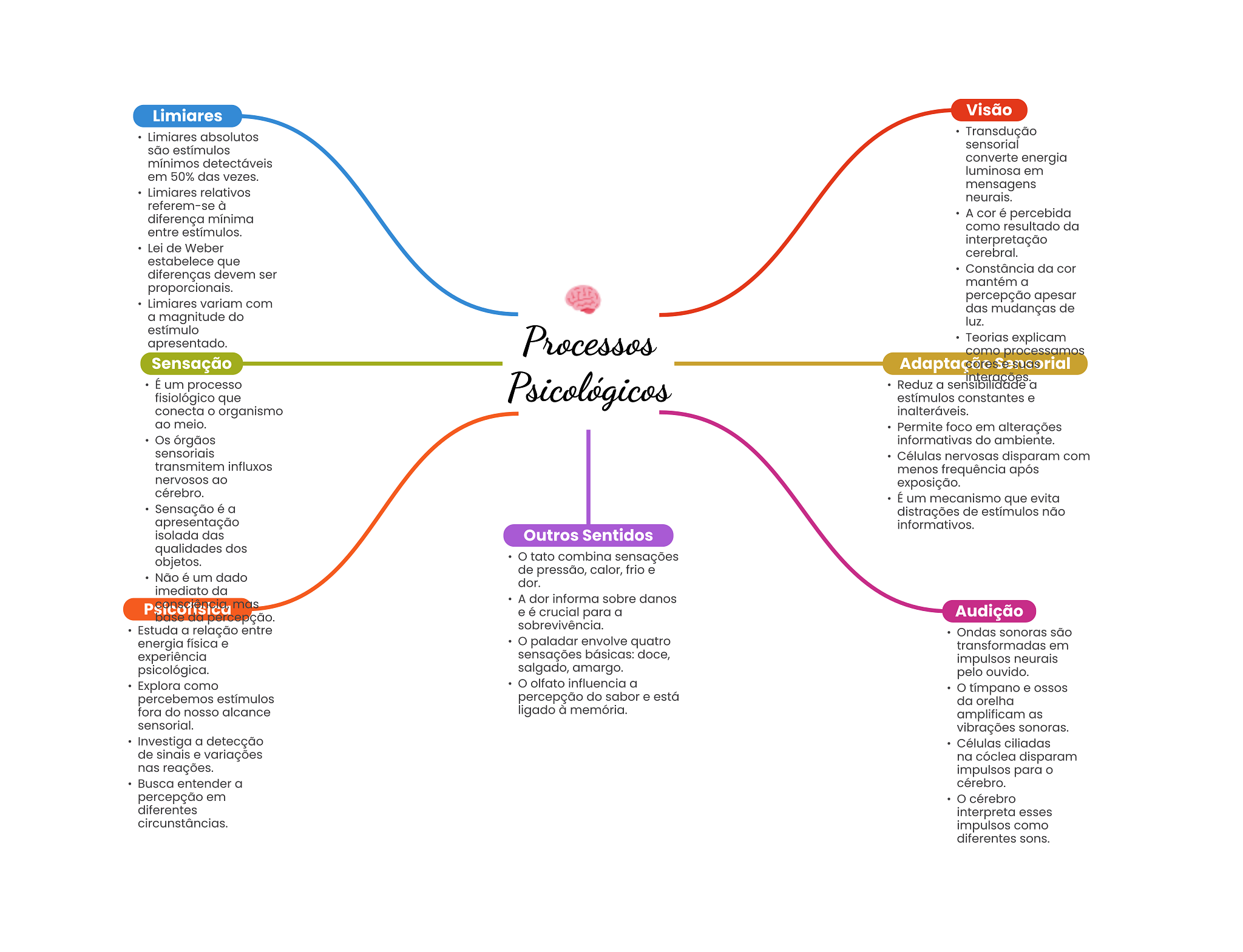 Limiares Visão Limiares absolutos Transdução sensorial são estímulos mínimos detectáveis converte energia luminosa em em 50% das vezes. mensagens Limiares relativos neurais. referem-se à diferença mínima A cor é percebida como resultado da entre estímulos. interpretação Lei de Weber cerebral. estabelece que Constância da cor diferenças devem ser mantém a proporcionais. percepção apesar Limiares variam com das mudanças de a magnitude do luz. estímulo apresentado. Processos Teorias explicam como processamos Sensação É um processo Psicológicos interações. Reduz a sensibilidade a fisiológico que estímulos constantes e conecta O organismo inalteráveis. ao meio. Permite foco em alterações Os órgãos informativas do ambiente. sensoriais Células nervosas disparam com transmitem influxos menos frequência após nervosos ao exposição. cérebro. É um mecanismo que evita Sensação é a distrações de estímulos não apresentação informativos. isolada das Outros Sentidos qualidades dos objetos. O tato combina sensações de pressão, calor, frio e Não é um dado dor. imediato da A dor informa sobre danos mas percepção. e é crucial para a Audição Estuda a relação entre sobrevivência. Ondas sonoras são energia física e paladar envolve quatro transformadas em experiência sensações básicas: doce, impulsos neurais psicológica. salgado, amargo. pelo ouvido. Explora como olfato influencia a O tímpano e percebemos estímulos percepção do sabor e está da orelha fora do nosso alcance ligado à memória. amplificam as sensorial. vibrações sonoras. Investiga a detecção Células ciliadas de sinais e variações na cóclea disparam nas reações. impulsos para Busca entender a cérebro. percepção em cérebro diferentes interpreta esses circunstâncias. impulsos como diferentes sons.