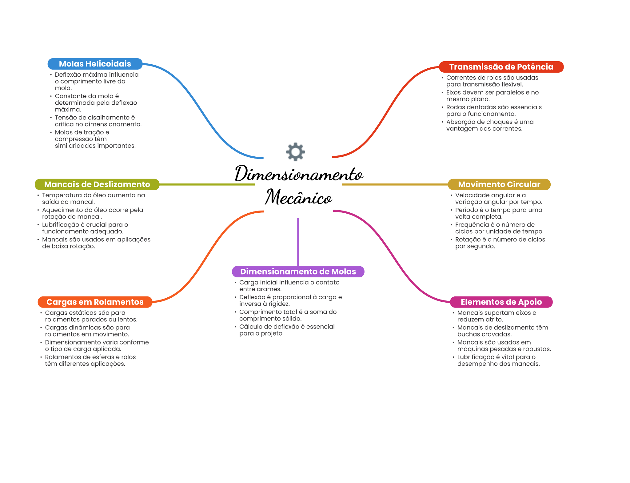 Molas Helicoidais Transmissão de Potência Deflexão máxima influencia Correntes de rolos são usadas comprimento livre da mola. para transmissão flexível. Constante da mola é Eixos devem ser paralelos e no mesmo plano. determinada pela deflexão máxima. Rodas dentadas são essenciais Tensão de cisalhamento é para O funcionamento. crítica no Absorção de choques é uma vantagem das correntes. Molas de tração e compressão têm similaridades importantes. Dimensionamento Mancais de Deslizamento Movimento Circular Temperatura do óleo aumenta na Mecânico Velocidade angular é a saída do mancal. variação angular por tempo. Aquecimento do óleo ocorre pela Período é O tempo para uma rotação do mancal. volta completa. Lubrificação é crucial para Frequência é número de funcionamento adequado. ciclos por unidade de tempo. Mancais são usados em aplicações Rotação é O número de ciclos de baixa rotação. por segundo. Dimensionamento de Molas Carga inicial influencia contato entre arames. Deflexão é proporcional à carga e Cargas em Rolamentos inversa à rigidez. Elementos de Apoio Cargas estáticas são para Comprimento total é a soma do Mancais suportam eixos e rolamentos parados ou lentos. comprimento sólido. reduzem atrito. Cargas dinâmicas são para Cálculo de deflexão é essencial Mancais de deslizamento têm rolamentos em movimento. para projeto. buchas cravadas. Dimensionamento varia conforme Mancais são usados em tipo de carga aplicada. máquinas pesadas e robustas. Rolamentos de esferas e rolos Lubrificação é vital para O têm diferentes aplicações. desempenho dos mancais.