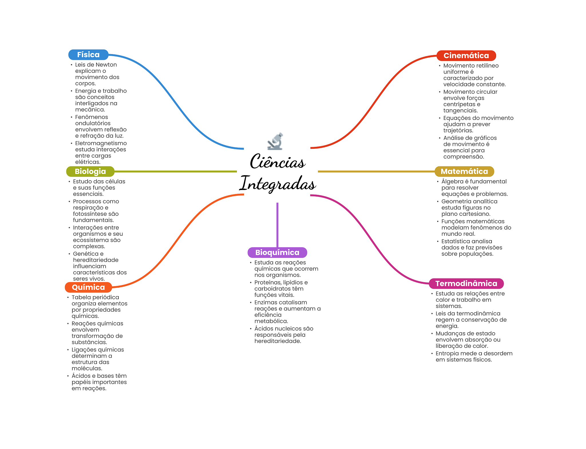 Física Cinemática Leis de Newton Movimento retilíneo explicam uniforme é movimento dos caracterizado por corpos. velocidade constante. Energia e trabalho Movimento circular são conceitos envolve forças interligados na e mecânica. tangenciais. Fenômenos Equações do movimento ondulatórios ajudam a prever envolvem reflexão trajetórias. e refração da luz. Análise de gráficos Eletromagnetismo de movimento é estuda interações essencial para entre cargas elétricas. Ciências compreensão. Biologia Matemática Estudo das células e suas funções Integradas Álgebra é fundamental para resolver essenciais. equações e problemas. Processos como Geometria analítica respiração e estuda figuras no fotossíntese são plano cartesiano. fundamentais. Funções matemáticas Interações entre modelam fenômenos do organismos e seu mundo real. ecossistema são Estatística analisa complexas. dados e faz previsões Genética e Bioquímica sobre populações. hereditariedade influenciam Estuda as reações químicas que ocorrem características dos seres vivos. nos organismos. Proteínas, lipídios e Química Termodinâmica carboidratos têm Tabela periódica funções vitais. Estuda as relações entre Enzimas catalisam calor e trabalho em organiza elementos sistemas. por propriedades reações e aumentam a químicas. eficiência Leis da termodinâmica Reações químicas metabólica. regem a conservação de envolvem Ácidos nucleicos são energia. transformação de responsáveis pela Mudanças de estado substâncias. hereditariedade. envolvem absorção ou liberação de calor. Ligações químicas determinam a Entropia mede a desordem estrutura das em sistemas físicos. moléculas. Ácidos e bases têm papéis importantes em reações.