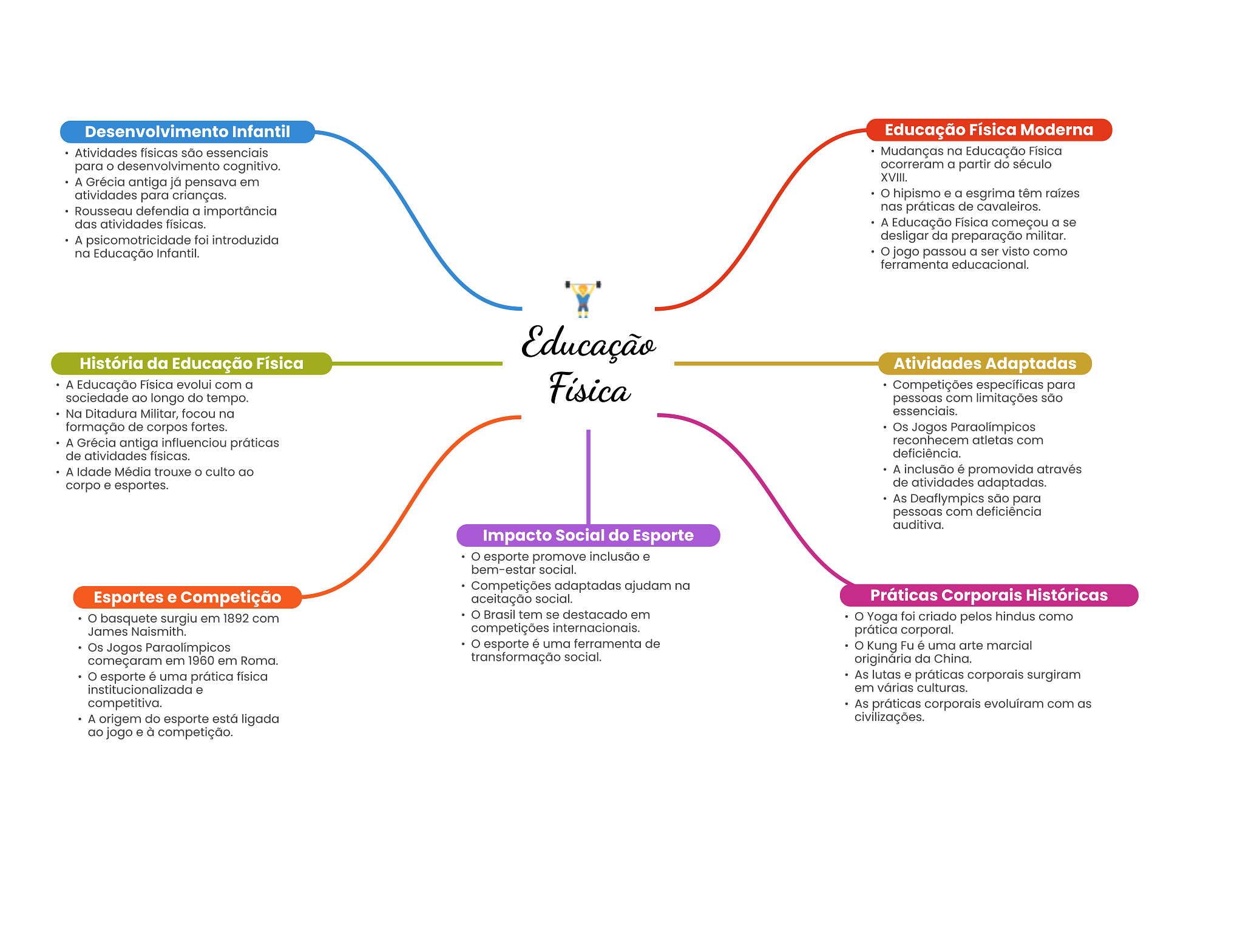 Desenvolvimento Infantil Educação Física Moderna Atividades físicas são essenciais Mudanças na Educação Física para desenvolvimento cognitivo. ocorreram a partir do século A Grécia antiga já pensava em XVIII. atividades para crianças. hipismo e a esgrima têm raízes Rousseau defendia a importância nas práticas de cavaleiros. das atividades físicas. A Educação Física começou a se A psicomotricidade foi introduzida desligar da preparação militar. na Educação Infantil. jogo passou a ser visto como ferramenta educacional. Educação História da Educação Física Atividades Adaptadas A Educação Física evolui com a Física Competições específicas para sociedade ao longo do tempo. pessoas com limitações são Na Ditadura Militar, focou na essenciais. formação de corpos fortes. Os Jogos Paraolímpicos A Grécia antiga influenciou práticas reconhecem atletas com de atividades físicas. deficiência. A Idade Média trouxe culto ao A inclusão é promovida através corpo e esportes. de atividades adaptadas. As Deaflympics são para pessoas com deficiência auditiva. Impacto Social do Esporte esporte promove inclusão e bem-estar social. Competições adaptadas ajudam na Esportes e Competição aceitação social. Práticas Corporais Históricas basquete surgiu em 1892 com Brasil tem se destacado em Yoga foi criado pelos hindus como James Naismith. competições internacionais. prática corporal. Os Jogos Paraolímpicos esporte é uma ferramenta de Kung Fu é uma arte marcial começaram em 1960 em Roma. transformação social. originária da China. esporte é uma prática física As lutas e práticas corporais surgiram institucionalizada e em várias culturas. competitiva. As práticas corporais evoluíram com as A origem do esporte está ligada civilizações. ao jogo e à competição.