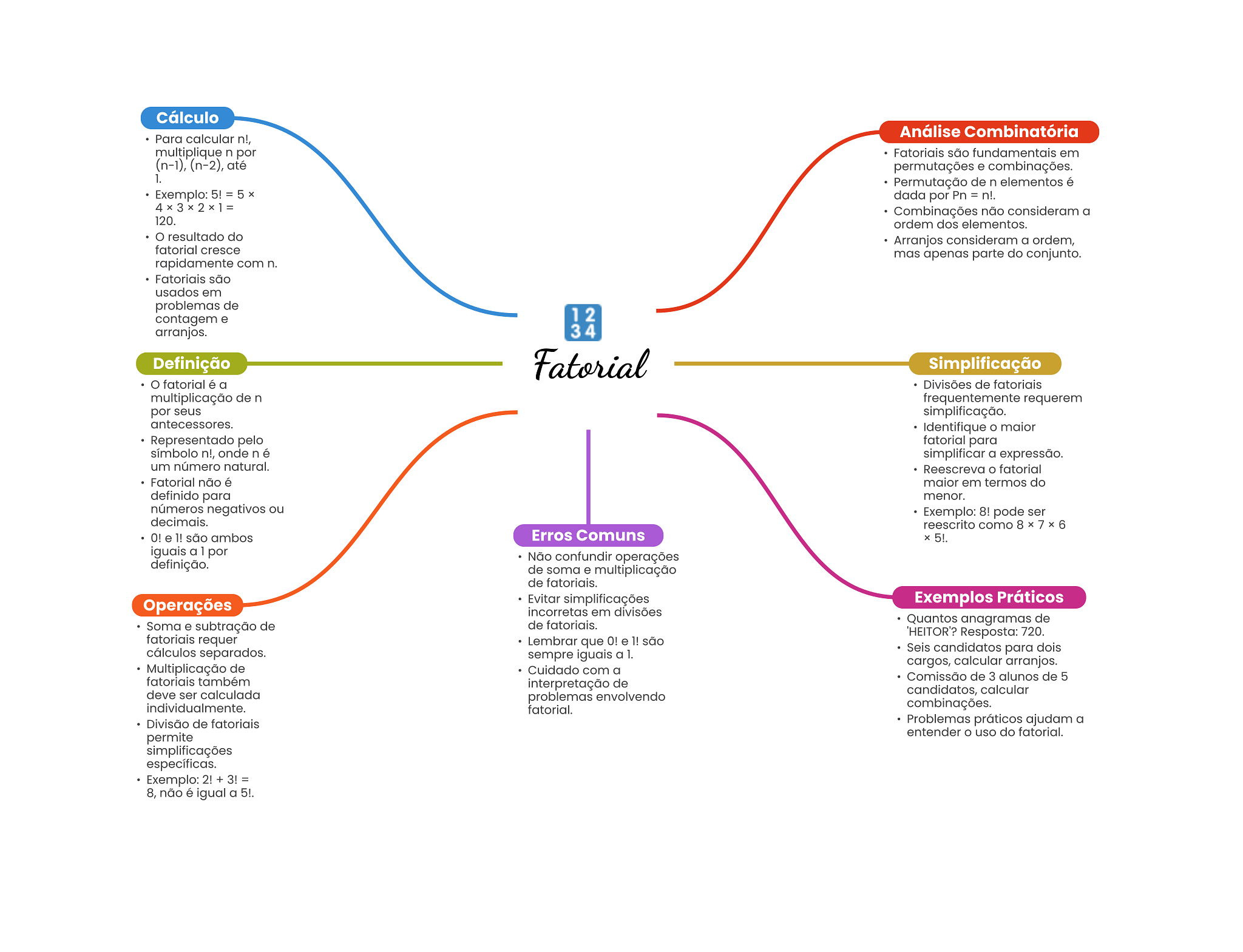 Cálculo Análise Combinatória Para calcular n!, multiplique n por Fatoriais são fundamentais em (n-1), (n-2), até permutações e combinações. 1. Permutação de n elementos é Exemplo: 5! = 5 dada por Pn = n!. Combinações não consideram a 120. ordem dos elementos. resultado do Arranjos consideram a ordem, fatorial cresce mas apenas parte do conjunto. rapidamente com n. Fatoriais são usados em problemas de contagem e 12 arranjos. 34 Definição Fatorial Simplificação fatorial é a Divisões de fatoriais multiplicação de n frequentemente requerem por seus simplificação. antecessores. Identifique maior Representado pelo fatorial para símbolo n!, onde n é simplificar a expressão. um número natural. Reescreva fatorial Fatorial não é maior em termos do definido para menor. números negativos ou Exemplo: 8! pode ser decimais. reescrito como O! e 1! são ambos Erros Comuns 5!. iguais a 1 por Não confundir operações definição. de soma e multiplicação de fatoriais. Operações Evitar simplificações Exemplos Práticos incorretas em divisões Soma e subtração de de fatoriais. Quantos anagramas de 'HEITOR'? Resposta: 720. fatoriais requer Lembrar que e 1! são cálculos separados. sempre iguais a 1. Seis candidatos para dois cargos, calcular arranjos. Multiplicação de Cuidado com a fatoriais também Comissão de 3 alunos de 5 interpretação de deve ser calculada candidatos, calcular problemas envolvendo individualmente. fatorial. combinações. Divisão de fatoriais Problemas práticos ajudam a entender uso do fatorial. permite simplificações específicas. Exemplo: 2! + 3! = 8, não é igual a 5!.