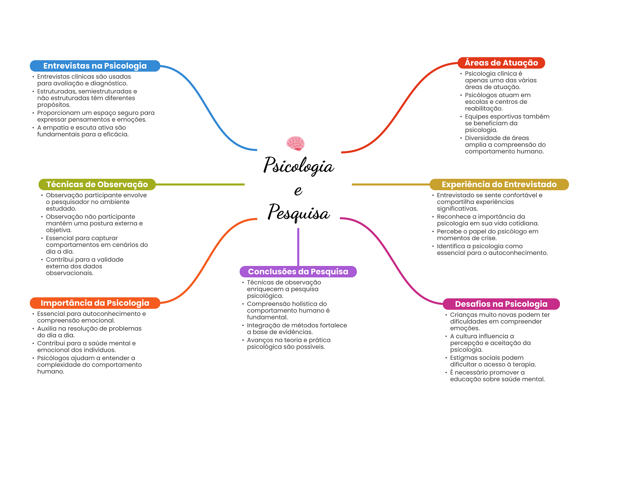 Entrevistas na Psicologia Áreas de Atuação Entrevistas clínicas são usadas Psicologia clínica é para avaliação e diagnóstico. apenas uma das várias áreas de atuação. Estruturadas, semiestruturadas e não estruturadas têm diferentes Psicólogos atuam em escolas e centros de propósitos. reabilitação. Proporcionam um espaço seguro para expressar pensamentos e emoções. Equipes esportivas também se beneficiam da A empatia e escuta ativa são psicologia. fundamentais para a eficácia. Diversidade de áreas amplia a compreensão do comportamento humano. Psicologia Técnicas de Observação Experiência do Entrevistado e Observação participante envolve Entrevistado se sente confortável e O pesquisador no ambiente compartilha experiências estudado. Pesquisa significativas. Observação não participante Reconhece a importância da mantém uma postura externa e psicologia em sua vida cotidiana. objetiva. Percebe O papel do psicólogo em Essencial para capturar momentos de crise. comportamentos em cenários do Identifica a psicologia como dia a dia. essencial para O autoconhecimento. Contribui para a validade externa dos dados observacionais. Conclusões da Pesquisa Técnicas de observação enriquecem a pesquisa psicológica. Importância da Psicologia Compreensão holística do Desafios na Psicologia Essencial para autoconhecimento e comportamento humano é fundamental. Crianças muito novas podem ter compreensão emocional. dificuldades em compreender Auxilia na resolução de problemas Integração de métodos fortalece a base de evidências. emoções. do dia a dia. A cultura influencia a Contribui para a saúde mental e Avanços na teoria e prática percepção e aceitação da emocional dos indivíduos. psicológica são possíveis. psicologia. Psicólogos ajudam a entender a Estigmas sociais podem complexidade do comportamento dificultar O acesso à terapia. humano. É necessário promover a educação sobre saúde mental.