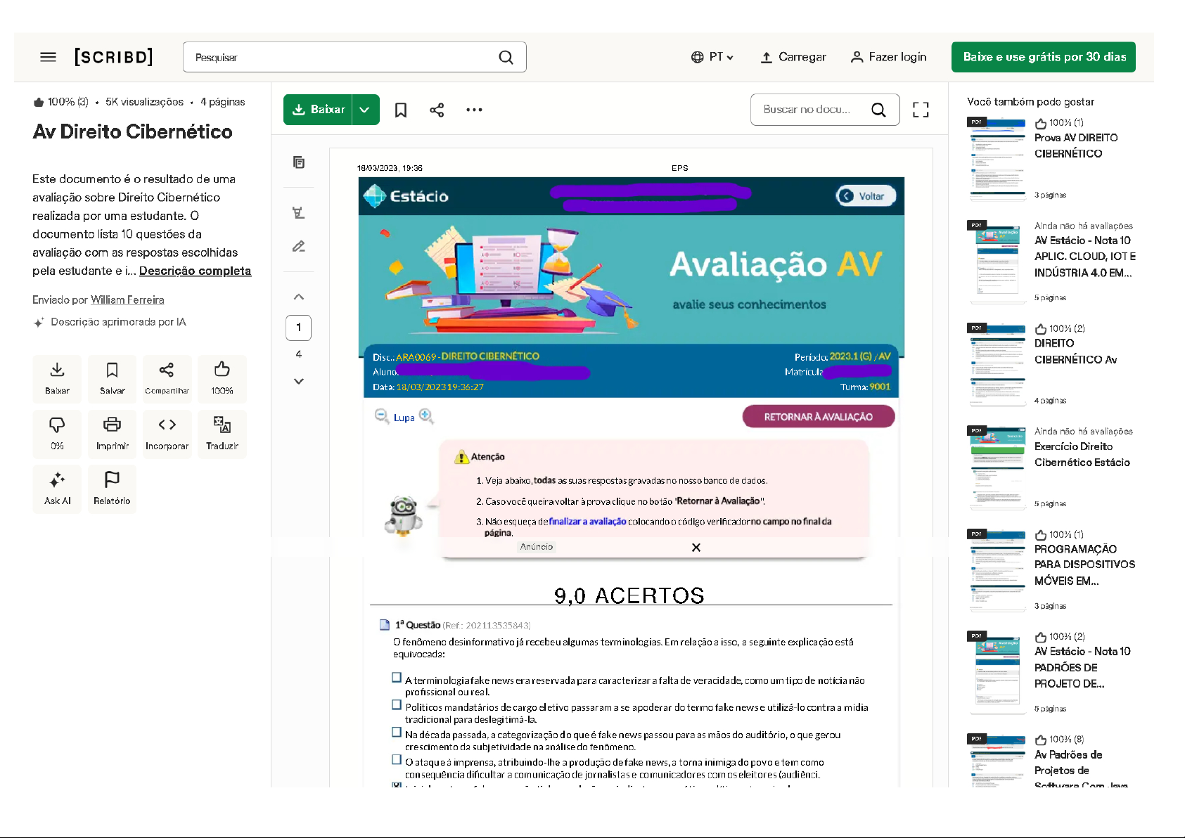 [SCRIBD] Pesquisar PT Carregar Fazer login Baixe e use grátis por 30 dias 100% (3) 5K visualizações 4 páginas Baixar 7 Você também pode gostar Buscar no docu... PDF 100% (1) Av Direito Cibernético Prova AV DIREITO CIBERNÉTICO 19:36 EPS Este documento é resultado de uma avaliação sobre Direito Cibernético Estácioas TaKe news tinnam mais com a satira categorizada como informação e, assim, em contextos de intensa passionalidade de debates elas não serviram para distensionar a abordagem sobre certas questões. 4 páginas PDF Ainda não há avaliações Aplic. de Cloud, lot e Industria 4.0 em Questão (Ref.: 202113535818) Python Em relação ao fenômeno do constitucionalismo digital é INCORRETO afirmar: 5 páginas Existem sentidos harmônicos. Pode ser reconduzido ao ideal de democracia. PDF 100% (3) Existe um só sentido. AV Estácio - 9,0 https://simulado.estacio.br/alunos/ 1/4 PROGRAMAÇÃO PARA DISPOSITIV.. 5 páginas PDF 100% (6) Anúncio Baixe para ler sem anúncios Avs Programação para Dispositivos Móveis 3 páginas PDF 19:36 EPS 100% (1) Simulado Direito Existem sentidos antagônicos. Cibernetico Ava2 Existem dois sentidos. 4 páginas Questão (Ref.: 202113535702) PDF Ainda não há avaliações Sobre a ciência cibernética, é correto dizer que: Direito Cibernético Simulado Surgiu na década de 1920, momento de desenvolvimento da sociedade da informação. Reúne com exclusividade estudos dos dispositivos eletrônicos. Reúne estudos dos dispositivos eletrônicos e dos meios de comunicação entre tais dispositivos. 4 páginas É sinônimo da ciência telemática. É sinônimo da ciência informática. PDF 100% (6) Av Computacao em Nuvem Questão (Ref.: 202113535753) 4 páginas A LGPD é aplicável: PDF 100% (5) Apenas se dados pessoais foram coletados no Brasil. Prova Avs 1 20211 X Se dados pessoais foram coletados no Brasil se a operação de tratamento no Brasil ou ainda se Analise de Dados tratamento de dados tiver objetivo a oferta ou fornecimento de bens ou serviços localizados no Brasil. Apenas se a operação de tratamento foi realizada no Brasil. Estacio de Sá Apenas se tratamento de dados tiver objetivo a oferta ou fornecimento de bens ou serviços localizados 5 páginas no Brasil. Apenas se dados pessoais foram coletados no Brasil ou se a operação de tratamento no Brasil ou ainda setratamento de dados. 100% Simulado Direito Cibernetico Ava1 Questão (Ref.: 202113535732) 6 páginas Na ideia do Direito Digital pode ser compreendido, exceto: PDF 83% (6) A compreensão exclusiva e isolada do Direito em relação às demais ciências. Prova USABILIDADE A forma diferente de como a literatura especializada entende as situações jurídicas. Estácio A alteração na interpretação desenvolvida pelos agentes estatais responsáveis. A mudança dos fatos, a partir dos quais são extraídas as interpretações jurídicas. Alteração dos textos normativos. 3 páginas PDF Ainda não há avaliações PROGRAMAÇÃO Questão (Ref.: 202113535744) PARA DISPOSITIVOS Compliance é um conceit em constante evolução. Atualmente, no entanto, podem ser considerados como seus MÓVEIS EM... principais fundamentos: 6 páginas Governança corporativa, responsabilidade social, sociabilização dos prejuízos e ética empresarial. Autorregulação regulada, conformidade jurídica plena, responsabilidade social e ética empresarial. PDF 100% (4) Governança corporativa, responsabilidade social, responsabilidade ambiental e ética empresarial. Prova 10 Autorregulação regulada, governança corporativa, responsabilidade social e ética empresarial. Desenvolvimento de Governança corporativa, autorregulação regulada, socialização dos prejuízos e responsabilidade social. Software Seguro 12 páginas https://simulado.estacio.br/alunos 2/4 PDF Ainda não há avaliações Objetivos na Fase Inicial de Software 9 páginas Anúncio Baixe para ler sem anúncios PDF 100% (3) Prova de Desenvolvimento de Software Seguro... 19:36 EPS 7 páginas Questão (Ref.: 202113535768) PDF Ainda não há avaliações Acerca do crime de estupro, é CORRETO dizer que: Direito Cibernetico Apenas fica caracterizado com a conjunção carnal, de modo que não se caracteriza como crime cibernético. É crime cibernético puro. Pode ocorrer pelos meios digitais, se há a grave ameaça e constrangimento da vitima a praticar ato 5 páginas libidinoso, ainda que de forma remota. Pela gravidade, é crime cibernético próprio. PDF 100% (2) Pode ocorrer pelos meios digitais, se há a violência e constrangimento da vitima a praticar ato de conjunção Padrões de Projeto carnal, ainda que de forma remota. em Java: Simulado5 páginas Questão (Ref.: 202113535686) PDF 100% (3) Em relação à organização da matéria de propriedade intelectual no Brasil, assinale a alternativa correta: Prova Uml Pela similitude das matérias, a proteção jurídica das invenções é tratada na Lei de Software. A Lei de Software segue regime da Lei de Propriedade Industrial, sobretudo em razão do regime de concorrência desleal. ALei de Direitos Autorais regula, com exclusividade, também programas de computador. 5 páginas Os regimes de direito autoral e de propriedade intelectual, somados, constituem regime de propriedade industrial. PDF 80% (5) X Os regimes de direito autoral e de propriedade industrial, somados, constituem regime de propriedade Prova JAVA Estácio intelectual. 3 páginas Questão (Ref.: 202114219574) PDF 100% (3) No âmbito do Direito Cibernético Privado, existem distinções entre documentos eletrônicos, digitais e AV Sistema digitalizados. Considerando a classificação entre referidos documentos, assinale a alternativa correta. Operacional Documento digitalizado e documento eletrônico não são conceitos equivalentes, mas a diferença tem pouca utilidade prática. Documento digital e documento eletrônico são conceitos equivalentes. 13 páginas Documento digital e documento eletrônico não são c