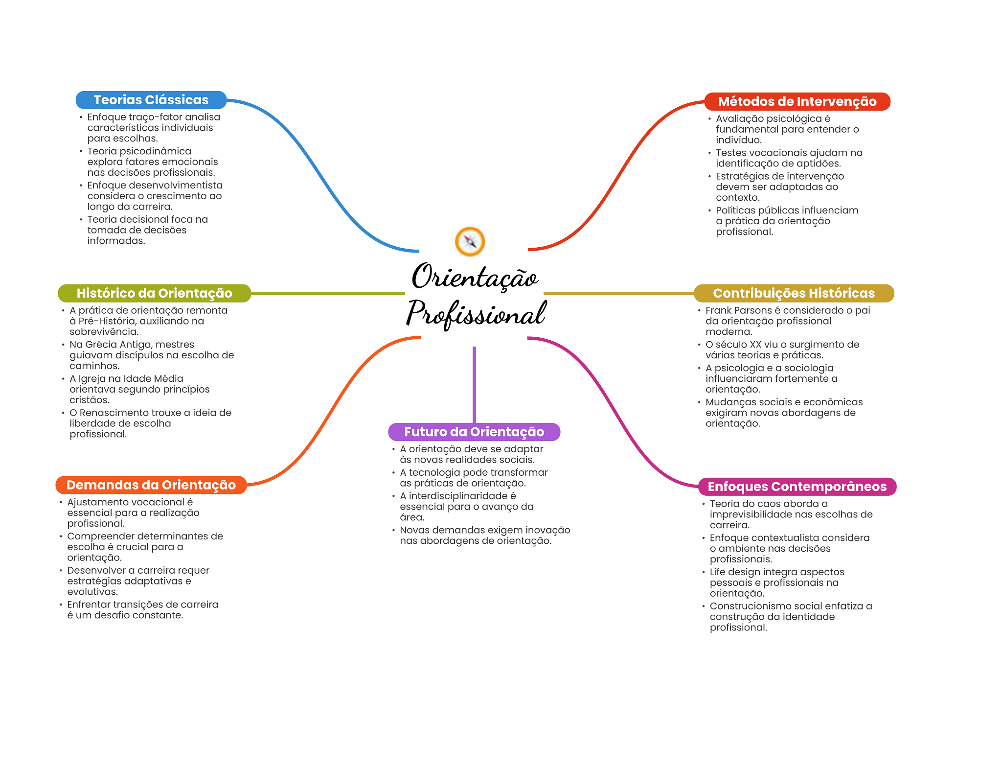 Teorias Clássicas Métodos de Intervenção Enfoque traço-fator analisa Avaliação psicológica é características individuais fundamental para entender para escolhas. indivíduo. Teoria psicodinâmica Testes vocacionais ajudam na explora fatores emocionais identificação de aptidões. nas decisões profissionais. Estratégias de intervenção Enfoque devem ser adaptadas ao considera crescimento ao contexto. longo da carreira. Políticas públicas influenciam Teoria decisional foca na a prática da orientação tomada de decisões profissional. informadas. Orientação Histórico da Orientação Contribuições Históricas A prática de orientação remonta à Pré-História, auxiliando na Profissional Frank Parsons é considerado pai da orientação profissional sobrevivência. moderna. Na Grécia Antiga, mestres século XX viu surgimento de guiavam discípulos na escolha de várias teorias e práticas. caminhos. A psicologia e a sociologia A Igreja na Idade Média influenciaram fortemente a orientava segundo princípios orientação. cristãos. Mudanças sociais e econômicas Renascimento trouxe a ideia de exigiram novas abordagens de liberdade de escolha orientação. profissional. Futuro da Orientação A orientação deve se adaptar às novas realidades sociais. A tecnologia pode transformar Demandas da Orientação as práticas de orientação. Enfoques Contemporâneos A interdisciplinaridade é Ajustamento vocacional é essencial para avanço da Teoria do caos aborda a essencial para a realização área. imprevisibilidade nas escolhas de profissional. carreira. Novas demandas exigem inovação Compreender determinantes de nas abordagens de orientação. Enfoque contextualista considera escolha é crucial para a O ambiente nas decisões orientação. profissionais. Desenvolver a carreira requer Life design integra aspectos estratégias adaptativas e pessoais e profissionais na evolutivas. orientação. Enfrentar transições de carreira Construcionismo social enfatiza a é um desafio constante. construção da identidade profissional.
