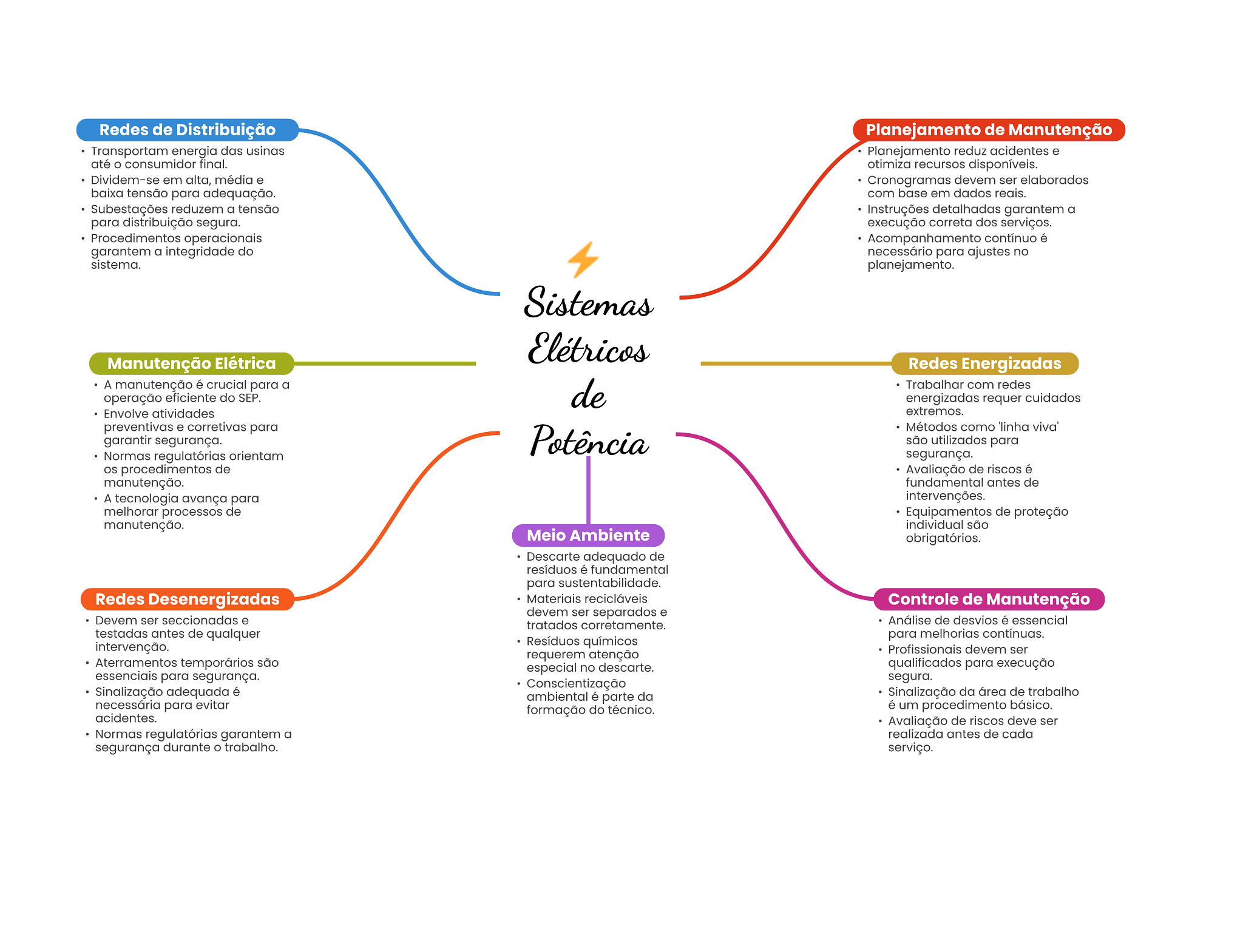 Redes de Distribuição Planejamento de Manutenção Transportam energia das usinas Planejamento reduz acidentes e até consumidor final. otimiza recursos disponíveis. Dividem-se em alta, média e Cronogramas devem ser elaborados baixa tensão para adequação. com base em dados reais. Subestações reduzem a tensão Instruções detalhadas garantem a para distribuição segura. execução correta dos serviços. Procedimentos operacionais Acompanhamento contínuo é garantem a integridade do necessário para ajustes no sistema. planejamento. Sistemas Elétricos Manutenção Elétrica Redes Energizadas A manutenção é crucial para a de Trabalhar com redes operação eficiente do SEP. energizadas requer cuidados Envolve atividades extremos. preventivas e corretivas para Métodos como linha garantir segurança. Potência são utilizados para Normas regulatórias orientam segurança. procedimentos de Avaliação de riscos é manutenção. fundamental antes de A tecnologia avança para intervenções. melhorar processos de Equipamentos de proteção manutenção. individual são Meio Ambiente obrigatórios. Descarte adequado de resíduos é fundamental para sustentabilidade. Redes Desenergizadas Materiais recicláveis Controle de Manutenção devem ser separados e Devem ser seccionadas e tratados corretamente. Análise de desvios é essencial testadas antes de qualquer para melhorias intervenção. Resíduos químicos requerem atenção Profissionais devem ser Aterramentos temporários são especial no descarte. qualificados para execução essenciais para segurança. Conscientização segura. Sinalização adequada é ambiental é parte da Sinalização da área de trabalho necessária para evitar formação do técnico. é um procedimento básico. acidentes. Avaliação de riscos deve ser Normas regulatórias garantem a realizada antes de cada segurança durante O trabalho. serviço.