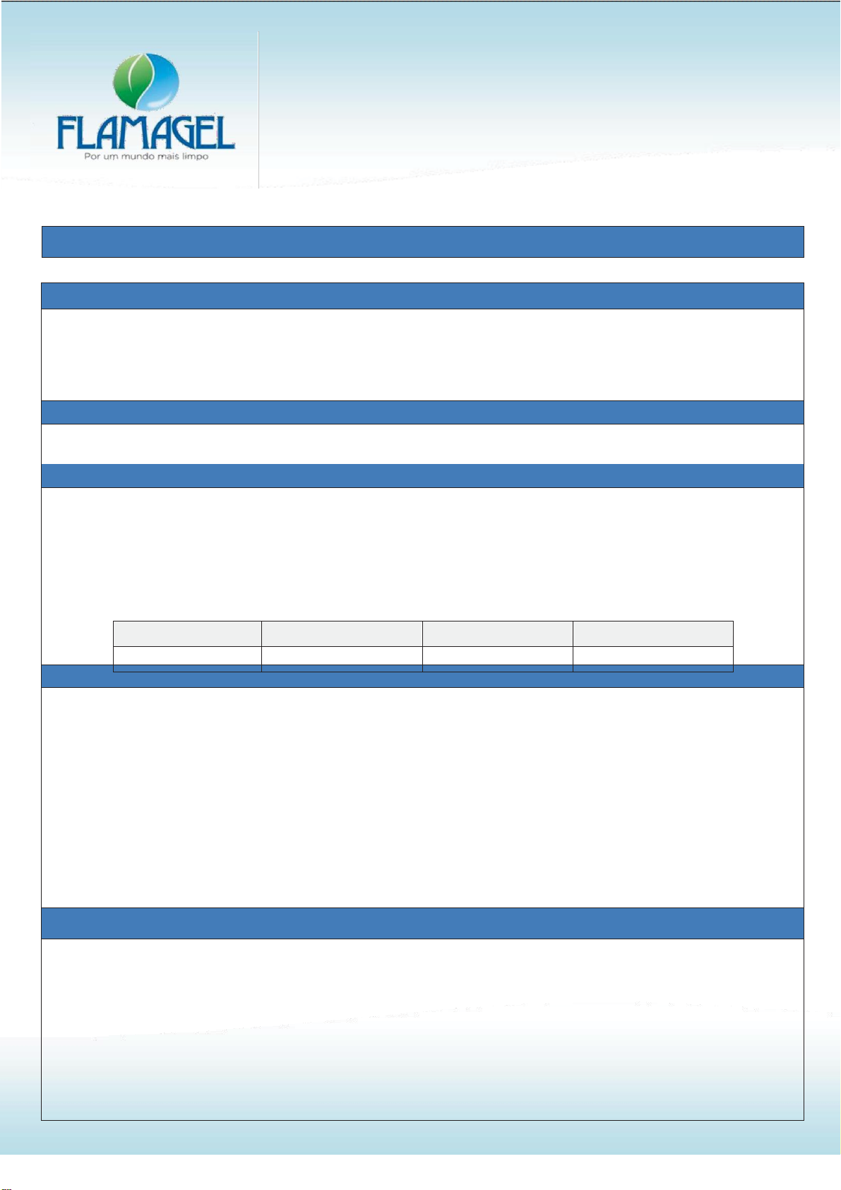 Álcool etílico 70% - antisséptico 1. IDENTIFICAÇÃO DO PRODUTO E DA EMPRESA FLAMAGEL INDÚSTRIA E COMÉRCIO LTDA END: VIA DE PENETRAÇÃO III – CIA SUL – QUADRA 7 LOTE 3 – SIMÕES FILHÕES - BA CEP: 43.700-000 CNPJ: 05.783.874/0001-02 E-mail: adm@flamagel.com.br 2. IDENTIFICAÇÃO DOS PERIGOS Produto inflamável mantenha afastado do fogo e fontes de calor. O contato com os olhos e mucosas pode causar irritação. 3. COMPOSIÇÃO E INFORMAÇÕES SOBRE OS INGREDIENTES Tipo de produto: Solução Nome químico comum ou genérico: Álcool etílico 70% (p/p) Sinônimo: Etanol 70%, álcool Etílico 70% (p/p), solução aquosa de etanol a 70%. Ingredientes que contribuem para o perigo 4. MEDIDAS DE PRIMEIROS SOCORROS Inalação: Levar a vítima para o local arejado e bem ventilado. Se for necessário, fazer respiração artificial e procurar o médico imediatamente. Contato com a pele: Retirar a roupa contaminada, lavar o local com sabão neutro e água fria em abundância. Não aplicar pomadas ou similares. Contato com os olhos: Deixar as pálpebras abertas enquanto lava com água corrente fria. Esta deverá estar limpa e sem pressão. Este procedimento deve durar em torno de 15 minutos. Não aplicar colírio ou similares. Ingestão: Se estiver consciente induzir ao vômito introduzindo o dedo na garganta ou dando grande quantidade de água morna com sal, na proporção de duas colheres por copo de água. Se estiver inconsciente, não ministrar nada via oral. Descrição breve dos principais sintomas e efeitos: Irritação da pele o dos olhos, náusea, vômitos, falta de coordenação, excitação nervosa e depressão. Proteção do prestador de primeiros-socorros: Utilizar equipamentos de proteção individual. Notas para o médico: Em todos os casos encaminhar a vítima ao médico e informar o grau de contaminação. 5. IDENTIFICAÇÃO DE PERIGOS Perigos mais importantes: Produto inflamávelEfeitos do produto: Efeitos adversos à saúde humana: Irritante para os olhos e para a pele. Por inalação excessiva de vapores ou ingestão, pode causar vômito, sudorese, excitação nervosa ou depressão, visão dupla, falta de coordenação, coma, podendo levar à morte. Efeitos ambientais: O escoamento para a rede de esgoto pode criar riscos de fogo ou explosão.Perigos físicos e químicos: Produto inflamável, combustível. Pode inflamar-se com o calor, fagulhas ou chamas. Os recipientes podem explodir com o calor ou fogo. Há riscos de explosão do vapor em ambientes fechados ou abertos em rede de esgotos.Perigos específicos: Produto inflamável, combustível.Principais sintomas: Irritação da pele o dos olhos, náusea, vômitos, falta de coordenação, excitação nervosa e depressão.Classificação do Produto químico: Líquido inflamávelVisão geral de emergências: S2: manter fora do alcance das criançasS7: manter o recipiente bem fechado S16: manter afastado de qualquer chama ou fonte de faísca Não fumar. v FISPQ - FICHA DE INFORMAÇÃO DE SEGURANÇA DE PRODUTOQUÍMICO Revisão: 01 11/02/2019 CAS INGREDIENTE CONC. SIMBOL. Frase R 64-17-5 Etanol: 68 – 72% F11 mailto:adm@flamagel.com.br 6. MEDIDAS DE COMBATE A INCÊNDIO Meios de extinção apropriados: Neblina de água, pó químico seco, gás carbônico ou espuma mecânica para solventes polares. Meio de extinção não apropriados: Não devem ser aplicados jatos d’água diretamente sobre produto em chamas, pois ele pode espalhar-se violentamente e aumentar a intensidade do fogo. Perigos específicos: Pode causar explosões ao deslocar-se à fontes de ignição Métodos especiais: Remover todas as fontes de ignição evitando novas explosões. Proteção dos bombeiros: Equipamento de proteção individual de segurança adequado. 7. MEDIDAS PARA COMBATE DE DERRAMAMENTO OU VAZAMENTO Precauções pessoais Remoção de fontes de ignição: Eliminar fontes de calor ou fogo, não fumar, não fazer faísca. Isolar a área. Controle de poeira: Não aplicável produto líquido. Prevenção da inalação e do contato com a pele, mucosa e olhos: Utilizar os equipamentos de proteção individuais adequados. Precauções para o meio ambiente: Não permitir que atinjam redes de água, esgoto ou fonte hídrica. Sistemas de alarme: Avisar imediatamente os Bombeiros e Defesa Civil Métodos para limpeza Recuperação: Circunscrever e cobrir o vazamento com terra, areia ou outro material absorvente não combustível. Remover a terra contaminada para outro recipiente independente. Não jogar água. Disposição: Deverá ser realizada com acompanhamento de especialista e de acordo com a legislação ambiental vigente. Prevenção de perigos secundários: Eliminar toda fonte de ignição, calor ou fogo. Não fumar, não provocar faíscas. 8. MANUSEIO E ARMAZENAMENTO MANUSEIO Medidas técnicas Prevenção da exposição do trabalhador: Manusear o produto em local ventilado, afastado de fontes de calor e ignição. Prevenção de incêndio e explosão: Manter afastado de fontes de calor e ignição. Precauções para manuseio seguro: Utilizar os equipamentos de proteção individual adequado. Orientações para manuseio seguro: Local bem ventilado. Afastado de fontes de calor e ignição. Não fumar. ARMAZENAMENTO Medidas técnicas apropriadas: Locais limpos e bem ventilados afastados de fontes de calor, ignição e faíscas. Condições de armazenamento Adequadas: Quando em tanques, o local deve ser isolado, cercado, sinalizado e com acesso somente a pessoas autorizadas. Deve possuir escoamento para o sistema de contenção. Em tambores, o local deve ser ventilado, protegido contra intempéries e livre de fontes de calor ou ignição. O piso deve ser impermeável e possuir escoamento para bacia de contenção. Equipamentos elétricos devem ser à prova de explosão. Os tambores devem ser identificados mantidos longe dos produtos incompatíveis. A evitar: Próximo a produtos incompatíveis, fontes de calor e ignição. Produtos e materiais incom