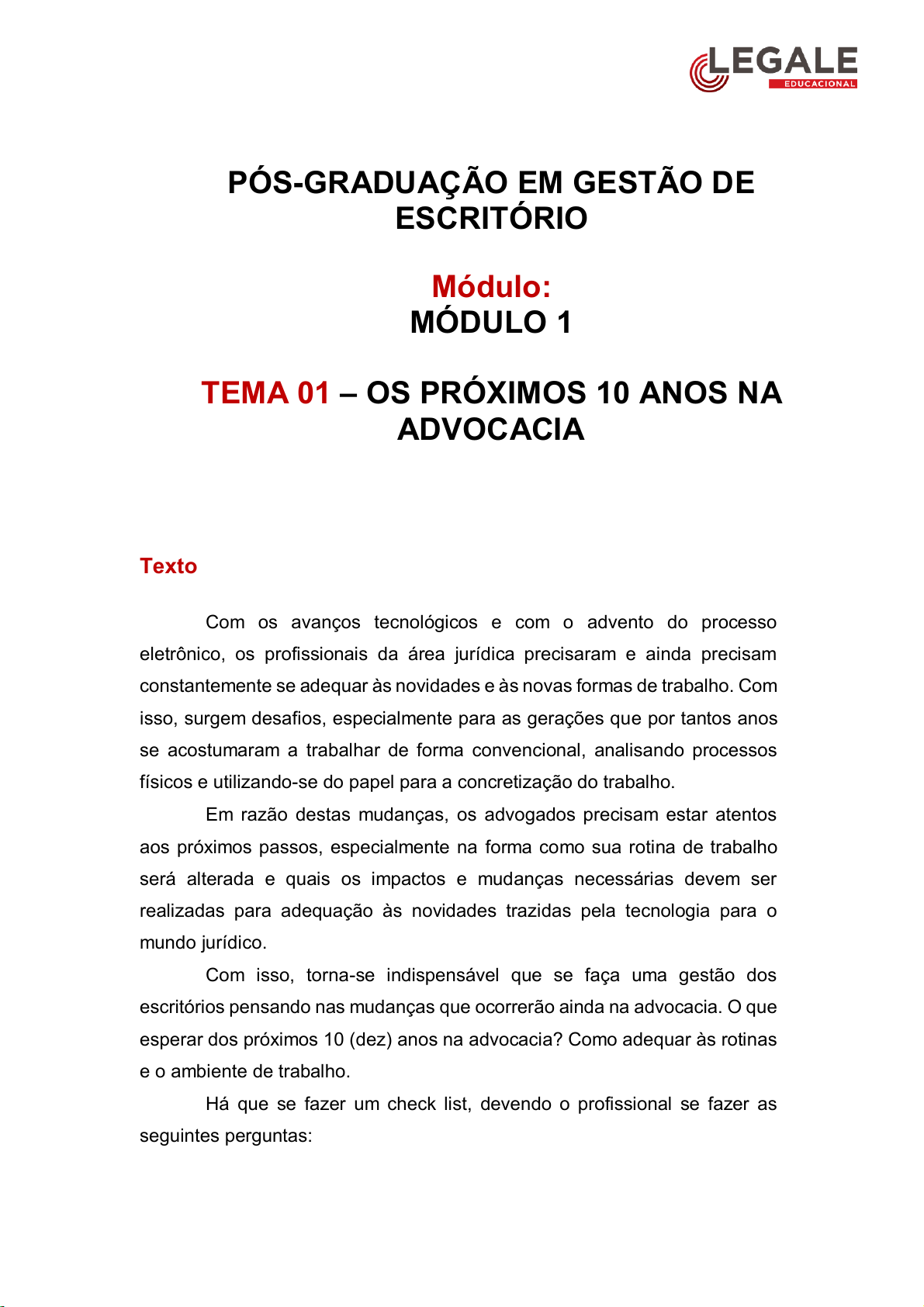PÓS-GRADUAÇÃO EM GESTÃO DE ESCRITÓRIO Módulo: MÓDULO 1 TEMA 01 – OS PRÓXIMOS 10 ANOS NA ADVOCACIA Texto Com os avanços tecnológicos e com o advento do processo eletrônico, os profissionais da área jurídica precisaram e ainda precisam constantemente se adequar às novidades e às novas formas de trabalho. Com isso, surgem desafios, especialmente para as gerações que por tantos anos se acostumaram a trabalhar de forma convencional, analisando processos físicos e utilizando-se do papel para a concretização do trabalho. Em razão destas mudanças, os advogados precisam estar atentos aos próximos passos, especialmente na forma como sua rotina de trabalho será alterada e quais os impactos e mudanças necessárias devem ser realizadas para adequação às novidades trazidas pela tecnologia para o mundo jurídico. Com isso, torna-se indispensável que se faça uma gestão dos escritórios pensando nas mudanças que ocorrerão ainda na advocacia. O que esperar dos próximos 10 (dez) anos na advocacia? Como adequar às rotinas e o ambiente de trabalho. Há que se fazer um check list, devendo o profissional se fazer as seguintes perguntas: - 01397733551 - Quais são os sinais da mudança? Você tem olhado o seu negócio de fora para dentro? - Quais são os eventos ou novas tecnologias que, se combinadas, podem alterar radicalmente o mercado? - O que é ou pode ser o novo, uma “irregularidade”, uma anomalia ou curva na estrada, uma mudança iminente? É certo que são perguntas subjetivas e que as respostas não são fáceis de serem encontradas. Porém, o que se verifica é que a partir destas premissas, o profissional poderá ter ideias relevantes e desenvolver seu trabalho, de forma a estar preparado para o futuro que se aproxima tão rapidamente. Neste sentido, há que se pensar que a tecnologia é realidade em nossas vidas. Além disso, é extremamente relevante porque é por seu intermédio, que são liberados recursos que antes eram escassos e ao alcance de poucos (que dispusessem de recursos financeiros) e hoje se revelam abundantes e ao alcance de vários profissionais. A nova realidade amparada nos recursos tecnológicos e na conectividade, permite que o profissional trabalhe de qualquer lugar. Basta que disponha de instrumentos que possam acompanhá-lo como um notebook e uma conexão de internet. Com isso, é possível que os problemas sejam resolvidos de qualquer lugar e a qualquer momento. Não existe também mais a necessidade de se adequar a um horário padrão de trabalho, pois, especialmente o advogado não tem mais sua rotina de labor limitada ao horário de expediente dos fóruns. Por outro lado, novos setores e áreas da advocacia estão surgindo. A abundância de informações e a ampla divulgação de conhecimento abre um mudo de possibilidades. Com o avanço tecnológico, as empresas passam a ter acesso a novas formas de prestar seus serviços, explorar o mercado e assim, poder alcançar resultados maiores. As empresas que conseguem se desenvolver e fazer uso da tecnologia, poderão ter resultados bem superiores a de seus pares. A partir desta premissa, surge o conceito de organização exponencial (ExOs). - 01397733551 O termo Organizações Exponenciais foi criado por Salim Ismail, CEO da Singularity University, em obra de mesmo nome 1 . Seu livro trata de empresas que se utilizam da tecnologia para sua estruturação, afastando-se de ideias tradicionais, o que leva a um crescimento superior a de seus concorrentes. A definição do termo Organização Exponencial (ExO) é daquela empresa que apresenta resultado desproporcionalmente grande, se comparado a de seus pares, justamente em razão do uso de novas tecnologias2. As Organizações Exponenciais se destacam justamente por se adaptarem à nova realidade e surgem exatamente para se contrapor às chamadas Organizações Lineares. As Organizações Lineares, por sua vez, são tradicionais, tem uma estrutura hierárquica e tem como objetivo, a aquisição de investidores para a realização de suas operações. Por outro lado, as Organizações Exponenciais possuem uma menor quantidade de colaboradores e ativos, mas fazem uso da tecnologia para que consigam um crescimento, como o próprio nome sugere, exponencial. O Prof. Ricardo Freitas Silveira, em aula proferida no Curso de Pós- Graduação da Faculdade Legale afirma que a Organização Exponencial: “é aquela cujo impacto (ou resultado) é desproporcionalmente grande – pelo menos 10 vezes maior – comparado aos seus pares, devido ao uso de novas técnicas organizacionais que alavancam as tecnologias aceleradas.” Assim, o mencionado professor, cita alguns exemplos de Organizações Lineares e Exponenciais bastante populares, o que permite uma compreensão melhor da diferença delas. 1 Fonte: Revista Trip. Disponível em: https://revistatrip.uol.com.br/trip/salim-ismail- presidente-da-singularity-university. Acesso em 21 nov. 2022. 2 Fonte: Disponível em: https://blog.aevo.com.br/organizacoes- exponenciais/#:~:text=Empresas%20lineares%20s%C3%A3o%20caracterizadas%20p or,quantidade%20de%20ativos%20ou%20colaboradores. Acesso em 21 nov. 2022. - 01397733551 LINEAR X EXPONENCIAL ORGANIZAÇÕES LINEARES ORGANIZAÇÕES EXPONENCIAIS Iridium Kodak Polaroid Philco Blockbuster Nokia Google Tesla Netflix Airbnb Facebook Wase Uber Para melhor compreensão de como as Organizações Exponenciais se implementam, necessário estudar os 6Ds do crescimento exponencial, conforme ilustração apresentada pelo Prof. Ricardo Freitas Silveira: - 01397733551 Os 6d´s das tecnologias exponenciais foram definidos por Peter Diamandis, cofundador da Singularity University, acima mencionada. Conforme explica Jamille Rocha, “O 6D exponencial, de certa forma, explica o crescimento acelerado das novas tecnologias por meio das etapas que são: digitalização, decepção, disrupção, desmonetização, desmaterialização e democratização.” Acerca de cada uma das disc