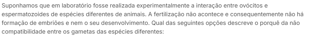 Suponhamos que em laboratório fosse realizada experimentalmente a interação entre ovócitos e espermatozoides de espécies diferentes de animais. A fertilização não acontece e consequentemente não há formação de embriões e nem seu desenvolvimento. Qual das seguintes opções descreve porquê da não compatibilidade entre gametas das espécies diferentes: