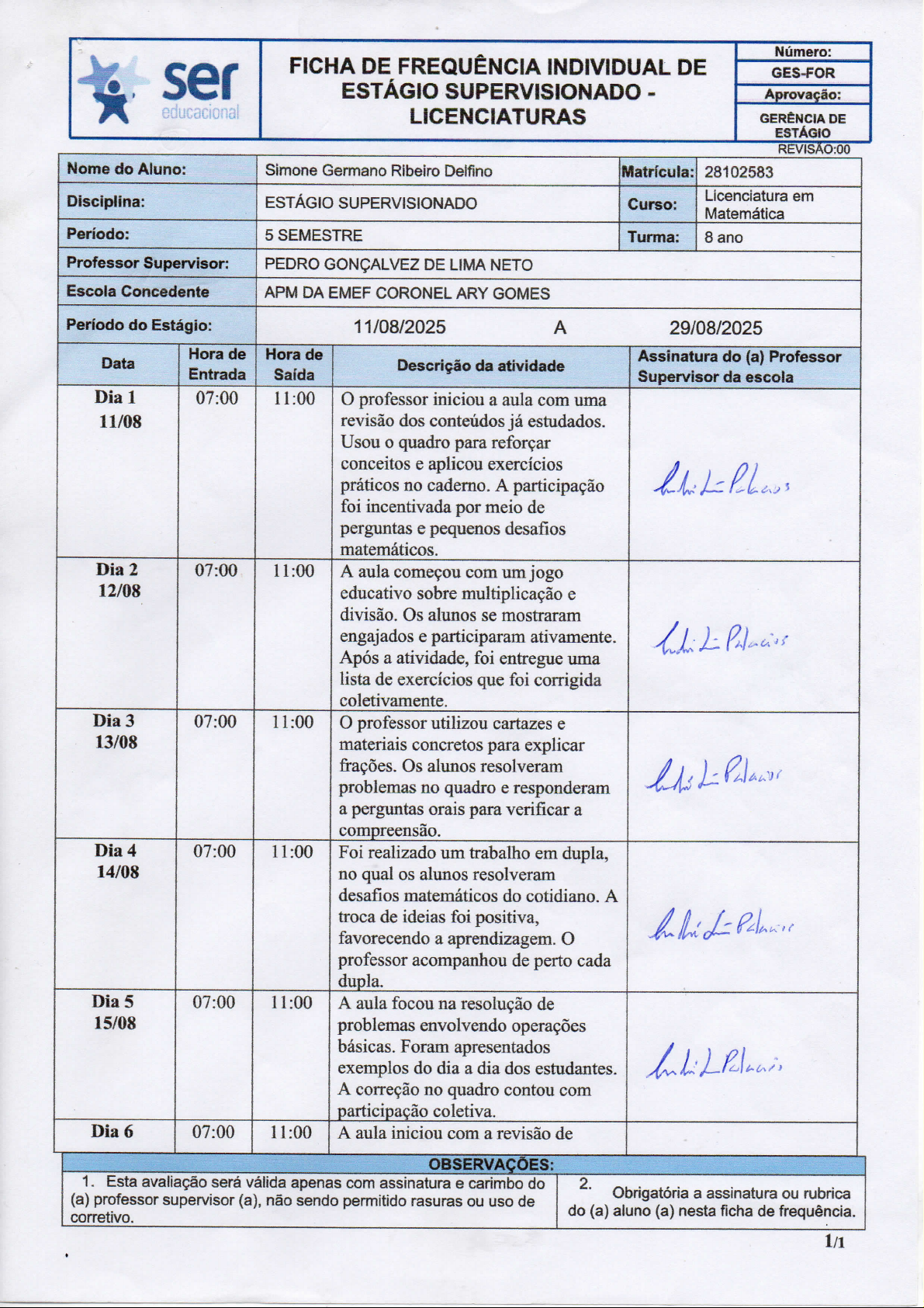 Número: ser FICHA DE FREQUÊNCIA INDIVIDUAL DE GES-FOR ESTÁGIO SUPERVISIONADO Aprovação: educacional LICENCIATURAS GERÊNCIA DE ESTÁGIO REVISÃO:00 Nome do Aluno: Simone Germano Ribeiro Delfino Matrícula: 28102583 Disciplina: ESTÁGIO SUPERVISIONADO Licenciatura em Curso: Matemática Período: 5 SEMESTRE Turma: 8 ano Professor Supervisor: PEDRO GONÇALVEZ DE LIMA NETO Escola Concedente APM DA EMEF CORONEL ARY GOMES Período do Estágio: 11/08/2025 A 29/08/2025 Hora de Hora de Data Assinatura do (a) Professor Entrada Descrição da atividade Saída Supervisor da escola Dia 1 07:00 11:00 professor iniciou a aula com uma 11/08 revisão dos conteúdos já estudados. Usou o quadro para reforçar conceitos e aplicou exercícios práticos no caderno. A participação foi incentivada por meio de perguntas e pequenos desafios matemáticos. Dia 2 07:00 11:00 A aula começou com um jogo 12/08 educativo sobre multiplicação e divisão. Os alunos se mostraram engajados e participaram ativamente. Após a atividade, foi entregue uma lista de exercícios que foi corrigida coletivamente. Dia 3 07:00 11:00 O professor utilizou cartazes e 13/08 materiais concretos para explicar frações. Os alunos resolveram problemas no quadro e responderam a perguntas orais para verificar a compreensão. Dia 4 07:00 11:00 Foi realizado um trabalho em dupla, 14/08 no qual os alunos resolveram desafios matemáticos do cotidiano. A troca de ideias foi positiva, favorecendo a aprendizagem. professor acompanhou de perto cada dupla. Dia 5 07:00 11:00 A aula focou na resolução de 15/08 problemas envolvendo operações básicas. Foram apresentados exemplos do dia a dia dos estudantes. A correção no quadro contou com participação coletiva. Dia 6 07:00 11:00 A aula iniciou com a revisão de OBSERVAÇÕES: 1. Esta avaliação será válida apenas com assinatura e carimbo do 2. (a) professor supervisor (a), não sendo permitido rasuras ou uso de Obrigatória a assinatura ou rubrica corretivo. do (a) aluno (a) nesta ficha de frequência. 1/1Número: ser FICHA DE FREQUÊNCIA INDIVIDUAL DE GES-FOR ESTÁGIO SUPERVISIONADO Aprovação: educacional LICENCIATURAS GERÊNCIA DE ESTÁGIO REVISÃO:00 18/08 expressões numéricas. professor propôs exercícios graduais, do mais simples ao mais complexo, observando as dificuldades e L- esclarecendo dúvidas individualmente. Dia 7 07:00 11:00 Foi realizada uma atividade lúdica 19/08 com perguntas rápidas (quiz) sobre múltiplos e divisores. Os alunos participaram com entusiasmo. Após a dinâmica, resolveram exercícios em grupo. Dia 8 07:00 11:00 O professor trabalhou com situações- 20/08 problema envolvendo porcentagens. Explicou passo a passo no quadro e depois distribuiu exercícios L- individuais, corrigindo-os coletivamente. Dia 9 07:00 11:00 Os alunos fizeram um trabalho em 21/08 grupos de quatro sobre frações equivalentes. professor circulou entre os grupos, auxiliando e avaliando a participação. Dia 10 07:00 11:00 O conteúdo abordado foi geometria 22/08 básica. O professor utilizou régua e compasso para explicar figuras planas. Os alunos construíram L- exemplos no caderno e compartilharam suas produções. Dia 11 07:00 11:00 Foi realizada uma atividade de 25/08 revisão geral. O professor retomou os principais pontos das aulas anteriores e esclareceu dúvidas antes da atividade avaliativa. 07:00 11:00 Os alunos realizaram uma atividade Dia 12 avaliativa escrita sobre operações 26/08 fundamentais e frações. O professor os orientou a manter a calma e se concentrar. Dia 13 07:00 11:00 Após a avaliação, professor 27/08 promoveu uma roda de conversa sobre os erros mais comuns encontrados. Os alunos participaram refletindo sobre suas dificuldades e avanços. OBSERVAÇÕES: 1. Esta avaliação será válida apenas com assinatura e carimbo do 2. (a) professor supervisor (a), não sendo permitido rasuras ou uso de Obrigatória a assinatura ou rubrica corretivo. do (a) aluno (a) nesta ficha de frequência. 2/1Número: FICHA DE FREQUÊNCIA INDIVIDUAL DE ser GES-FOR ESTÁGIO SUPERVISIONADO Aprovação: educacional LICENCIATURAS GERÊNCIA DE ESTÁGIO REVISÃO:00 Dia 14 07:00 11:00 A aula foi dedicada a problemas 28/08 matemáticos aplicados ao cotidiano (ex.: compras, descontos e aumentos). Os alunos resolveram em grupo e depois compartilharam suas estratégias no quadro. Dia 15 07:00 11:00 Encerrando período, o professor 29/08 fez uma atividade de integração com desafios matemáticos em forma de competição saudável. A participação foi ativa e clima de colaboração marcou a aula. OBSERVAÇÕES: 1. Esta avaliação será válida apenas com assinatura e carimbo do 2. Obrigatória a assinatura ou rubrica (a) professor supervisor (a), não sendo permitido rasuras ou uso de do (a) aluno (a) nesta ficha de frequência. corretivo. 3/1Número: ser FICHA DE FREQUÊNCIA INDIVIDUAL DE GES-FOR ESTÁGIO SUPERVISIONADO Aprovação: educacional LICENCIATURAS GERÊNCIA DE ESTÁGIO REVISÃO:00 1. Introdução O estágio supervisionado é uma etapa essencial na formação do professor, pois possibilita a articulação dos conhecimentos teóricos adquiridos no curso com a prática pedagógica em sala de aula. Durante o período de 11 de agosto a 29 de agosto de 2025, realizei estágio supervisionado na EMEF Coronel Ary Gomes, acompanhando a turma do 8° ano do Ensino Fundamental II, sob orientação do professor regente da disciplina de Matemática. O objetivo do estágio foi observar, participar e contribuir com as práticas pedagógicas, bem como refletir sobre os desafios e possibilidades do ensino de Matemática, incentivando a aprendizagem ativa, raciocínio lógico e a resolução de problemas aplicados ao cotidiano dos estudantes. 2. Desenvolvimento das Atividades Durante o estágio, as atividades realizadas foram diversificadas, contemplando momentos de observação, participação ativa e aplicação de estratégias didáticas inovadoras. Abaixo descrevo o desenvolvime