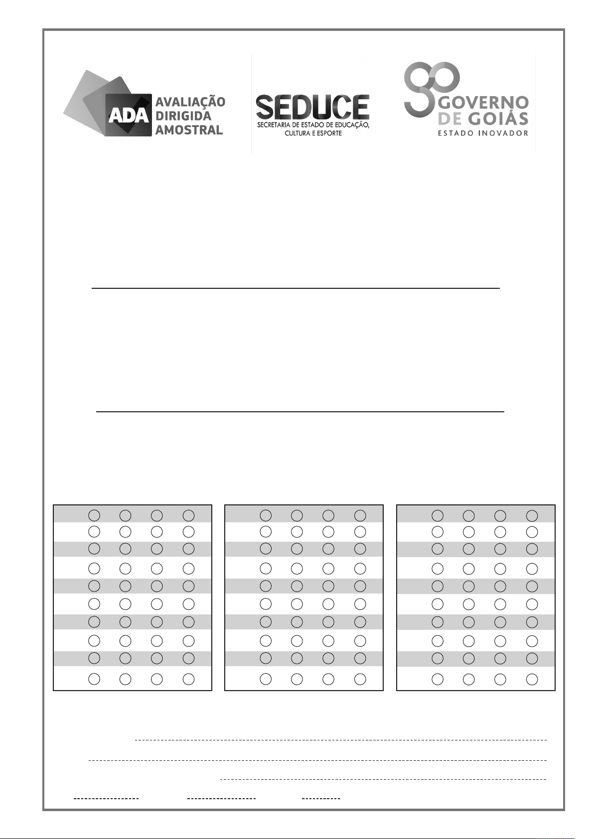 CARTÃO RESPOSTA Nome da Escola: Cidade: Nome completo do(a) estudante: Ano: Turma: Idade: Sexo: ( ) Masculino ( ) Feminino AVALIAÇÃO DIRIGIDA AMOSTRAL – ADA 1ª ETAPA – CICLO II – 2017 4º ANO DO ENSINO FUNDAMENTAL CIÊNCIAS DA NATUREZA LÍNGUA PORTUGUESA / MATEMÁTICA CIÊNCIAS DA NATUREZA 2 3 4 5 6 7 8 9 10 1 A B C D A B C D A B C D A B C D A B C D A B C D A B C D A B C D A B C D A B C D LÍNGUA PORTUGUESA MATEMÁTICA 2 3 4 5 6 7 8 9 10 1 A B C D A B C D A B C D A B C D A B C D A B C D A B C D A B C D A B C D A B C D 2 3 4 5 6 7 8 9 10 1 A B C D A B C D A B C D A B C D A B C D A B C D A B C D A B C D A B C D A B C D Avaliação Dirigida Amostral da Secretaria de Estado de Educação, Cultura e Esporte - 2017 1 ITEM 1 De acordo com os hábitos alimentares, os seres vivos são classificados em produtores, consumidores e decompositores. Observe a figura. Disponível em:. Acesso em: 09 mar.2017. Na cadeia alimentar, os seres vivos produtores são (A) as plantas. (B) os insetos. (C) os pássaros. (D) os fungos e as bactérias. ITEM 2 Observe a imagem. Disponível em: Acesso em: 08 mar. 2017. Os seres vivos que realizam a decomposição dos alimentos, fazendo com que eles apodreçam, são chamados de (A) herbívoros. (B) carnívoros. (C) produtores. (D) decompositores. ITEM 3 Na fotossíntese, processo pelo qual as plantas produzem seu próprio alimento, são necessários os seguintes elementos chamados abióticos ou não vivos: (A) luz solar, água e gás carbônico. (B) água, oxigênio e sais minerais. (C) água, açúcar e sais minerais. (D) oxigênio, gás carbônico e água. ITEM 4 Conforme as diferentes funções que os seres vivos desempenham na cadeia alimentar eles são classificados em: produtores, consumidores ou decompositores. Um exemplo de ser vivo decompositor é (A) a ameba. (B) a bactéria. (C) o caramujo. (D) o gambá. ITEM 5 Um ecossistema, para estar em equilíbrio, depende da interação entre os seres vivos e o ambiente. Assim, se forma a cadeia alimentar que é o percurso de troca de matéria e energia entre os seres vivos. Observe a imagem. Disponível em:. Acesso em: 30 jan. 2017 (adaptado). Nesta cadeia alimentar, os seres consumidores são (A) a planta e o gafanhoto. (B) o gafanhoto e o sapo. (C) a planta e os fungos. (D) o sapo e os fungos. ENSINO FUNDAMENTAL - 4º ANO CIÊNCIAS DA NATUREZA Avaliação Dirigida Amostral da Secretaria de Estado de Educação, Cultura e Esporte - 2017 2 ENSINO FUNDAMENTAL - 4º ANO ITEM 8 Para a existência de vida na Terra, as plantas realizam a fotossíntese utilizando uma fonte natural de energia que é (A) a Lua. (B) o planeta. (C) o Sol. (D) o universo. ITEM 9 Para realizar a fotossíntese, as plantas necessitam de água, clorofila, gás carbônico e (A) luz. (B) terra. (C) adubo. (D) sombra. ITEM 10 Existe um processo no qual as plantas utilizam basicamente água, gás carbônico retirado do ar e luz para produzir seu próprio alimento. Este processo é chamado de (A) clorofila. (B) nutrição. (C) respiração. (D) fotossíntese. ITEM 6 Observe a imagem. Disponível em:. Acesso em: 06 fev. 2017. O desmatamento realizado nas florestas é uma atitude que prejudica a cadeia alimentar pois diminui, principalmente, a quantidade de seres (A) carnívoros. (B) produtores. (C) consumidores. (D) decompositores. ITEM 7 Em uma escola havia um jardim com insetos que se alimentavam das folhas das plantas. Os pássaros daquela região se alimentavam comendo os insetos. Disponível em:. Acesso em: 10 mar. 2017 (adaptado). O jardineiro resolveu usar um inseticida (veneno) para matar os insetos que estragavam as plantas ao se alimentarem de suas folhas. Com esta atitude o jardineiro poderá (A) ajudar a alimentação das plantas do jardim. (B) contribuir com a alimentação dos insetos. (C) melhorar a vida dos pássaros. (D) afastar os pássaros do jardim. Avaliação Dirigida Amostral da Secretaria de Estado de Educação, Cultura e Esporte - 20173 Se pensa que passa, Melhor não passar Inhac, inhac. CAPPARELLI, Sergio. Os meninos morcegos. In: revista Ciência Hoje das Cri- anças. Poema originalmente publicado em 1999. ITEM 2 Nos versos “Fingem que dormem/ Estão acesos”, a palavra “acesos” significa que os meninos estão (A) alegres. (B) nervosos. (C) acordados. (D) dependurados. Leia o texto e, a seguir, responda o item 3. A galinha-d`angola Vinícius de Moraes Coitada Da galinha- -D`angola Não anda Regulando Da bola Não para De comer A matraca E vive A reclamar Que está fraca: – “Tou fraca! Tou fraca!” MORAES, Vinicius de. A galinha-d`angola. In: A arca de Noé: Poemas infantis. São Paulo: Companhia das Letrinhas, 1991, p. 44. ITEM 3 Podemos identificar a opinião do autor sobre a galinha-d`angola em (A) “Tou fraca! Tou fraca!”. (B) “Coitada da galinha-d`angola”. (C) “Não para de comer a matraca”. (D) “E vive a reclamar que está fraca”. LÍNGUA PORTUGUESA Leia o texto e, a seguir, responda o item 1. Bichos Conheci uma minhoca nascida em Piracicaba, que tem um sonho dourado: subir na vida e, um dia, ser um bicho de goiaba. CIÇA. Bichos. São Paulo: FTD, 1994. Fragmento Paulo: Companhia das Letras, 1991. ITEM 1 Nesse texto, a expressão “subir na vida” significa (A) ficar mais alta. (B) mudar de cidade. (C) ter um sonho feliz. (D) melhorar de situação. Leia o texto e, a seguir, responda o item 2. Os meninos morcegos Sérgio Capparelli Os meninos Da Vila Sossego Viraram morcego. Pernas para cima Cabeças para o ar. Passa um mosquito Inhac Outro mosquito, Inhac Pernas para cima Cabeças para o ar. Os meninos Da Vila Sossego Viraram Morcego. Fingem que dormem Estão acesos ENSINO FUNDAMENTAL - 4º ANO Avaliação Dirigida Amostral da Secretaria de Estado de Educação, Cultura e Esporte - 2017 4 ENSINO FUNDAMENTAL - 4º ANO Leia o texto e, a seguir, responda o item 4. Tamanduá dodói Maria Augusta de Medeiros Eu não sei quem inventou Coisa que é tão condenada, Mas foram fazer queimada E
