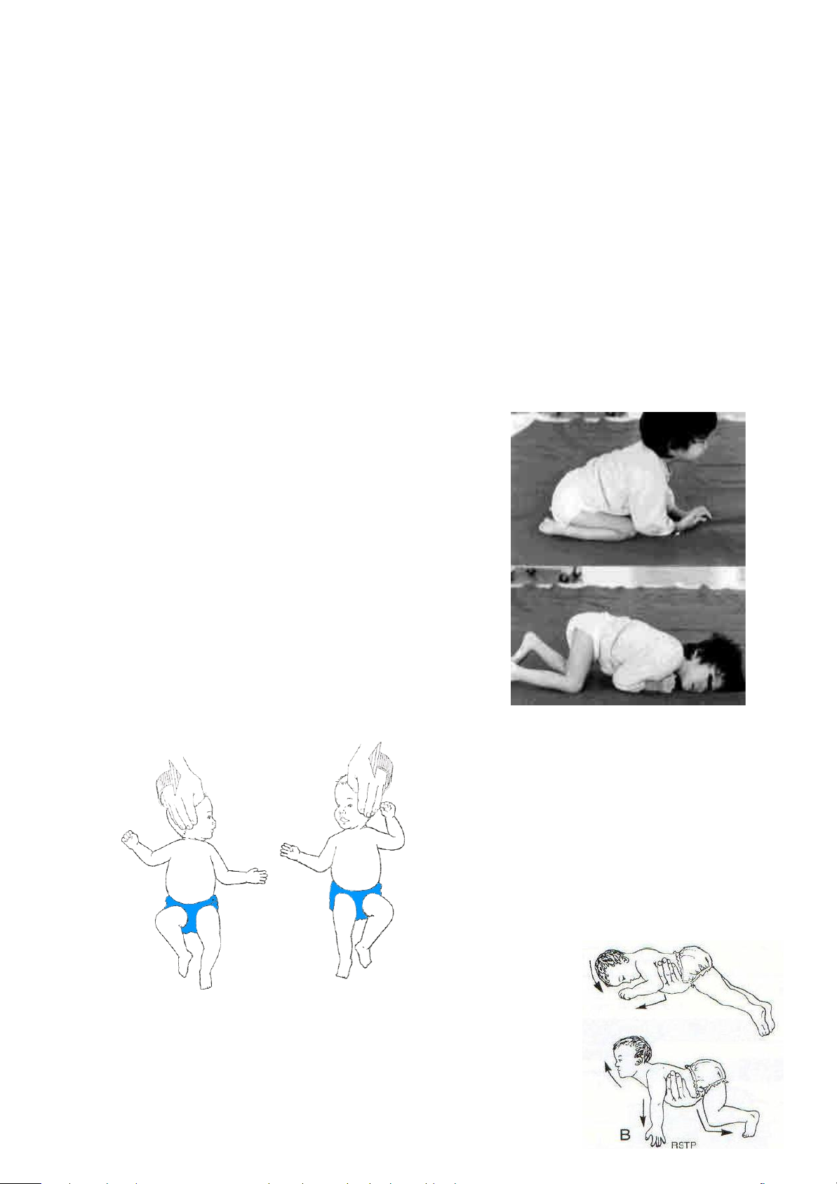 REFLEXOS DO RECÉM NASCIDO Reflexos: resposta obrigatória a determinado estímulo Reações: respostas que permitem uma variabilidade e que se modificam com a maturação do snc Movimentos do RC - Reflexos inatos reflexo - estímulo - resposta Reflexos persistentes: desenvolvimento de habilidades motoras da criança: lesão cerebral REFLEXO TÔNICO CERVICAL ASSIMÉTRICO (RTCA) - posição de esgrima - Estímulo: cabeça virada para o lado - Resposta: MS e MI do lado da face estendidos - MS e MI do lado oposto fletidos - Período: nascimento aos 6 meses - Lado que a criança olha é flexão e o outro em extensão EFEITOS NEGATIVOS: - Alimentação - Acompanhamento visual - Uso das mãos na linha média - Uso bilateral das mãos - Rolar - Desenvolvimento do engatinhar - Deformidades esqueléticas (escoliose, (sub)luxação do quadril) REFLEXO TÔNICO CERVICAL SIMÉTRICO (RTCS) - Estímulo: flexão ou extensão da cabeça - Resposta: Flexão: MS flexionados e MI estendidos e Extensão: MS estendidos e MMI flexionados - Período: 6 ao 8 meses EFEITOS NEGATIVOS: - Descarga de peso nos MMSS em prono - - Posição de Gatas - Engatinhar reciprocamente - Equilíbrio sentado ao olhar ao redor - Uso das mãos para explorar objetos na posição sentada REFLEXO TÔNICO LABIRÍNTICO (RTL) - Estímulo: posição do labirinto em relação a cabeça - Resposta - DV: corpo e membros em extensão - DD : Corpo e membros em flexão - Período: Nascimento aos 6 meses EFEITOS NEGATIVOS - Capacidade de iniciar o rolar - DV para sentado flexionado tronco e quadris - Equilíbrio na posição sentada ou ortostática Júlia Cardoso - Fisio 103 REFLEXO DE GALANT - Estímulo: toque na pele ao longo da coluna do ombro ao quadril - Resposta: flexão lateral para o lado do estímulo - Período: até 2 meses EFEITOS NEGATIVOS: - Equilíbrio na posição sentada - Escoliose REFLEXO DE PREENSÃO PALMAR - Estímulo: pressão na palma da mão, lado ulnar - Resposta: flexão dos dedos causando preensão - Período: nascimento aos 4 meses EFEITOS NEGATIVOS: - Capacidade de apreender e soltar objetos - Descarga de peso nas mãos (engatinhar, reações de proteção) REFLEXO DE PREENSÃO PLANTAR: - Estímulo: preensão na base dos dedos do pé - Resposta: flexão dos dedos do pé - Período EFEITOS NEGATIVOS: - Capacidade de ficar de pé - Reações de equilíbrio - Transferência de peso REFLEXO FUNDAMENTAL (de busca) - Estímulo: toque na bochecha - Resposta: Gira a cabeça com a boca aberta - Período: 28 semanas de gestação aos 3 meses EFEITOS NEGATIVOS - Desenvolvimento motor oral - Controle da cabeça na linha média - Endireitamento ótico - Acompanhamento visual - Interação social Júlia Cardoso - Fisio 103 REFLEXO DE MORO - Estímulo: queda da cabeça em extensão, movimentação abrupta - Resposta: MS em abdução, com extensão dos dedos, adução dos ms, choro - Período: 28 semanas de gestação aos 5 meses EFEITOS NEGATIVOS: - Reações de equilíbrio na posição sentada - Resposta de proteção na posição sentada - Coordenação olho-mão - Acompanhamento visual REFLEXO DE SUSTENTAÇÃO POSITIVA - Estímulo: peso colocado no coxim do pé na posição ereta - Resposta: enrijece os membros MMII e tronco em extensão - Período: 35 semanas de gestação aos 2 meses. Astasia e Abasia vão se tornando voluntário. EFEITOS NEGATIVOS: - Posição ortostática e marcha - Reações de equilíbrio - Transferência de peso REFLEXO DE MARCHA - Estímulo: Sustentação da posição ereta com as plantas dos pés na superfície - Resposta: Flexão e extensão recíproca dos MMII - Período: 38 semanas de gestação aos 2 meses EFEITOS NEGATIVOS: - Posição ortostática e marcha - Reações de equilíbrio - Transferência de peso - Desenvolvimento de movimentos recíprocos Júlia Cardoso - Fisio 103