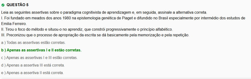 QUESTÃO 5 Leia as seguintes assertivas sobre paradigma cognitivista de aprendizagem e, em seguida, assinale a alternativa correta. Foi fundado em meados dos anos 1980 na epistemologia genética de Piaget e difundido no Brasil especialmente por intermédio dos estudos de Emilia Ferreiro. II. Tirou foco do método e situou-o no aprendiz, que progressivamente 0 princípio alfabético. III. Preconizou que 0 processo de apropriação da escrita se dá basicamente pela memorização e pela repetição. a) Todas as assertivas estão corretas. b) Apenas as assertivas I e estão corretas. C ) Apenas as assertivas I e III estão corretas. d) Apenas a assertiva III está correta. e ) Apenas a assertiva está correta.