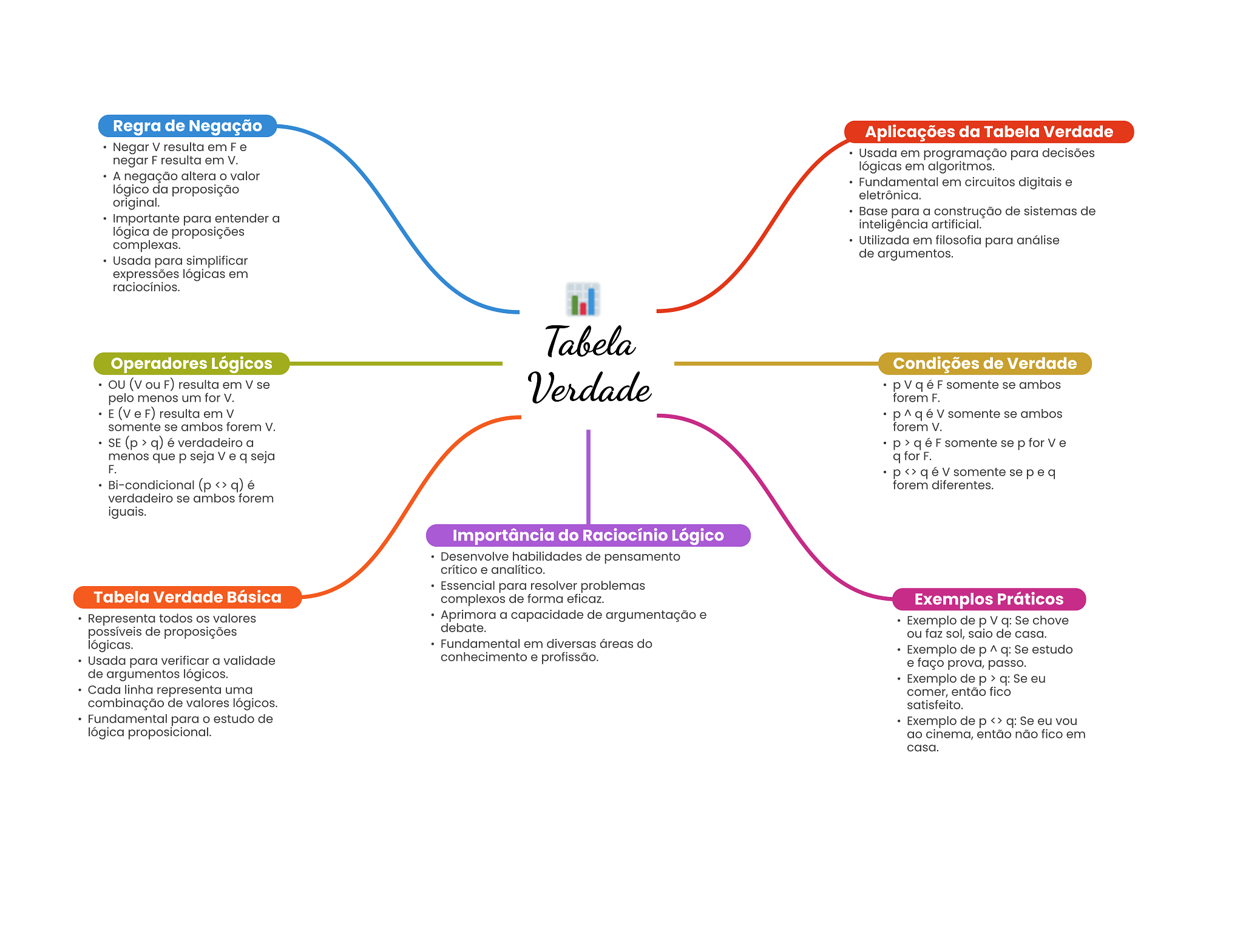 Regra de Negação Aplicações da Tabela Verdade Negar V resulta em F e Usada em programação para decisões negar F resulta em V. lógicas em algoritmos. A negação altera valor Fundamental em circuitos digitais e lógico da proposição eletrônica. original. Base para a construção de sistemas de Importante para entender a lógica de proposições inteligência artificial. complexas. Utilizada em filosofia para análise Usada para simplificar de argumentos. expressões lógicas em raciocínios. Tabela Operadores Lógicos Condições de Verdade OU (v ou F) resulta em V se Verdade pVqéF somente se ambos pelo menos um for V. forem F. E e F) resulta em V p^qév somente se ambos somente se ambos forem V. forem V. SE (p > q) é verdadeiro a p>qéF somente se for V e menos que p seja V e q seja F. V somente se p e q Bi-condicional é forem diferentes. verdadeiro se ambos forem iguais. Importância do Raciocínio Lógico Desenvolve habilidades de pensamento crítico e analítico. Essencial para resolver problemas Tabela Verdade Básica complexos de forma eficaz. Exemplos Práticos Representa todos valores Aprimora a capacidade de argumentação e Exemplo de p V q: Se chove possíveis de proposições debate. ou faz sol, saio de casa. lógicas. Fundamental em diversas áreas do Exemplo de p ^ q: Se estudo Usada para verificar a validade conhecimento e profissão. e faço prova, passo. de argumentos lógicos. Exemplo de p > q: Se eu Cada linha representa uma comer, então fico combinação de valores lógicos. satisfeito. Fundamental para estudo de Exemplo de p q: Se eu vou lógica proposicional. ao cinema, então não fico em casa.