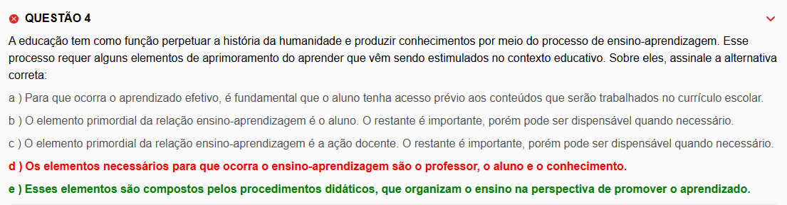 QUESTÃO 4 A educação tem como função perpetuar a história da humanidade e produzir conhecimentos por meio do processo de ensino-aprendizagem. Esse processo requer alguns elementos de aprimoramento do aprender que vêm sendo estimulados no contexto educativo. Sobre eles, assinale a alternativa correta: a) Para que ocorra O aprendizado efetivo, é fundamental que aluno tenha acesso prévio aos conteúdos que serão trabalhados no currículo escolar. b) O elemento primordial da relação ensino-aprendizagem é aluno. restante é importante, porém pode ser dispensável quando necessário. c) elemento primordial da relação ensino-aprendizagem é a ação docente. restante é importante, pode ser dispensável quando necessário. d) Os elementos necessários para que ocorra O ensino-aprendizagem são O professor, O aluno e O conhecimento. e ) Esses elementos são compostos pelos procedimentos didáticos, que organizam O ensino na perspectiva de promover aprendizado.