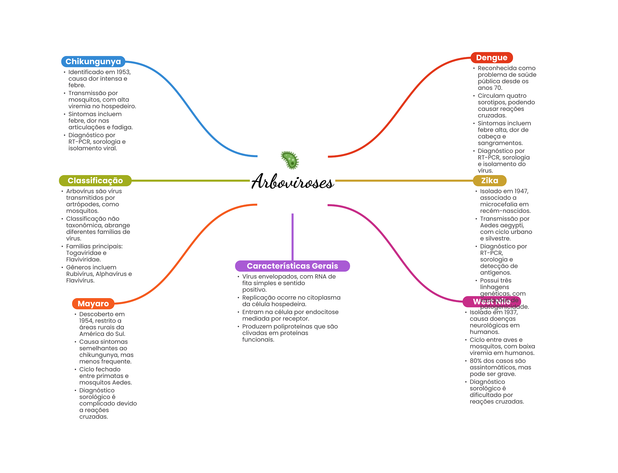 Chikungunya Dengue Reconhecida como Identificado em 1953, problema de saúde causa dor intensa e pública desde os febre. anos 70. Transmissão por Circulam quatro mosquitos, com alta sorotipos, podendo viremia no hospedeiro. causar reações Sintomas incluem cruzadas. febre, dor nas Sintomas incluem articulações e fadiga. febre alta, dor de Diagnóstico por cabeça e RT-PCR, sorologia e sangramentos. isolamento viral. Diagnóstico por RT-PCR, sorologia e isolamento do vírus. Classificação Arboviroses Zika Arbovírus são vírus Isolado em 1947, transmitidos por associado a artrópodes, como microcefalia em mosquitos. recém-nascidos. Classificação não Transmissão por taxonômica, abrange Aedes aegypti, diferentes famílias de com ciclo urbano vírus. e silvestre. Famílias principais: Diagnóstico por Togaviridae e RT-PCR, Flaviviridae. sorologia e Gêneros incluem Características Gerais detecção de Rubivírus, Alphavírus e antígenos. Vírus envelopados, com RNA de Flavivírus. fita simples e sentido Possui três positivo. linhagens genéticas, com Replicação ocorre no citoplasma Mayaro da célula hospedeira. West Nile de patogenicidade. Descoberto em Entram na célula por endocitose Isolado em 1937, 1954, restrito a mediada por receptor. causa doenças áreas rurais da Produzem poliproteínas que são neurológicas em América do Sul. clivadas em proteínas humanos. Causa sintomas funcionais. Ciclo entre aves e semelhantes ao mosquitos, com baixa chikungunya, mas viremia em humanos. menos frequente. 80% dos casos são Ciclo fechado assintomáticos, mas entre primatas e pode ser grave. mosquitos Aedes. Diagnóstico Diagnóstico sorológico é sorológico é dificultado por complicado devido reações cruzadas. a reações cruzadas.