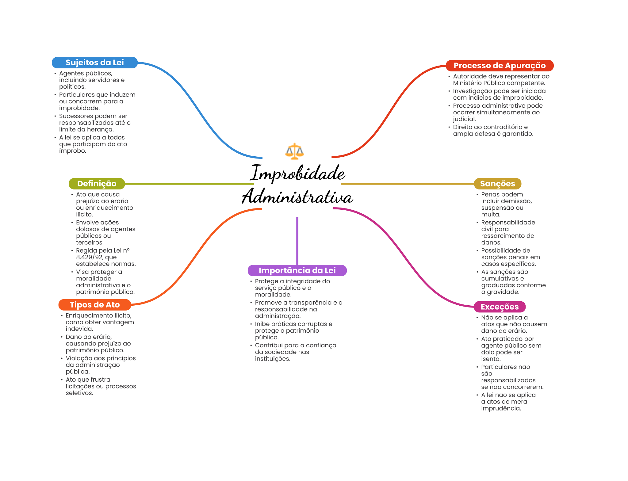 Sujeitos da Lei Processo de Apuração Agentes públicos, incluindo servidores e Autoridade deve representar ao Ministério Público competente. políticos. Investigação pode ser iniciada Particulares que induzem com indícios de improbidade. ou concorrem para a improbidade. Processo administrativo pode ocorrer simultaneamente ao Sucessores podem ser responsabilizados até judicial. limite da herança. Direito ao contraditório e A lei se aplica a todos ampla defesa é garantido. que participam do ato improbo. Improbidade Definição Sanções Ato que causa Administrativa Penas podem prejuízo ao erário incluir demissão, ou enriquecimento suspensão ou ilícito. multa. Envolve ações Responsabilidade dolosas de agentes civil para públicos ou ressarcimento de terceiros. danos. Regida pela Lei n° Possibilidade de 8.429/92, que sanções penais em estabelece normas. casos específicos. Visa proteger a Importância da Lei As sanções são moralidade Protege a integridade do cumulativas e administrativa e serviço público e a graduadas conforme patrimônio público. moralidade. a gravidade. Tipos de Ato Promove a transparência e a responsabilidade na Exceções Enriquecimento ilícito, administração. Não se aplica a como obter vantagem Inibe práticas corruptas e atos que não causem indevida. protege patrimônio dano ao erário. Dano ao erário, público. Ato praticado por causando prejuízo ao Contribui para a confiança agente público sem patrimônio público. da sociedade nas dolo pode ser Violação aos princípios instituições. isento. da administração Particulares não pública. são Ato que frustra responsabilizados licitações ou processos se não concorrerem. seletivos. A lei não se aplica a atos de mera imprudência.