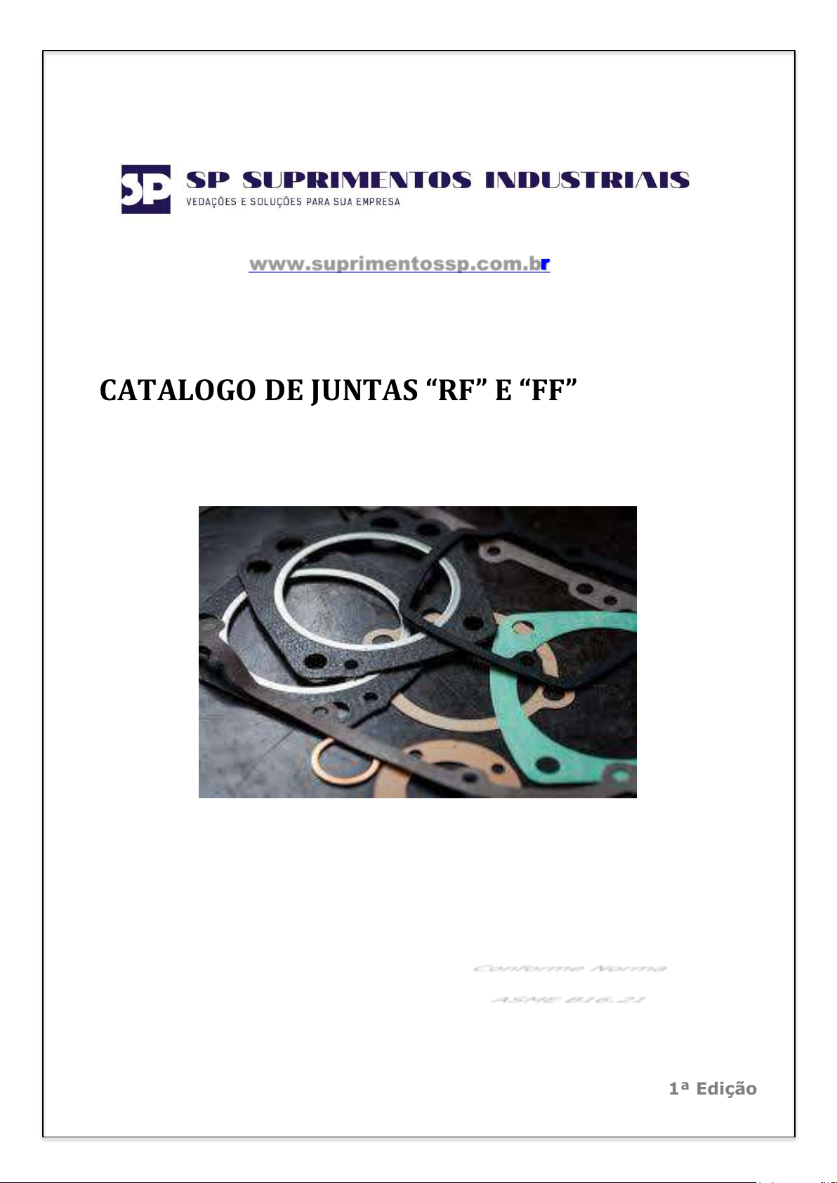 1ª Edição CATALOGO DE JUNTAS “RF” E “FF” Conforme Norma ASME B16.21 www.suprimentossp.com.br http://www.suprimentossp.com.br/ 1 1ª EDIÇÃO, JANEIRO DE 2021 1ª EDIÇÃO, JANEIRO DE 2021 Apresentação da Empresa A SP SUPRIMENTOS INDUSTRIAIS atua no mercado de suprimentos industriais, fornecendo produtos e serviços para manutenção industrial e linha produtiva. O nosso diferencial está na parceria, suporte técnico e logística que estão preparados para proporcionar um atendimento com rapidez e competência. Contato Website: www.suprimentossp.com.br E-mail: contato@suprimentossp.com.br Fone: (11) 4307-4007 Rua Dona Dica, 1067 – CEP: 07052-000 Jd. Tranquilidade Guarulhos – SP 2 1ª EDIÇÃO, JANEIRO DE 2021 1ª EDIÇÃO, JANEIRO DE 2021 Visão Fundada em 2020 por profissionais reconhecidos há mais de 20 anos no mercado com a visão de parceria para solução dos problemas de nossos clientes. Missão Nosso compromisso é com a satisfação de nossos clientes, baseados em relacionamento com parceria e confiabilidade. Objetivo Especializar, investir e entender as soluções que atendam nossos clientes de maneira ágil e justa para manutenção de equipamentos com entregas rápidas e produtos com qualidade 3 1ª EDIÇÃO, JANEIRO DE 2021 1ª EDIÇÃO, JANEIRO DE 2021 Sumário Juntas Circulares “RF ou FF”, Modelos (Norma ASME B16.21) ........................... 4 Dimensional das Juntas Circulares (Norma ASME B16.21) ................................ 4 Modelo RF Junta Circular (Norma ASME B16.21) ............................................. 4 Modelo FF Junta Circular (Norma ASME B16.21) ............................................. 5 Tabela de Dimensional de Juntas Circulares FF (Norma ASME B16.21) ............... 6 Tabela de Dimensional de Juntas Circulares FF (Norma ASME B16.21) ............... 8 Matéria Prima para as Juntas Circulares (Norma ASME B16.21) ....................... 14 4 1ª EDIÇÃO, JANEIRO DE 2021 1ª EDIÇÃO, JANEIRO DE 2021 Junta (FF) ou (RF) Junta FF ou RF: As juntas servem para vedar Flanges de tubulações de Gás, Óleo e Petróleo. Matéria Prima: As Juntas podem ser fabricadas com Papelão Hidráulico, Grafite puro ou com inserção de chapa de Inox, PTFE, Cortiça, Borracha ou outros materiais que o cliente desejar, ver página 14. Dimensional: As juntas são fabricadas conforme dimensional especificado pela norma ASME B16.21, que é determinado pela Pressão em Libra (#) e pelo Diâmetro Nominal em polegada da Flange (DN), fabricamos também com outros dimensionais especificado pelo cliente ou por amostras disponibilizadas pelo cliente. Observação: A espessura da junta é determinada pelo tipo de matéria prima conforme espessura padrão de mercado da matéria prima utilizada a ser utilizada e/ou pelo cliente quando for possível atender a espessura desejada. Modelo: As juntas possuem os seguintes modelos; o Junta (RF): Junta para flange com Ressalto (Flat Ring), este modelo contém diâmetro externo (ØE) e diâmetro interno (ØI) não contendo furos, que pode ser diferente para cada tipo de pressão ou polegada. A baixo temos um modelo representando uma junta sem os furos. Alojamento 5 1ª EDIÇÃO, JANEIRO DE 2021 1ª EDIÇÃO, JANEIRO DE 2021 o Junta (FF): Junta para flange com Face Plana (Full Face), este modelo contém diâmetro externo (ØE), diâmetro interno (ØI), diâmetro de centro dos furos (ØCF), diâmetro do furo (ØF) e a quantidade de furos (QF), que pode ser diferente para cada tipo de pressão ou polegada. A baixo temos um modelo representando uma junta com o (QF) igual a 6 furos. Alojamento 6 1ª EDIÇÃO, JANEIRO DE 2021 1ª EDIÇÃO, JANEIRO DE 2021 Norma Serie Polegada (DN) Pressão Libra (#) ØI Tol.ØI ØE Tol.ØE ØCF Tol.ØCF ØF Tol.ØF QF ASME B16.21 -- DN 1/4" 150# 14,00 ± 1,50 64,00 -1,50 42,90 ± 1,50 11,11 ± 0,50 4 ASME B16.21 -- DN 3/8" 150# 17,00 ± 1,50 64,00 -1,50 42,90 ± 1,50 11,11 ± 0,50 4 ASME B16.21 -- DN 1/2" 150# 21,00 ± 1,50 89,00 -1,50 60,30 ± 1,50 15,87 ± 0,50 4 ASME B16.21 -- DN 1/2" 300# 21,00 ± 1,50 95,00 -1,50 66,70 ± 1,50 15,87 ± 0,50 4 ASME B16.21 -- DN 3/4" 150# 27,00 ± 1,50 98,00 -1,50 69,90 ± 1,50 15,87 ± 0,50 4 ASME B16.21 -- DN 3/4" 300# 27,00 ± 1,50 117,00 -1,50 82,60 ± 1,50 19,05 ± 0,50 4 ASME B16.21 -- DN 1" 125# 33,00 ± 1,50 108,00 -1,50 79,40 ± 1,50 15,87 ± 0,50 4 ASME B16.21 -- DN 1" 150# 33,00 ± 1,50 108,00 -1,50 79,40 ± 1,50 15,87 ± 0,50 4 ASME B16.21 -- DN 1" 300# 33,00 ± 1,50 124,00 -1,50 88,90 ± 1,50 19,05 ± 0,50 4 ASME B16.21 -- DN 1.1/2" 125# 49,00 ± 1,50 127,00 -1,50 98,40 ± 1,50 15,87 ± 0,50 4 ASME B16.21 -- DN 1.1/2" 150# 48,00 ± 1,50 127,00 -1,50 98,40 ± 1,50 15,87 ± 0,50 4 ASME B16.21 -- DN 1.1/2" 300# 48,00 ± 1,50 156,00 -1,50 114,30 ± 1,50 22,22 ± 0,50 4 ASME B16.21 -- DN 1.1/4" 125# 42,00 ± 1,50 117,00 -1,50 88,90 ± 1,50 15,87 ± 0,50 4 ASME B16.21 -- DN 1.1/4" 150# 42,00 ± 1,50 117,00 -1,50 88,90 ± 1,50 15,87 ± 0,50 4 ASME B16.21 -- DN 1.1/4" 300# 42,00 ± 1,50 133,00 -1,50 98,40 ± 1,50 19,05 ± 0,50 4 ASME B16.21 -- DN 2" 125# 60,00 ± 1,50 152,00 -1,50 120,70 ± 1,50 19,05 ± 0,50 4 ASME B16.21 -- DN 2" 150# 60,00 ± 1,50 152,00 -1,50 120,70 ± 1,50 19,05 ± 0,50 4 ASME B16.21 -- DN 2" 300# 60,00 ± 1,50 165,00 -1,50 127,00 ± 1,50 19,05 ± 0,50 8 ASME B16.21 -- DN 2.1/2" 125# 73,00 ± 1,50 178,00 -1,50 139,70 ± 1,50 19,05 ± 0,50 4 ASME B16.21 -- DN 2.1/2" 150# 73,00 ± 1,50 178,00 -1,50 139,70 ± 1,50 19,05 ± 0,50 4 ASME B16.21 -- DN 2.1/2" 300# 73,00 ± 1,50 191,00 -1,50 149,20 ± 1,50 22,22 ± 0,50 8 ASME B16.21 -- DN 3" 125# 89,00 ± 1,50 191,00 -1,50 152,40 ± 1,50 19,05 ± 0,50 4 ASME B16.21 -- DN 3" 150# 89,00 ± 1,50 191,00 -1,50 152,40 ± 1,50 19,05 ± 0,50 4 ASME B16.21 -- DN 3" 300# 89,00 ± 1,50 210,00 -1,50 168,30 ± 1,50 22,22 ± 0,50 8 ASME B16.21 -- DN 3.1/2" 125# 102,00 ± 1,50 216,00 -1,50 177,80 ± 1,50 19,05 ± 0,50 8 ASME B16.21 -- DN 3.1/2" 150# 102,00 ± 1,50 216,00 -1,50 177,80 ± 1,50 19,05 