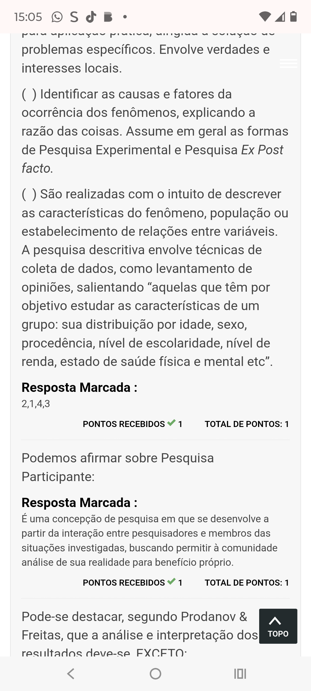 15:05 S problemas específicos. Envolve verdades e interesses locais. Identificar as causas e fatores da ocorrência dos fenômenos, explicando a razão das coisas. Assume em geral as formas de Pesquisa Experimental e Pesquisa Ex Post facto. São realizadas com intuito de descrever as características do fenômeno, população ou estabelecimento de relações entre variáveis. A pesquisa descritiva envolve técnicas de coleta de dados, como levantamento de opiniões, salientando "aquelas que têm por objetivo estudar as características de um grupo: sua distribuição por idade, sexo, procedência, nível de escolaridade, nível de renda, estado de saúde física e mental etc". Resposta Marcada : 2,1,4,3 PONTOS RECEBIDOS 1 TOTAL DE PONTOS: 1 Podemos afirmar sobre Pesquisa Participante: Resposta Marcada : É uma concepção de pesquisa em que se desenvolve a partir da interação entre pesquisadores e membros das situações investigadas, buscando permitir à comunidade análise de sua realidade para benefício próprio. PONTOS RECEBIDOS 1 TOTAL DE PONTOS: 1 Pode-se destacar, segundo Prodanov & Freitas, que a análise e interpretação dos TOPO resultados deve-se EXCETO: