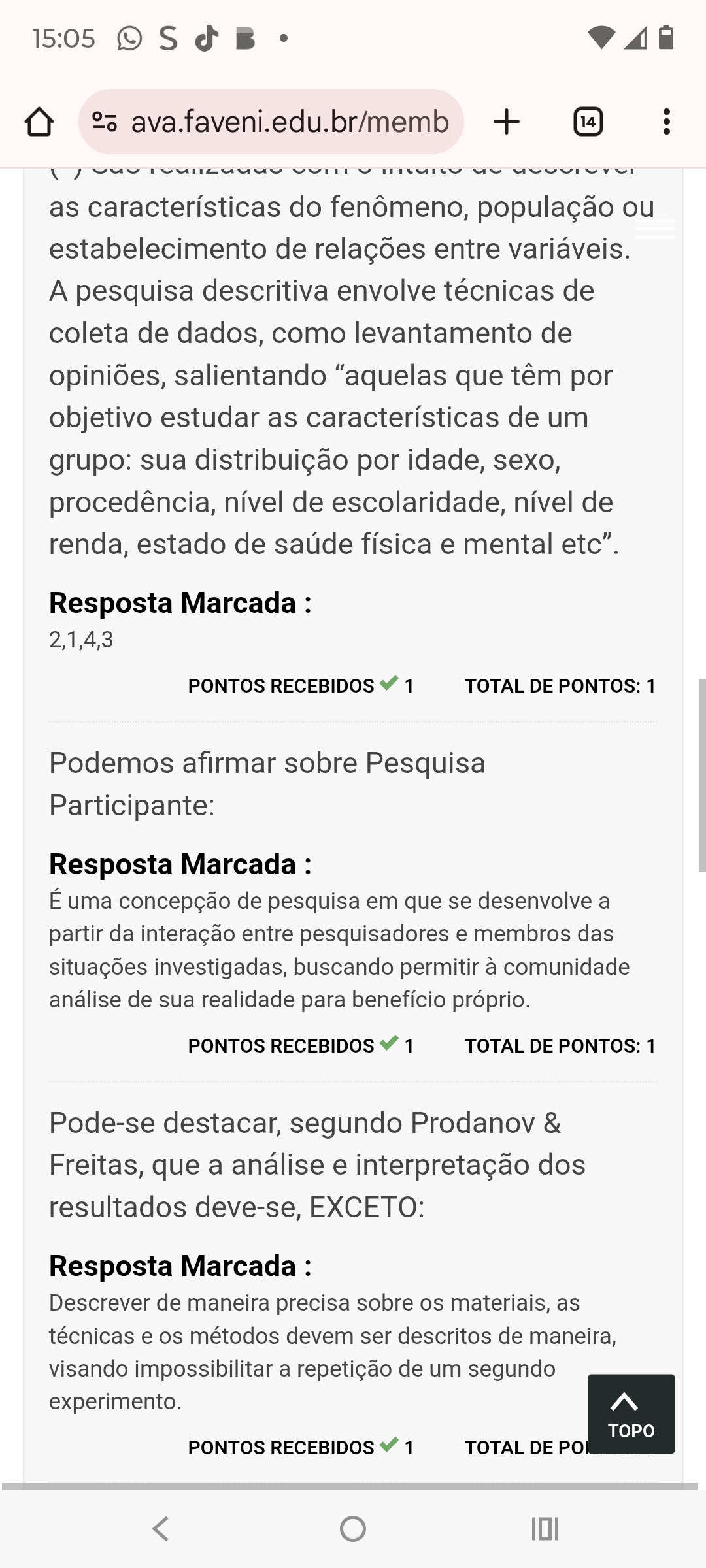 15:05 S ava.faveni.edu.br/memb + 14 as características do fenômeno, população ou estabelecimento de relações entre variáveis. A pesquisa descritiva envolve técnicas de coleta de dados, como levantamento de opiniões, salientando "aquelas que têm por objetivo estudar as características de um grupo: sua distribuição por idade, sexo, procedência, nível de escolaridade, nível de renda, estado de saúde física e mental etc". Resposta Marcada : 2,1,4,3 PONTOS RECEBIDOS 1 TOTAL DE PONTOS: 1 Podemos afirmar sobre Pesquisa Participante: Resposta Marcada : É uma concepção de pesquisa em que se desenvolve a partir da interação entre pesquisadores e membros das situações investigadas, buscando permitir à comunidade análise de sua realidade para benefício próprio. PONTOS RECEBIDOS 1 TOTAL DE PONTOS: 1 Pode-se destacar, segundo Prodanov & Freitas, que a análise e interpretação dos resultados deve-se, EXCETO: Resposta Marcada : Descrever de maneira precisa sobre os materiais, as técnicas e os métodos devem ser descritos de maneira, visando impossibilitar a repetição de um segundo experimento. TOPO PONTOS RECEBIDOS 1 TOTAL DE PO